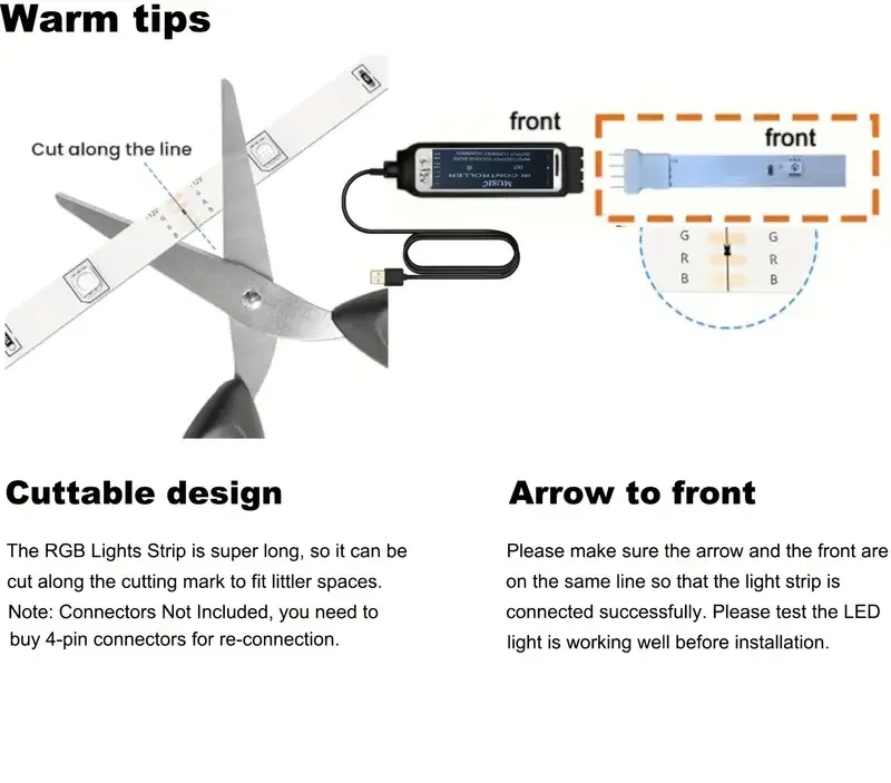 1. Light strip must be used under 5v,Please ensure that the adhesive surface is smooth, and make sure the surface clean, flat and dry before sticking the light strips.