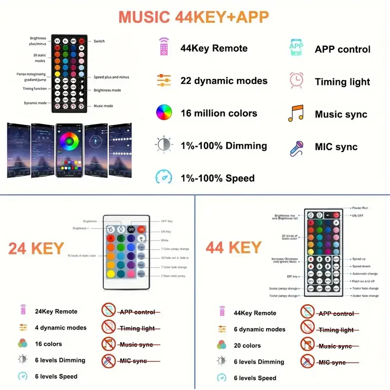 【Smart app control and IR remote control】: The 100Ft led strip lights support both app and 24key/44key IR remote for control, which allow you change the led lights color and modes are conveniently for bedroom