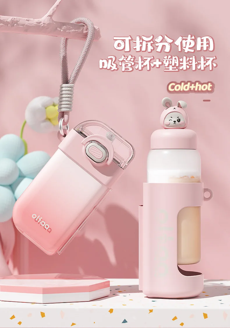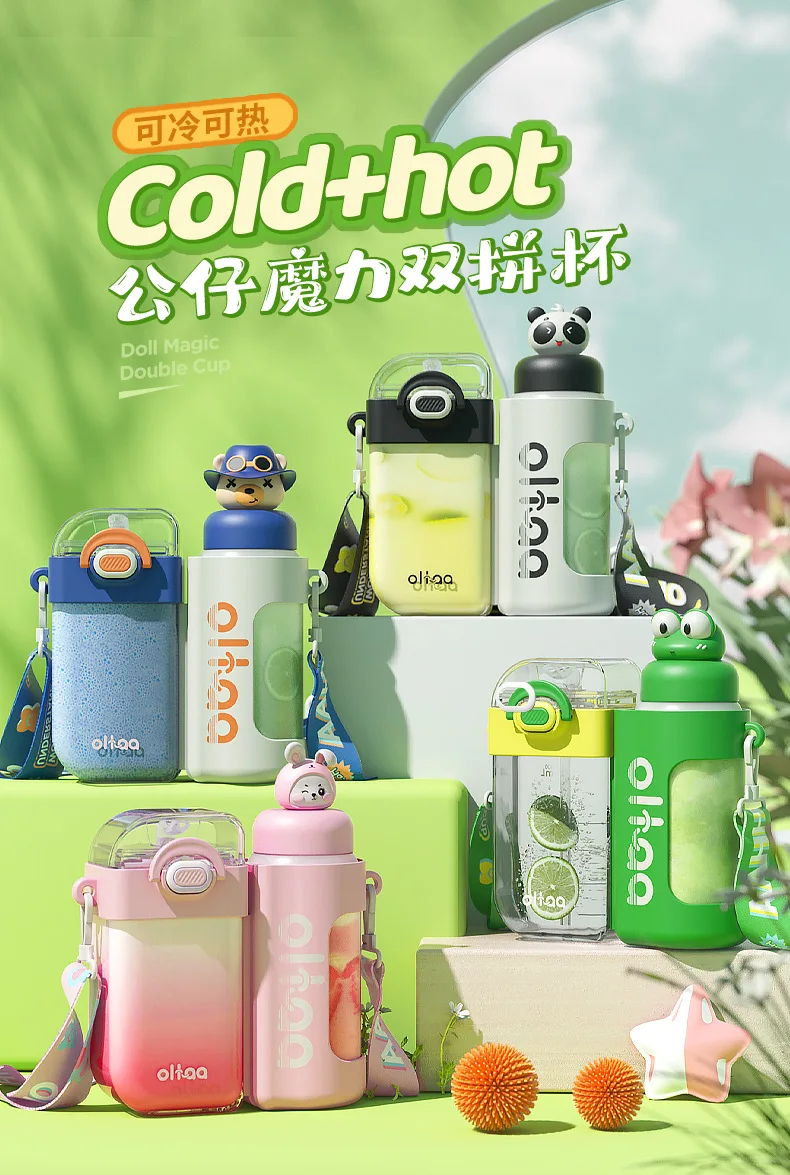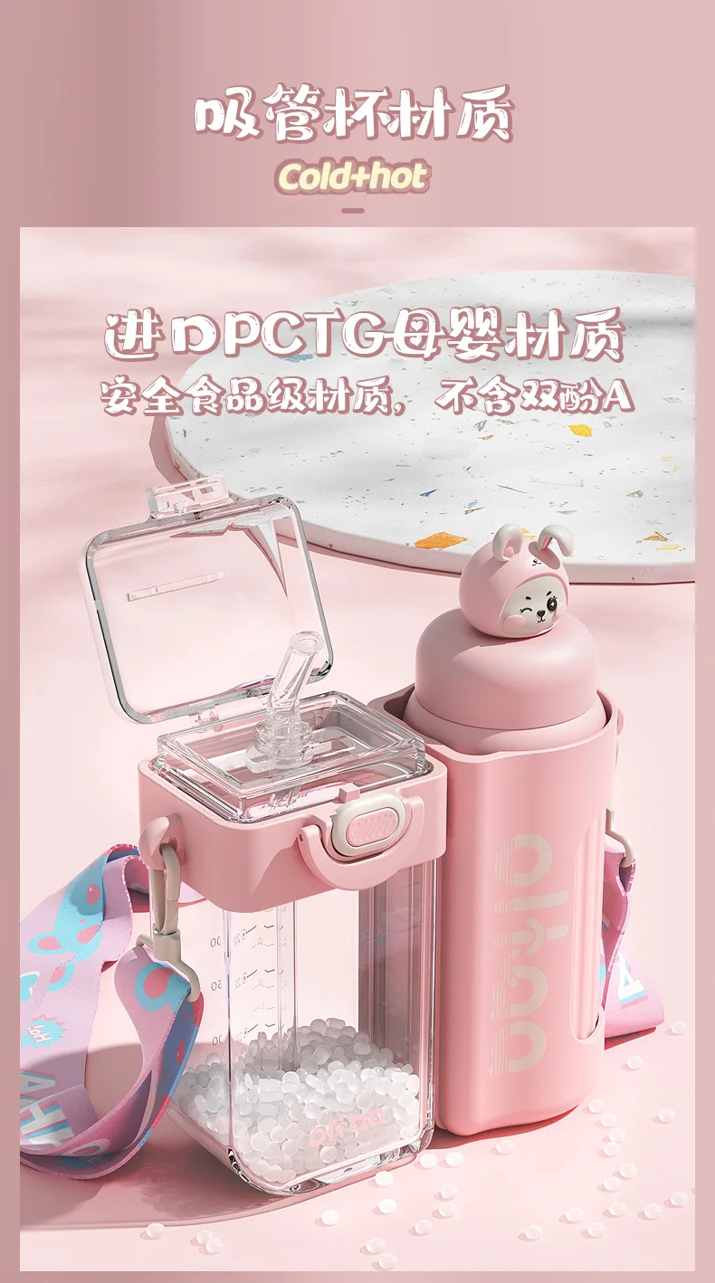 2 in 1 Cute Children Double Drinking Water Bottle for kids w/ Straw Portable Bottle Student Couple Plastic Cup Gift School Kids
