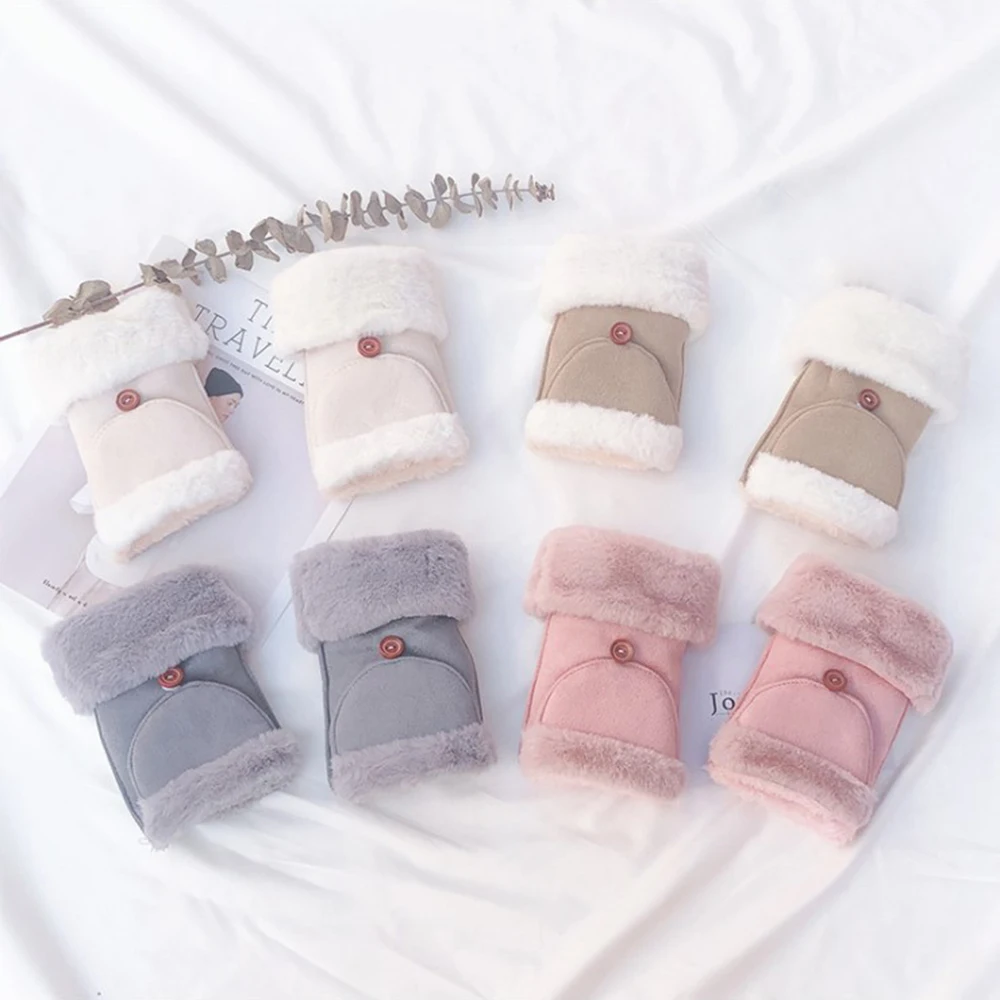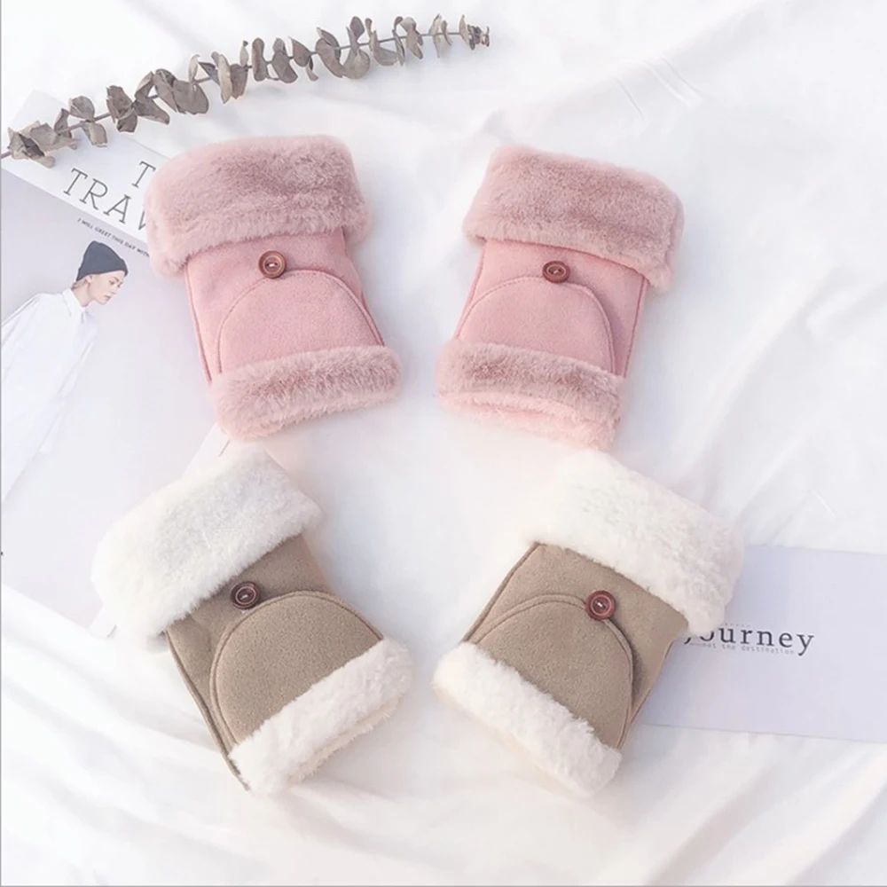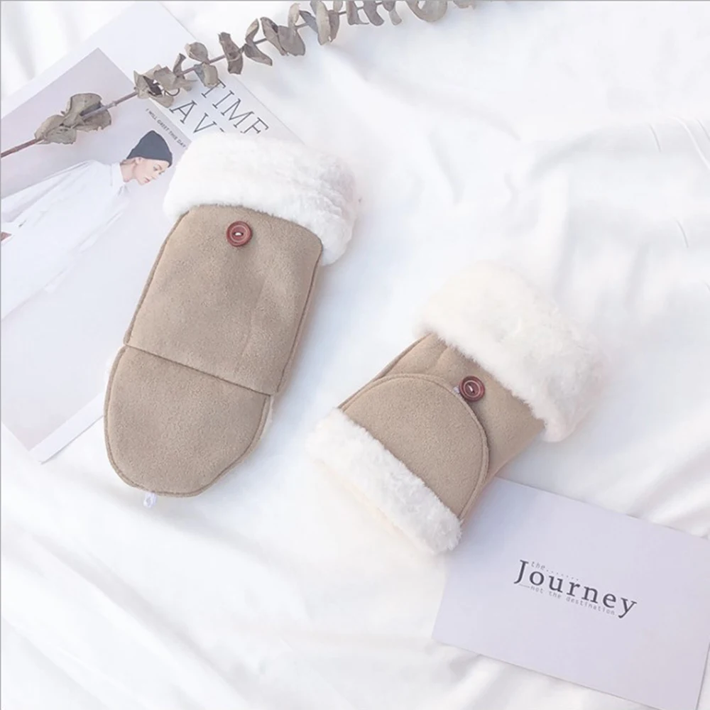 2019 Fashion Women Fingerless Flip Gloves Synthetic Suede Rabbit Hair Flip Dual-Use Student Warm Plus Velvet Riding Gloves