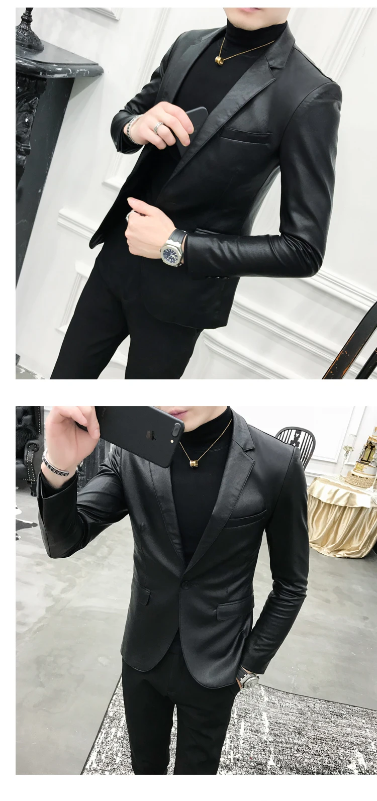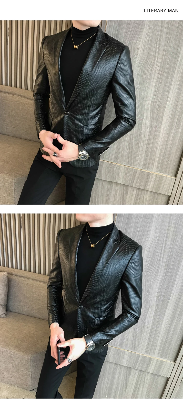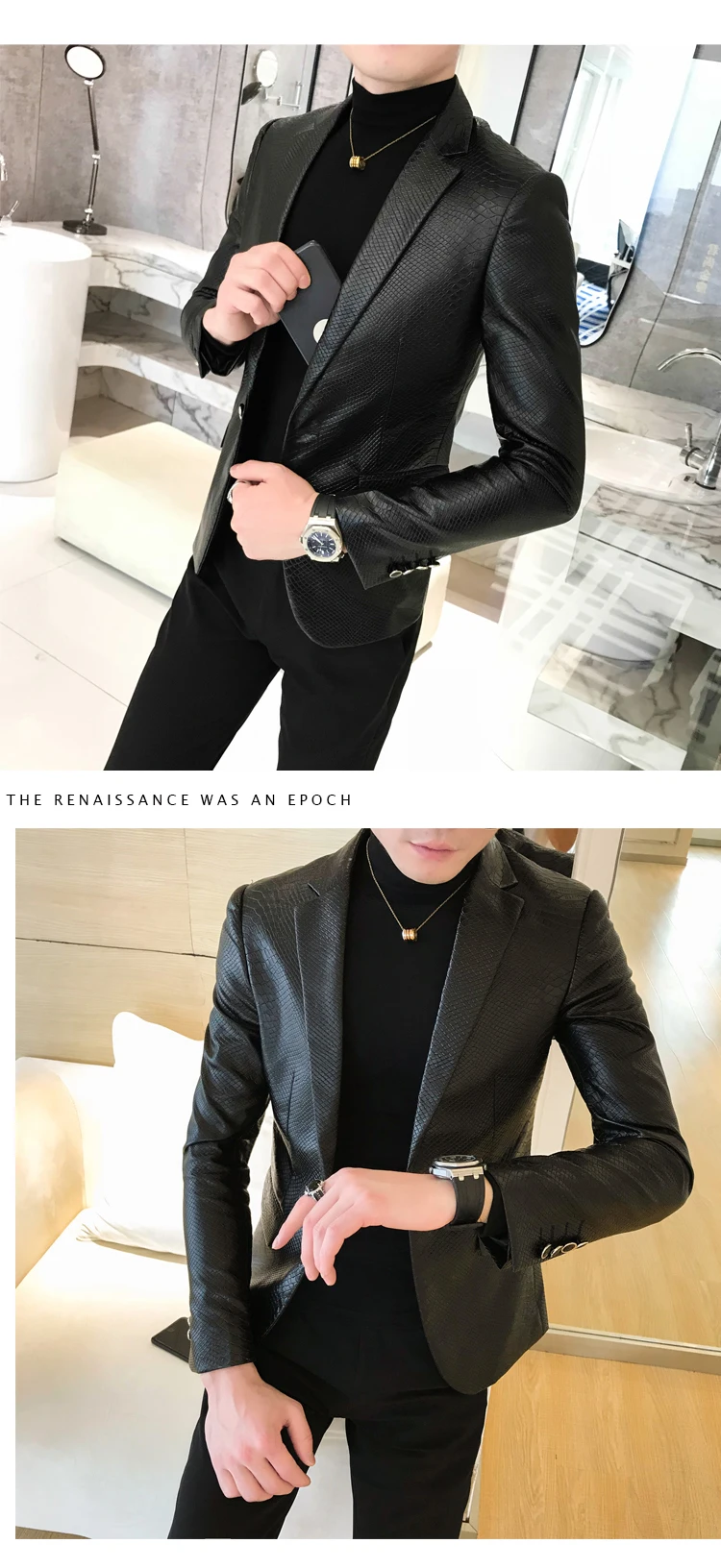 2019 New Single Buckle PU Leather Blazer fashion classic snake pattern slim suit jacket Masculino black retro prom pioneer men