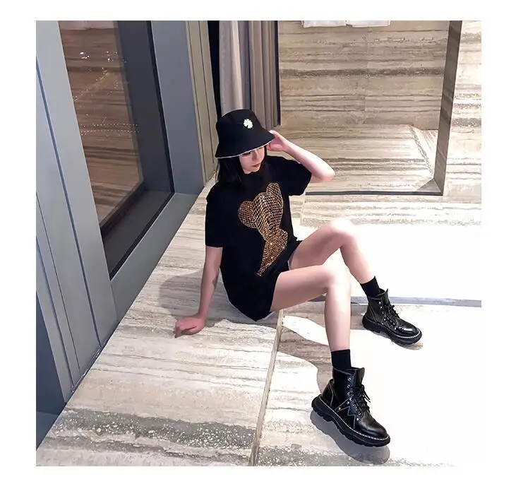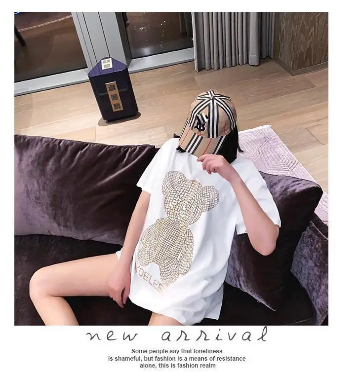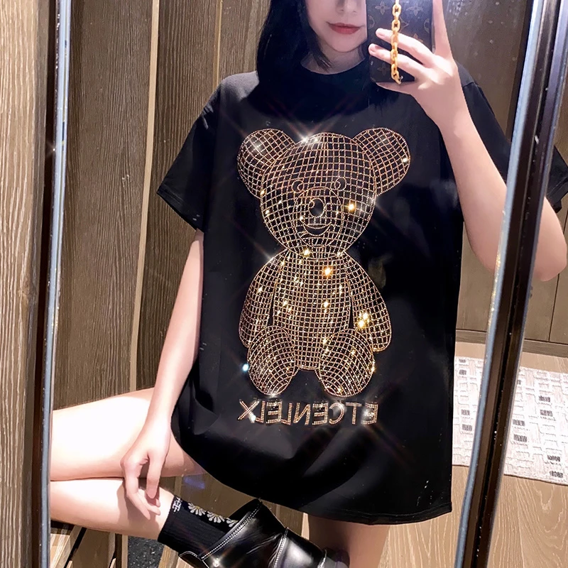 2020 Beading Bear Women T-shirt Harajuku Oversize Short-Sleeved HIp Hop Women Cotton Loose Crystal Maxi Korean Female Clothes