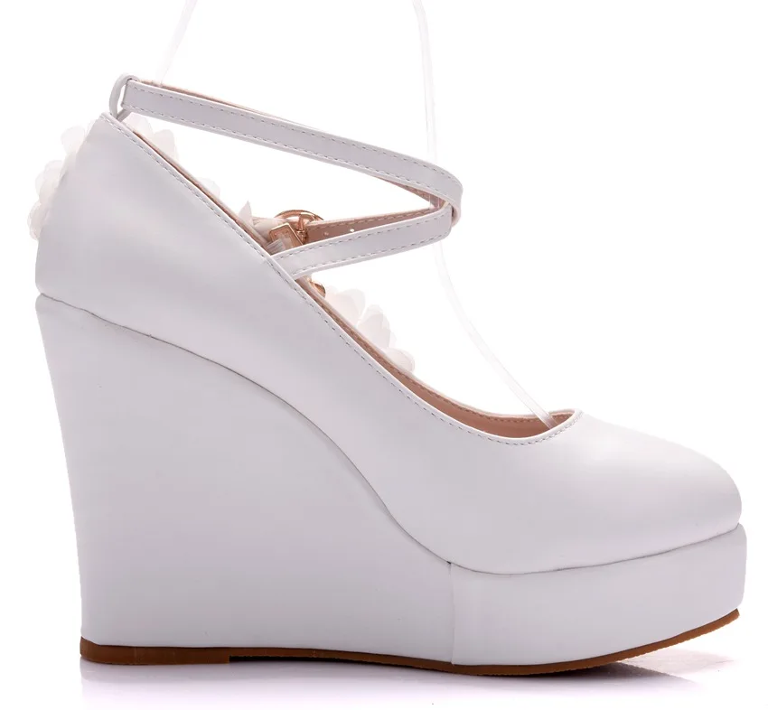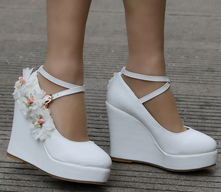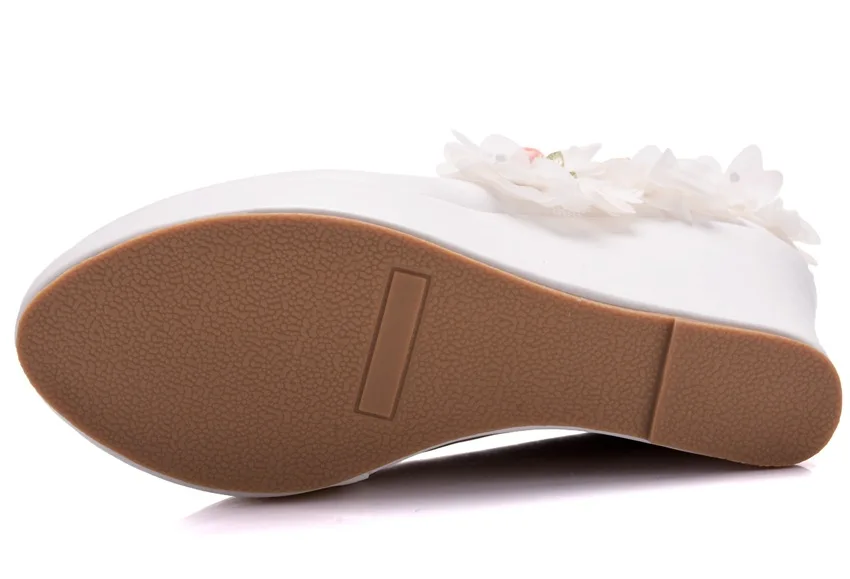 2020 new White Wedges Wedding Pumps Sweet White Flower Lace Pearl Platform Pump Shoes Bride Dress High Heels W13