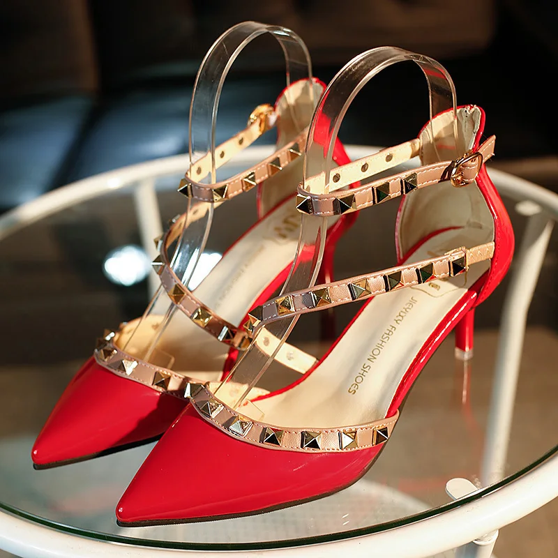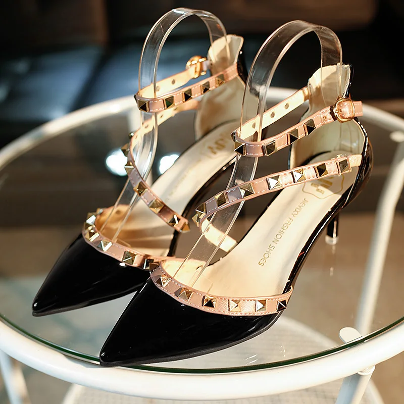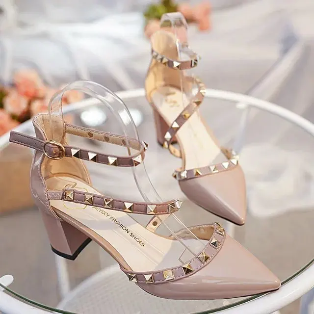 2020 Summer Pointed Toe Party Sandals Women Pumps Sexy Rivet Square Heel High Heel Shoes Woman Ankle Strap Shoes Zapatos Mujer