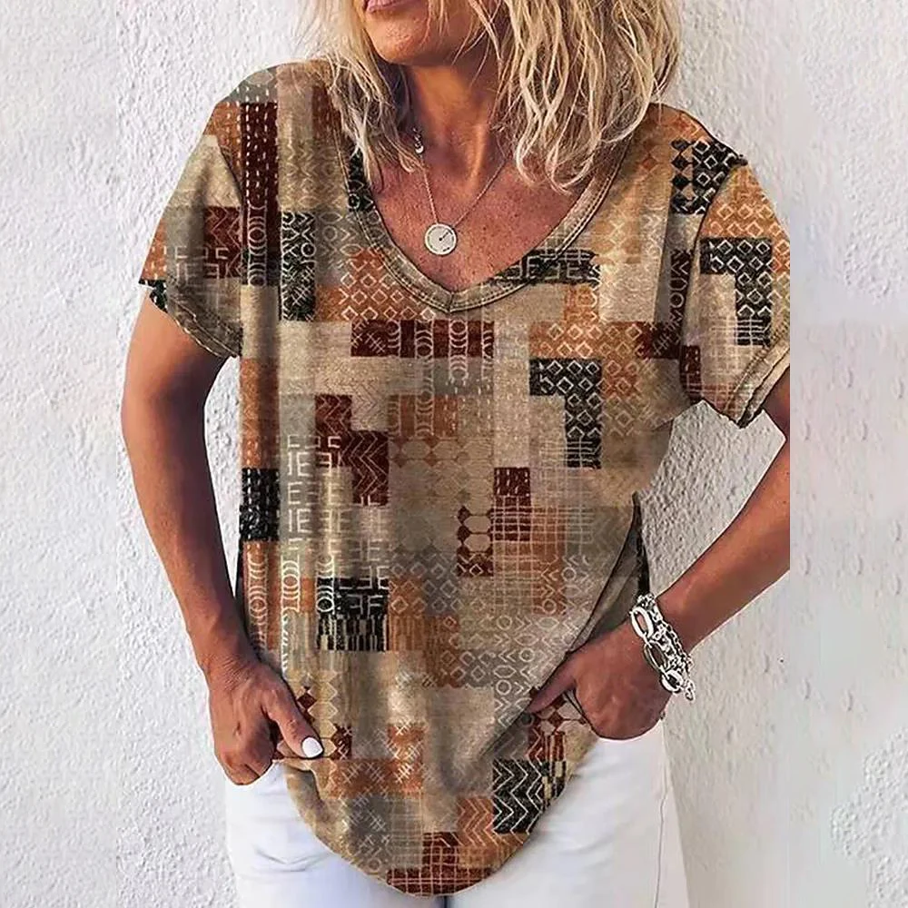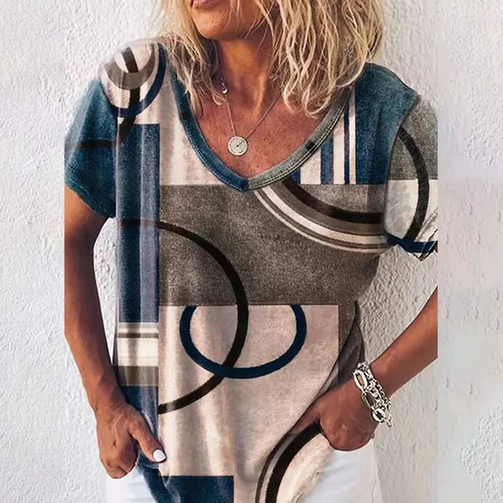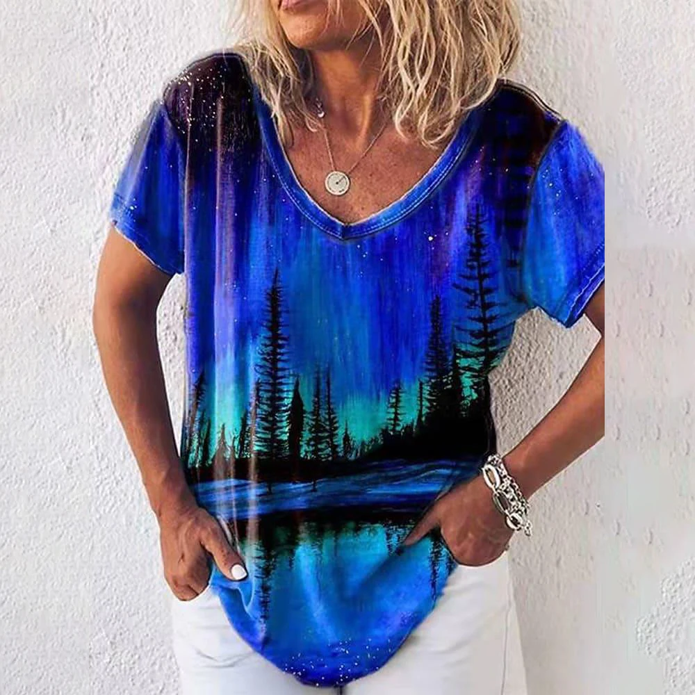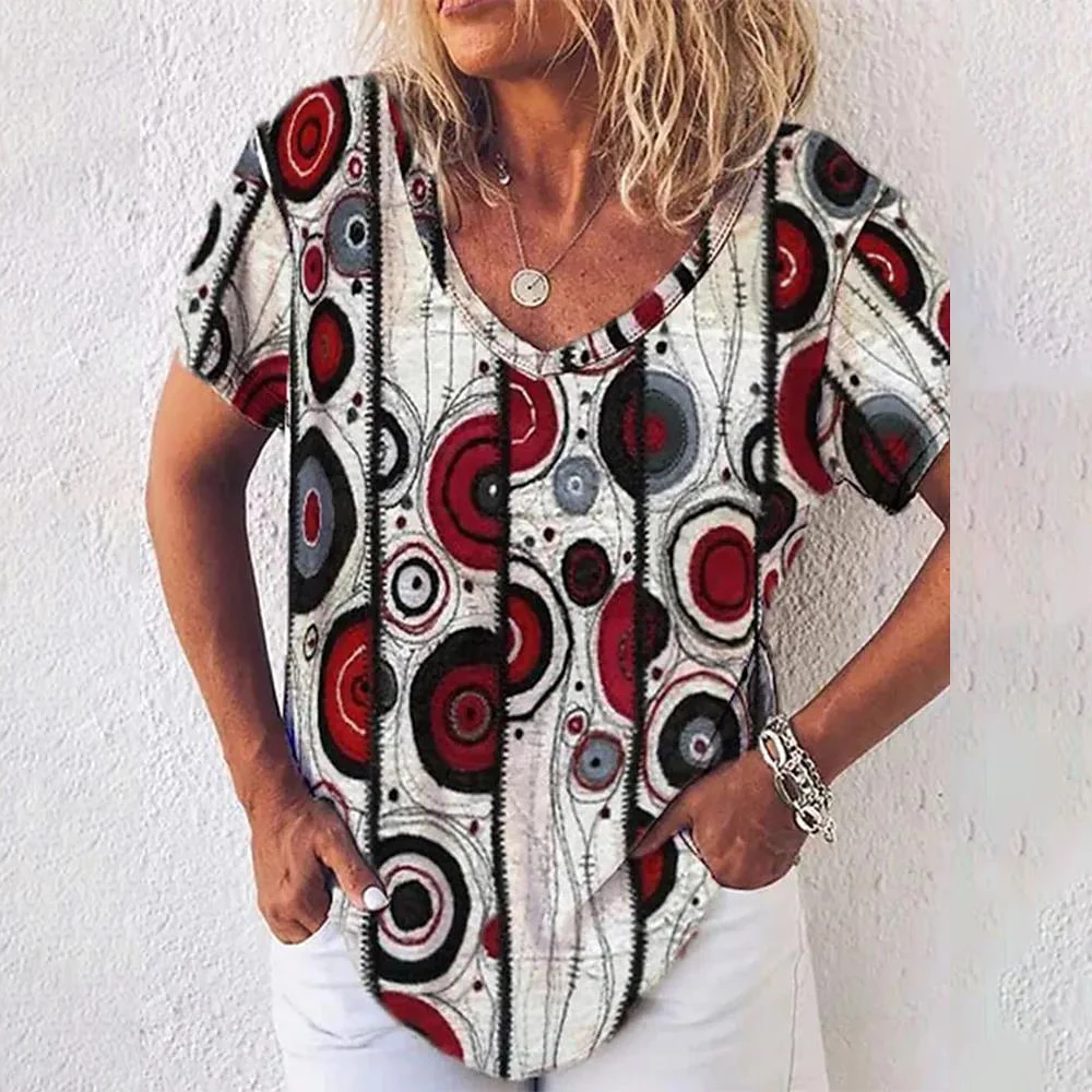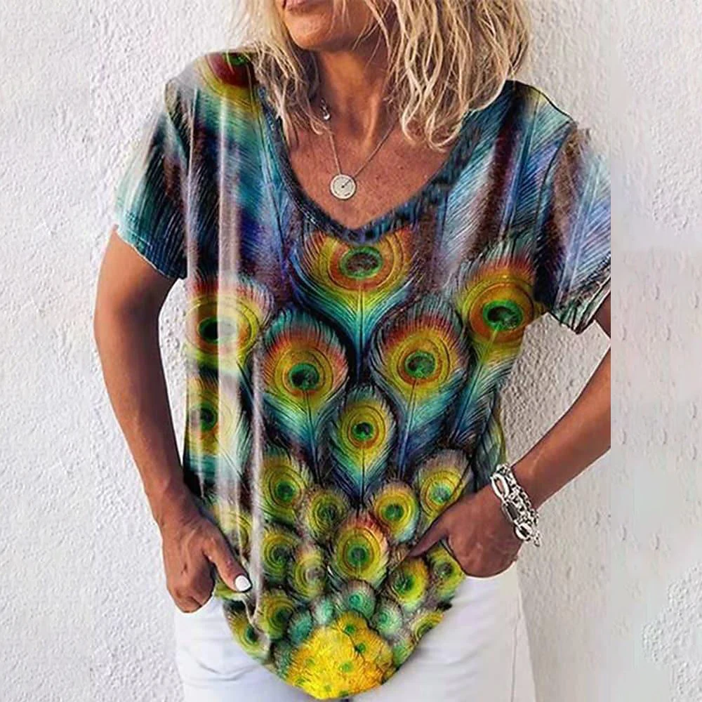 New Summer Women's 3d Print Painting T Shirt Casual Loose Colorblock Print V Neck Basic Top Shirt Pullover Female Clothing