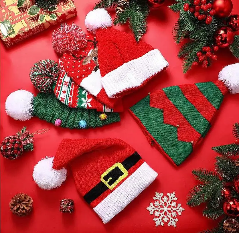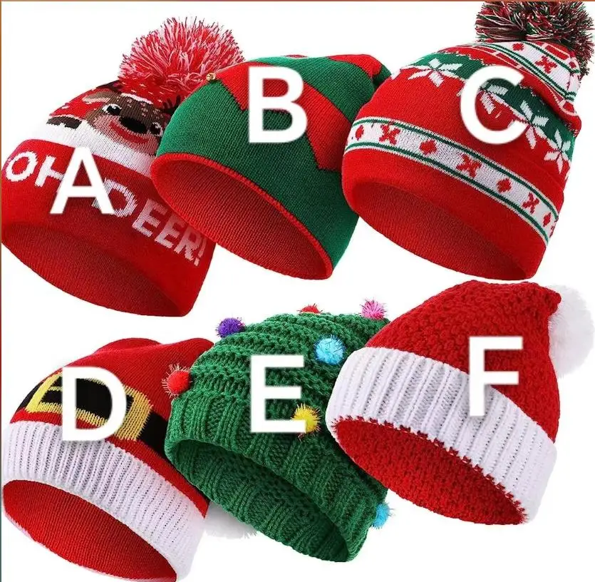 20pcs Christmas Knitted Hat Xmas Reindeer Santa Snowflake Pompom Beanie Red Green Crochet Tree Cap For New Year Party Adult Kids
