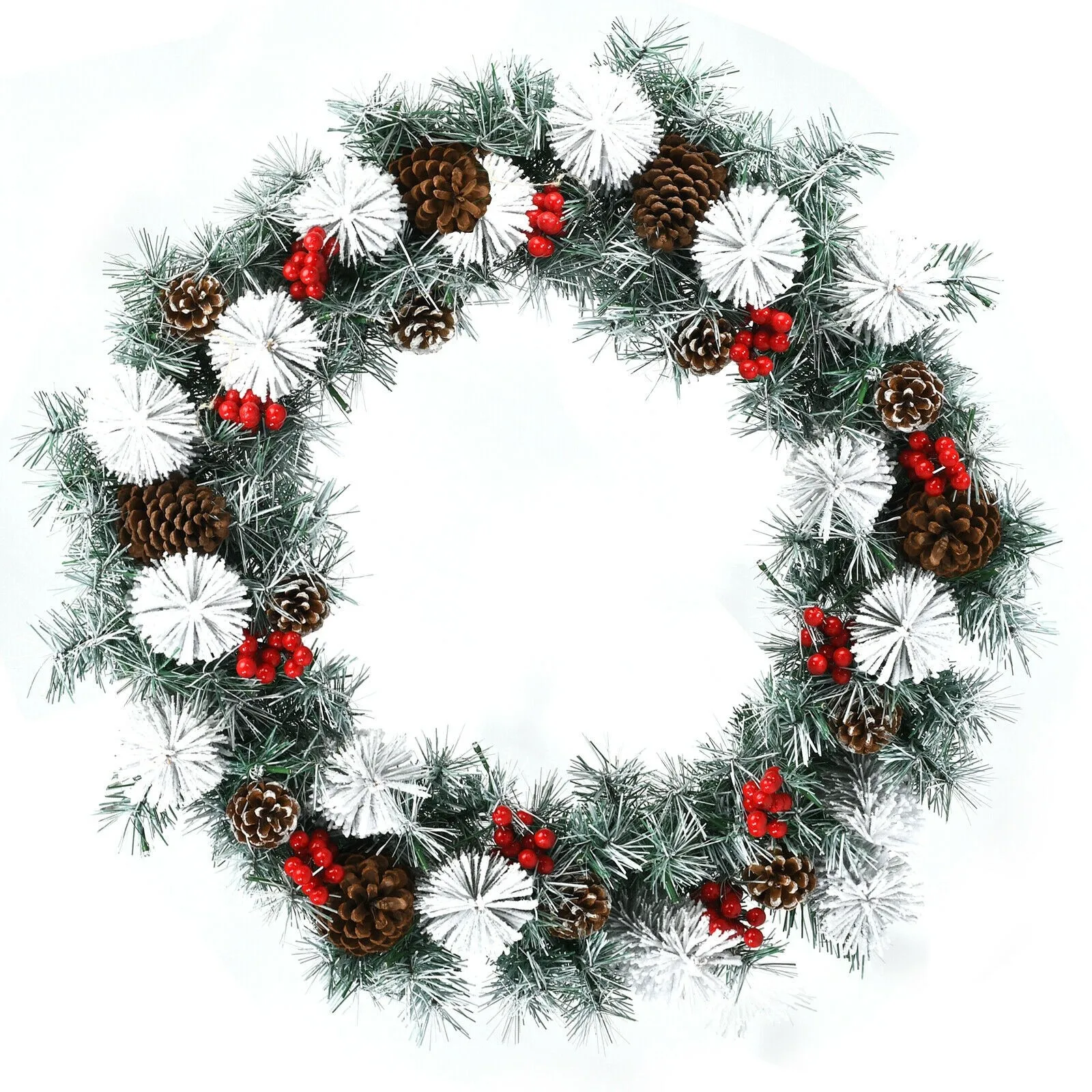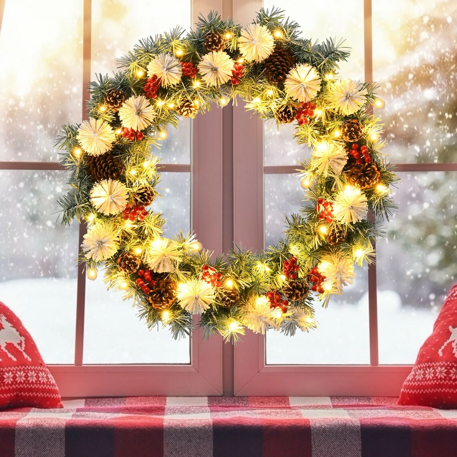 30-Inch Pre-lit Flocked Artificial Christmas Wreath with Mixed Decorations 50 LED Lights Christmas Pendant Festival Wreath
