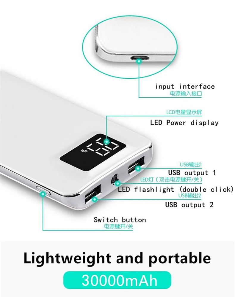30000mah Power Bank For XiaomiMi 2 USB PowerBank Portable Charger External Battery Poverbank For iPhone7 8 X XS SamsungN9 N8