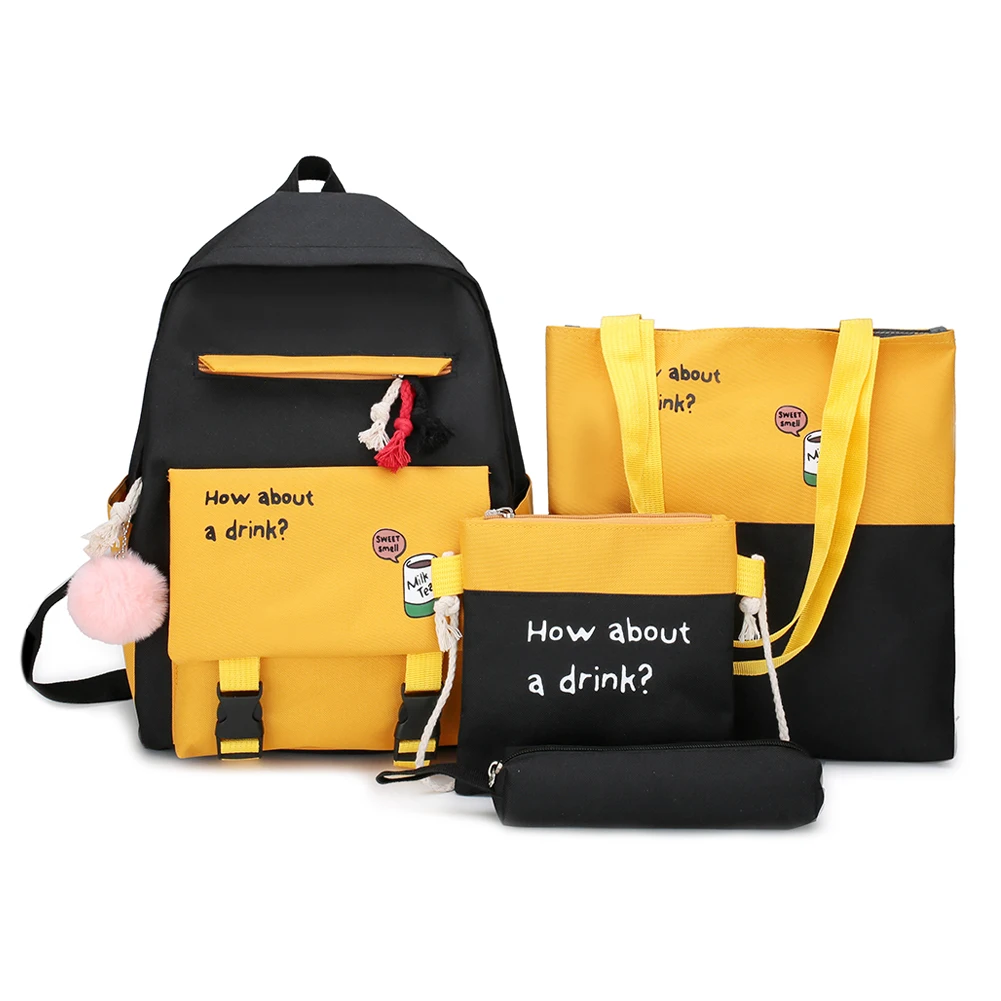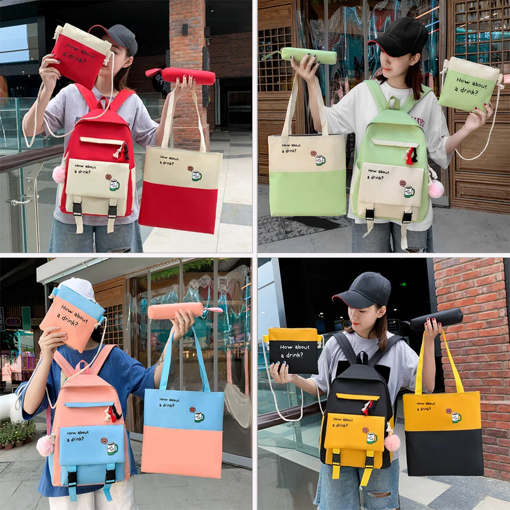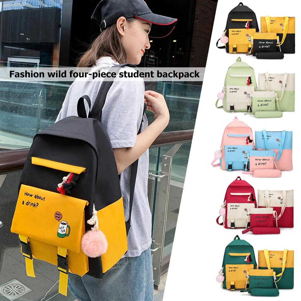 4pcs/set Creative Design Canvas School Backpacks Classic Texture Chic Student Hit Color Shoulder Messenger Clutch Bag