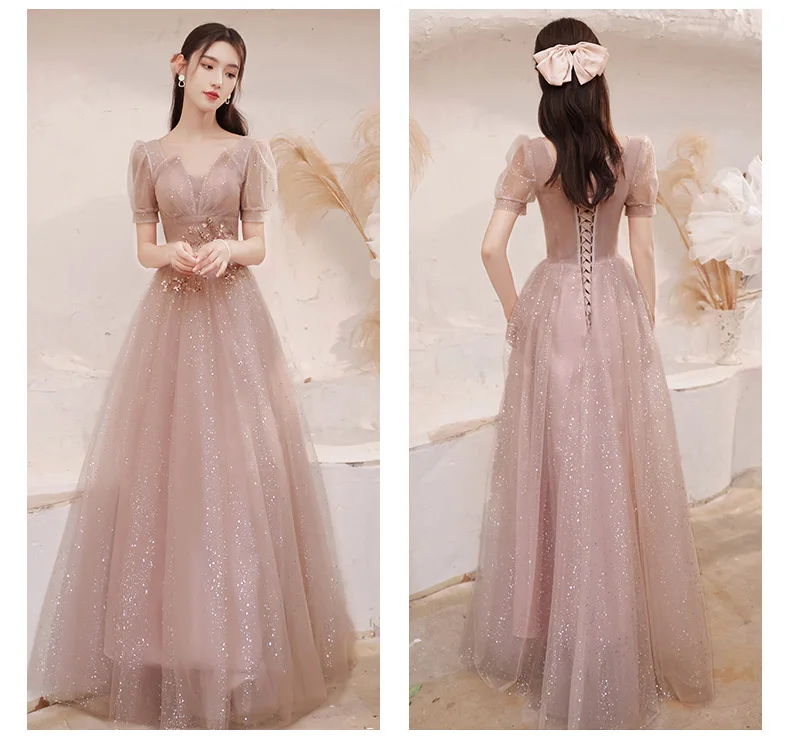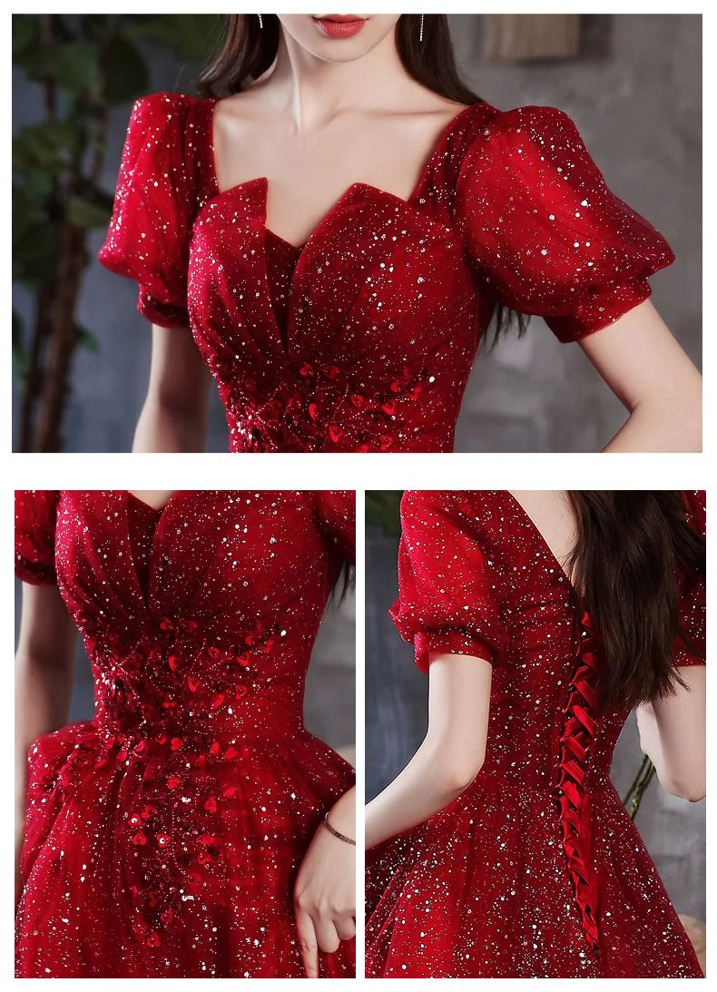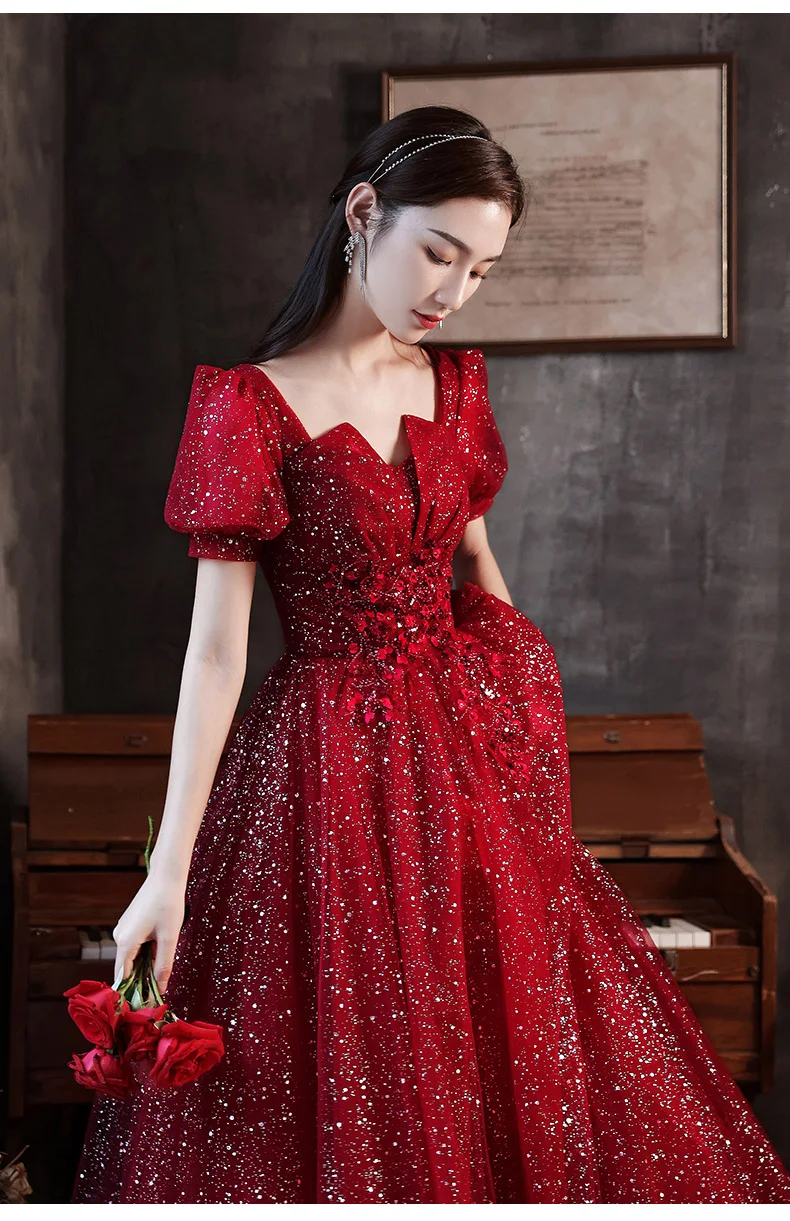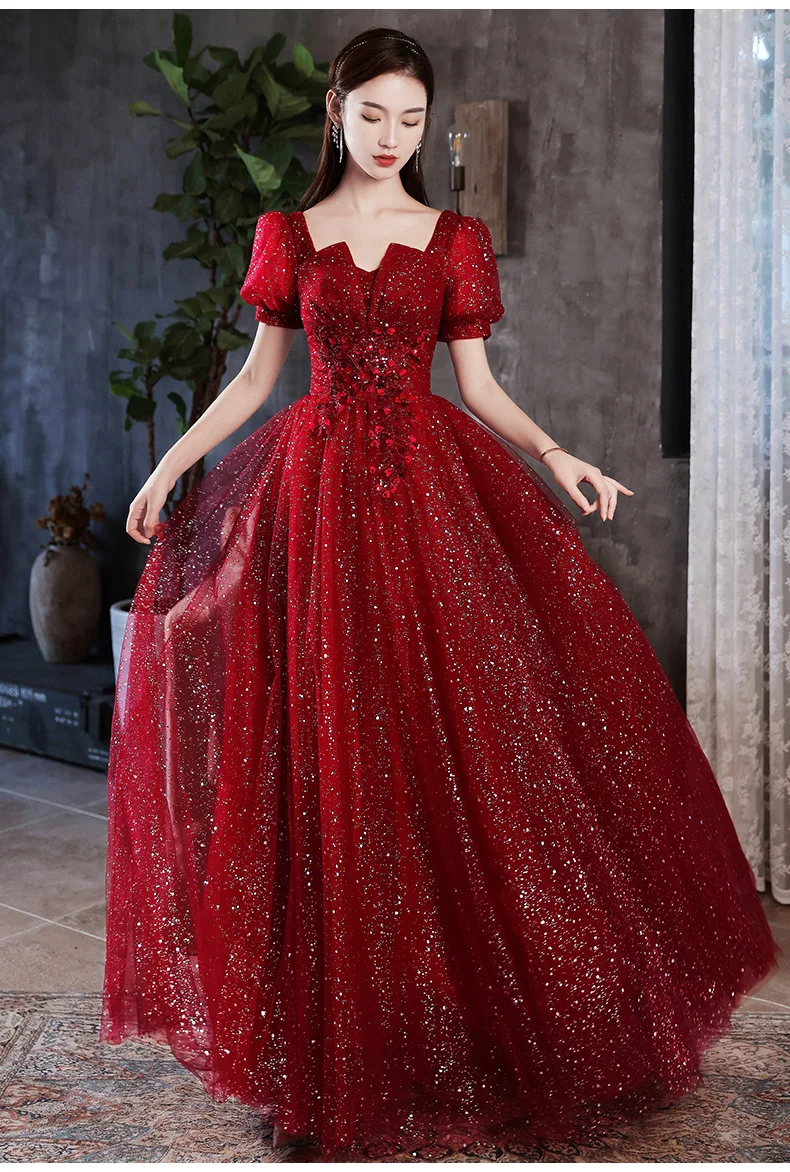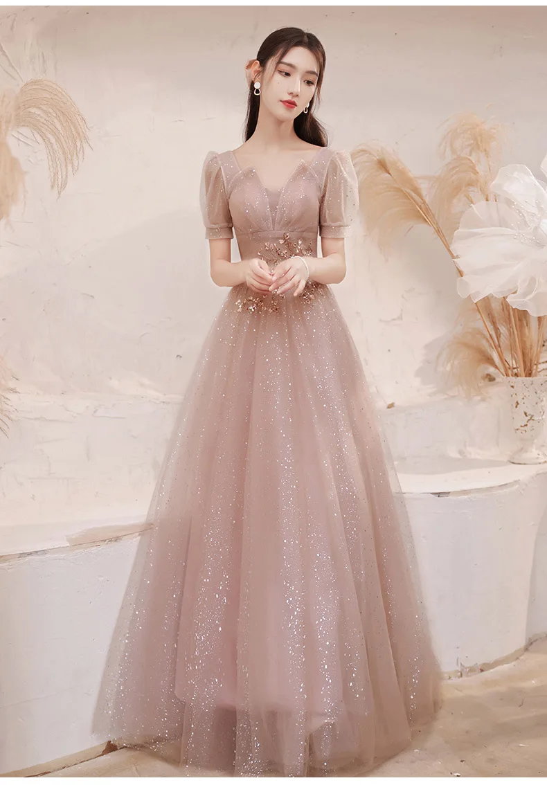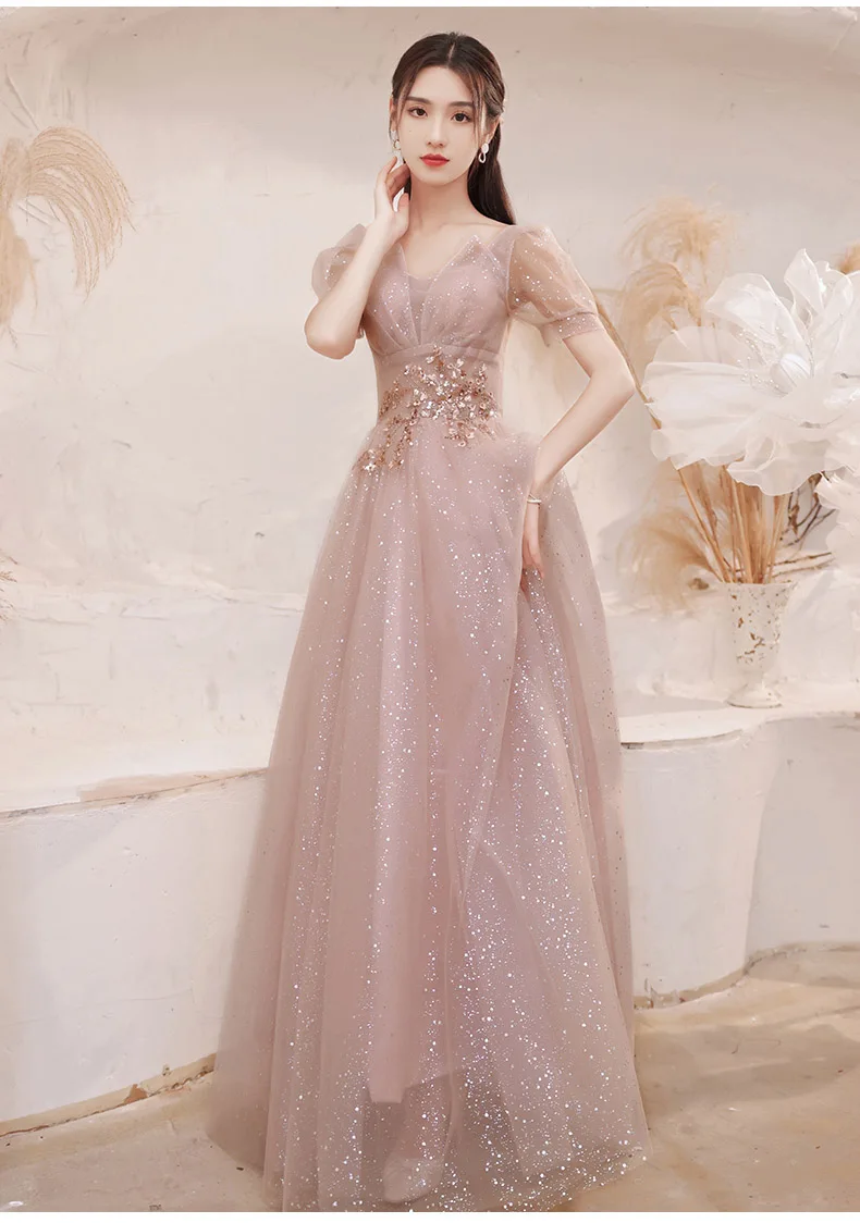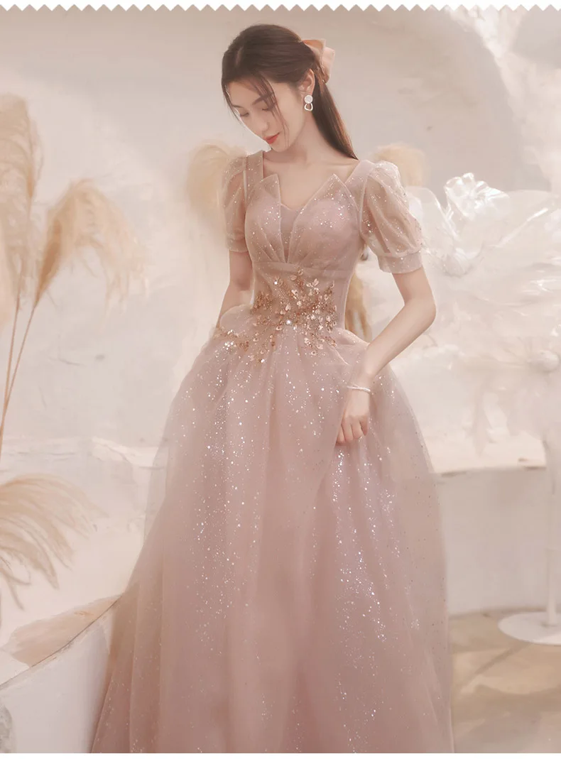 A Line V Neck Tulle Appliques Long Prom Dress Gown with Puff Sleeves for Women