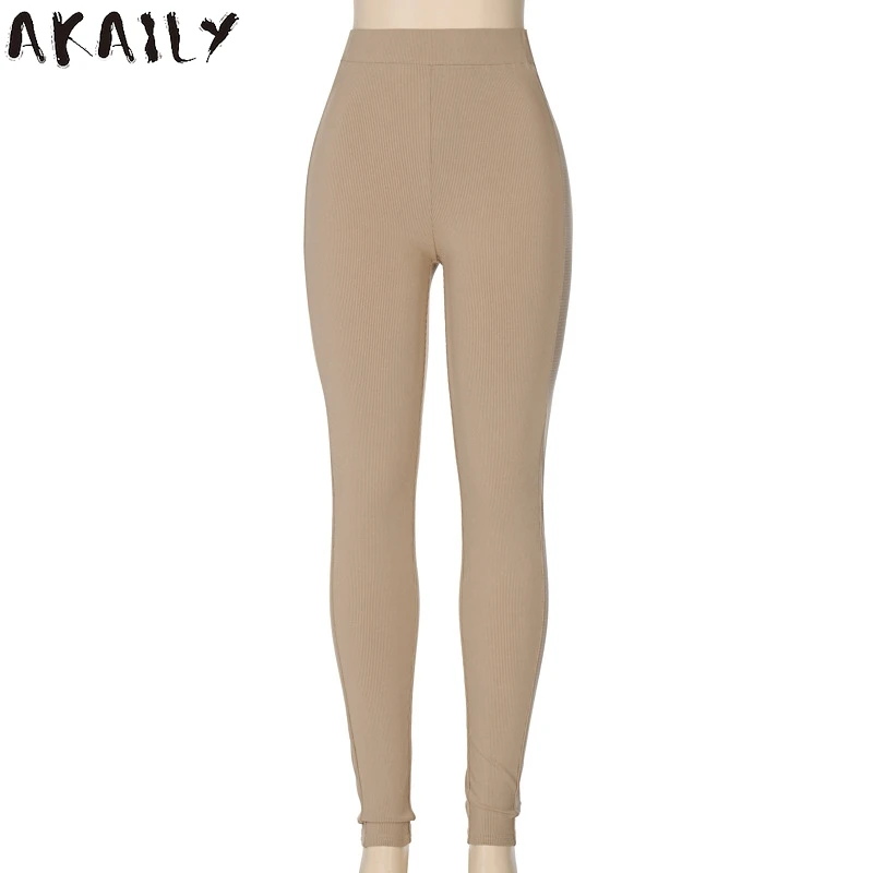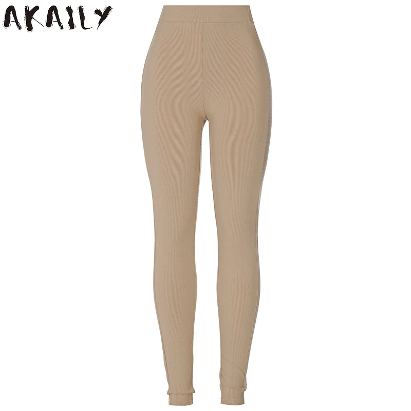 AKAILY Balck White Khaki High Waist Fitness Leggings Women Ribbed Knitted Bodycon Leggings 2021 Ladies Workout Leggings Female