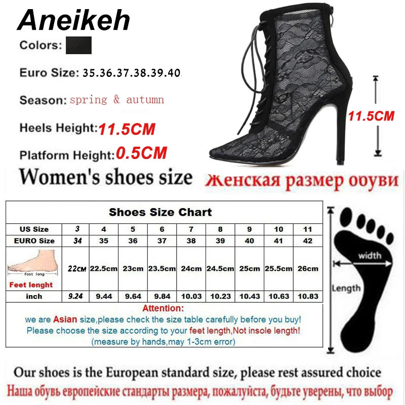 Aneikeh Black Mesh Women's Boots Fashion Pointed Toe Lace-up High Heels Women Transparent Ankle Boots Female Sandals Pumps Dress