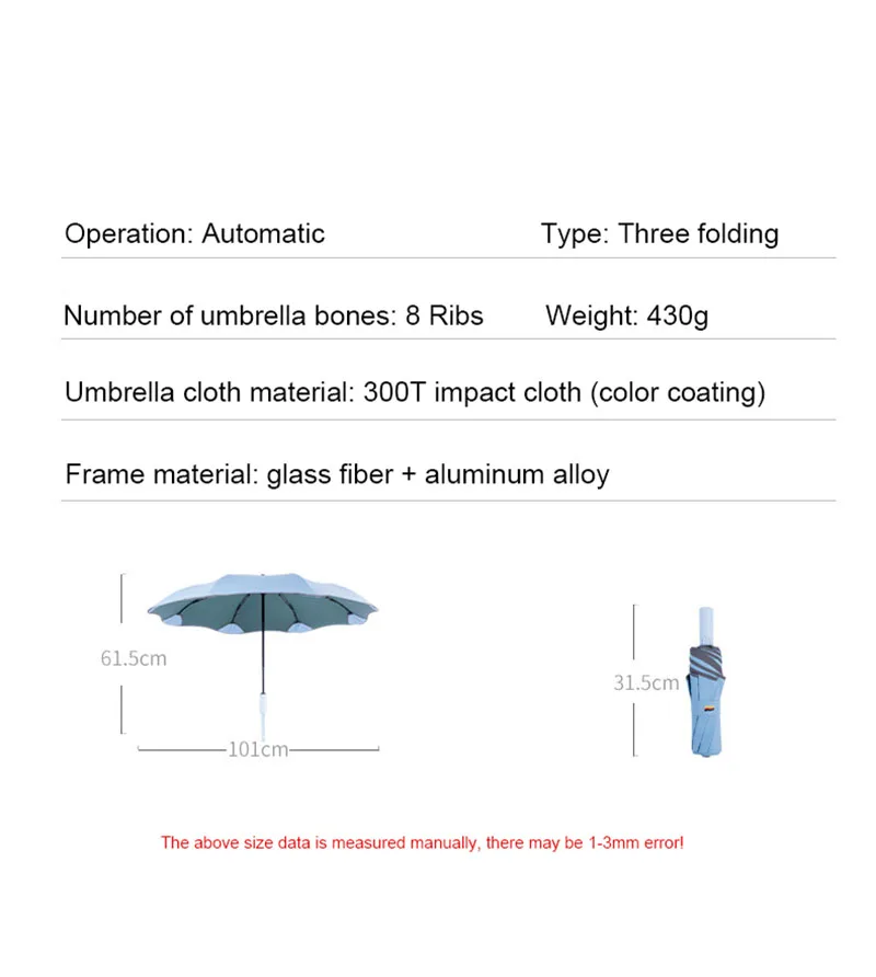 Product: Luxurious fully automatic sun umbrella Number of ribs: 8 Ribs Umbrella stand material: glass fiber + aluminum alloy Umbrella cloth material: pongee(with color coating) Size: Spread width: 101cm; Spread height: 61.5cm;length 31.5cm after folding Weight: about 425g Features: It has 300T cationic thickened umbrella cloth, UPF≥50+, super sun protection ability; innovative 360° anti-poke rounded corner design, safer to use; stylish and simple color matching to meet the aesthetic pursuit of different men and women !