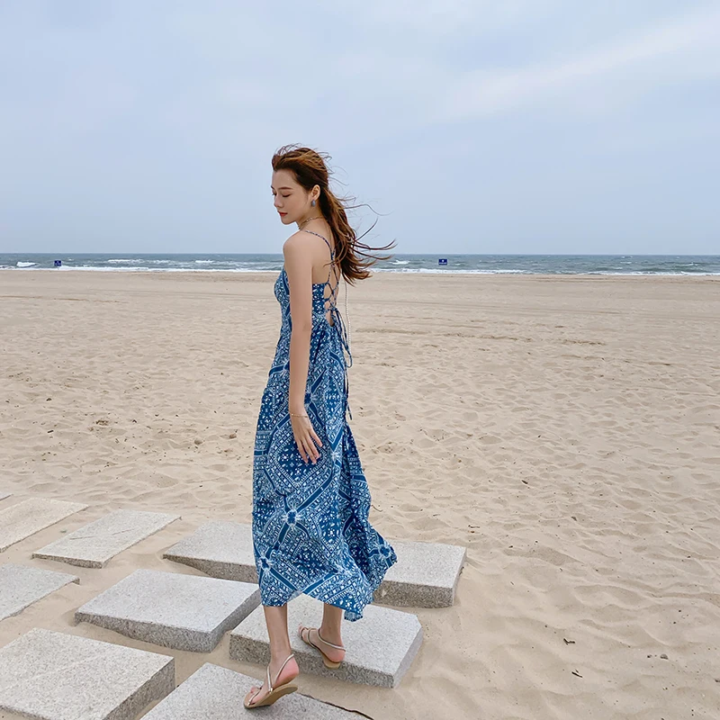 Beach Style Summer Bohemian Dress for Women Cross Bandage Sexy Dress Female Spaghetti Strap Print Long Dresses Robe Femme 13237