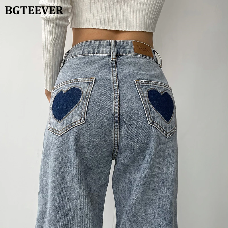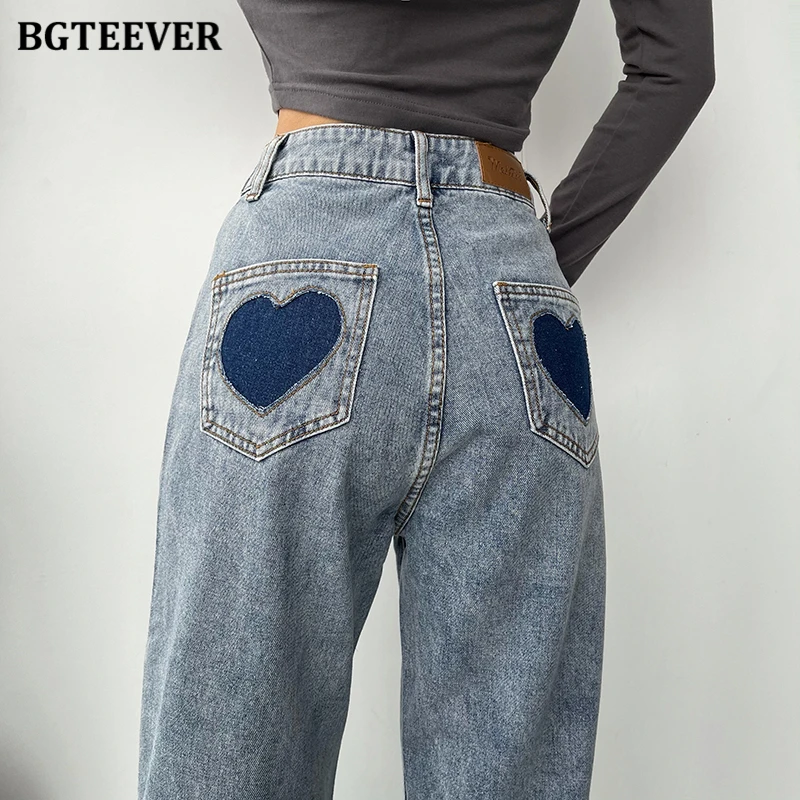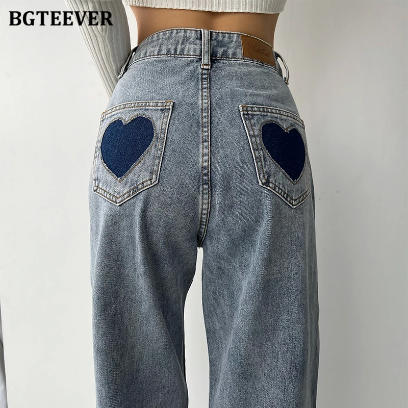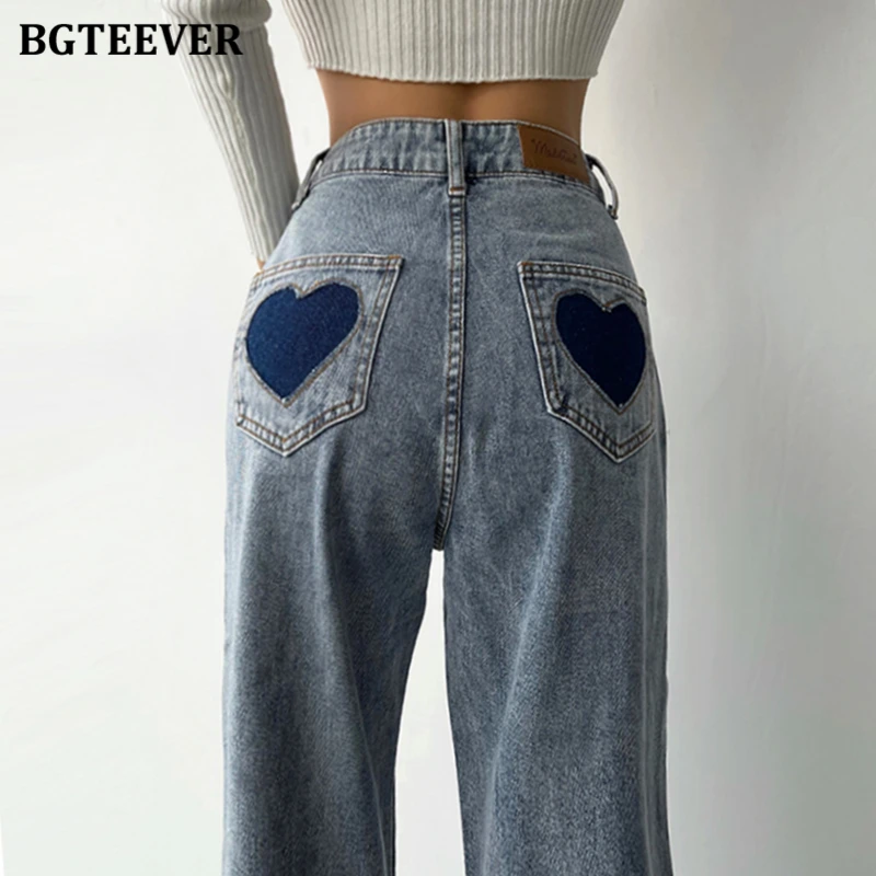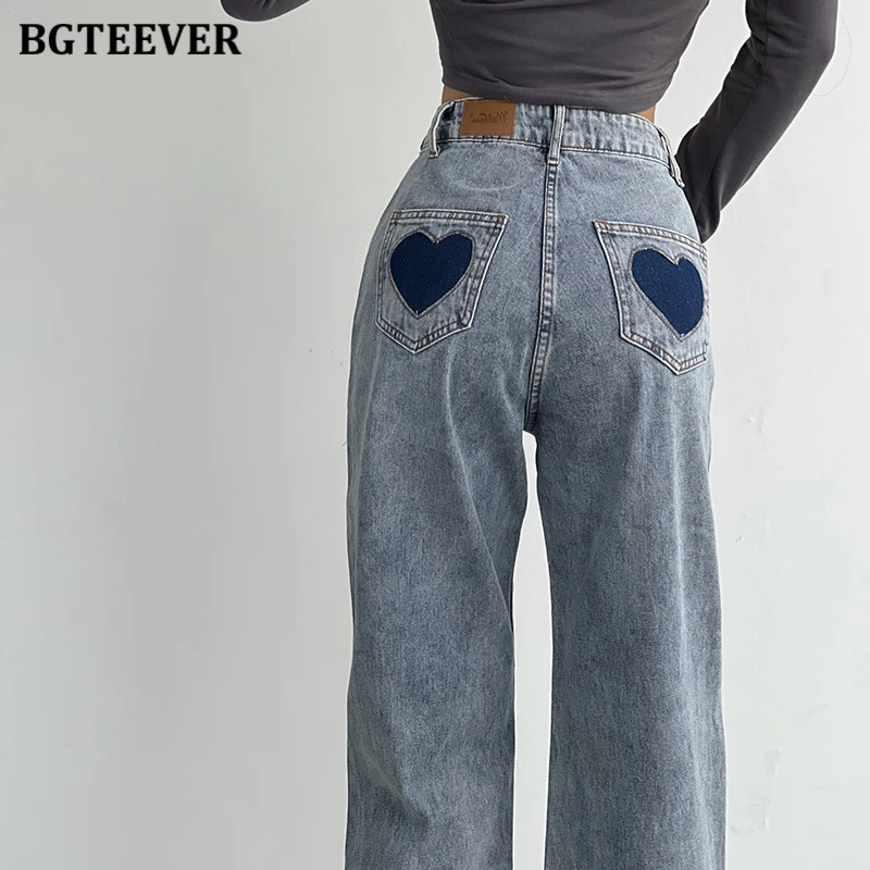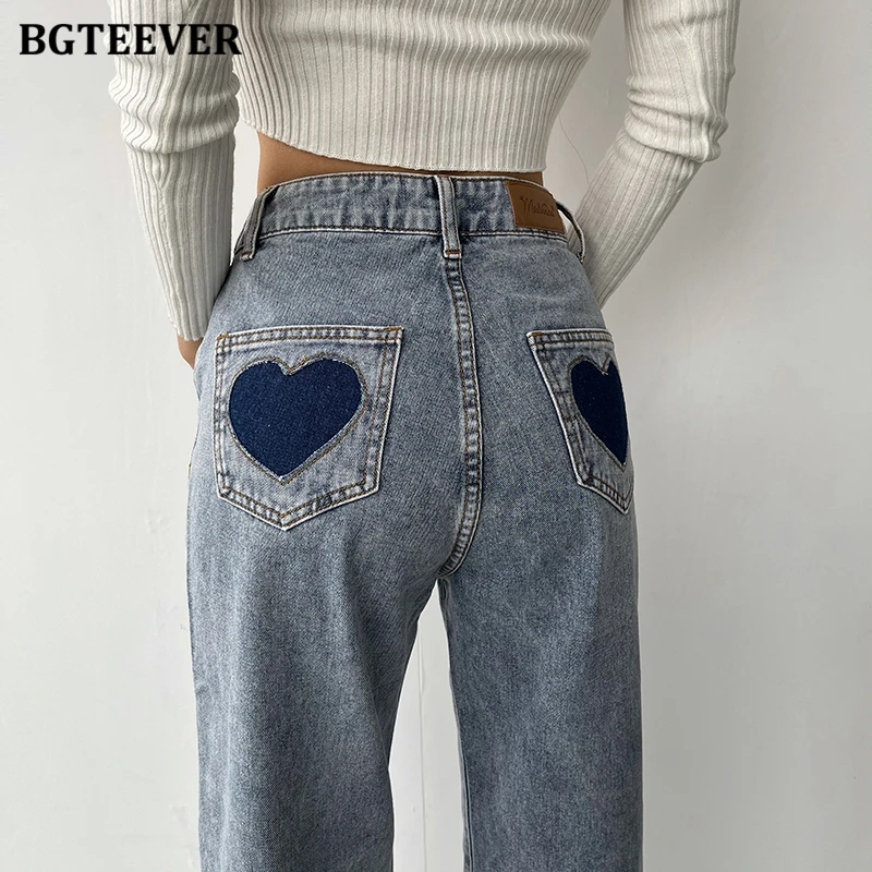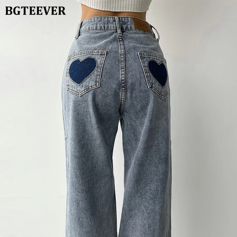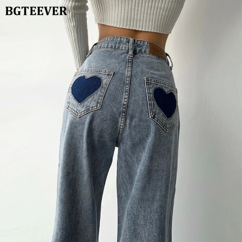 BGTEEVER Casual High Waist Heart Pockets Women Denim Jeans Streetwear Long Straight Leg Jeans Pants Female Trousers 2021 New