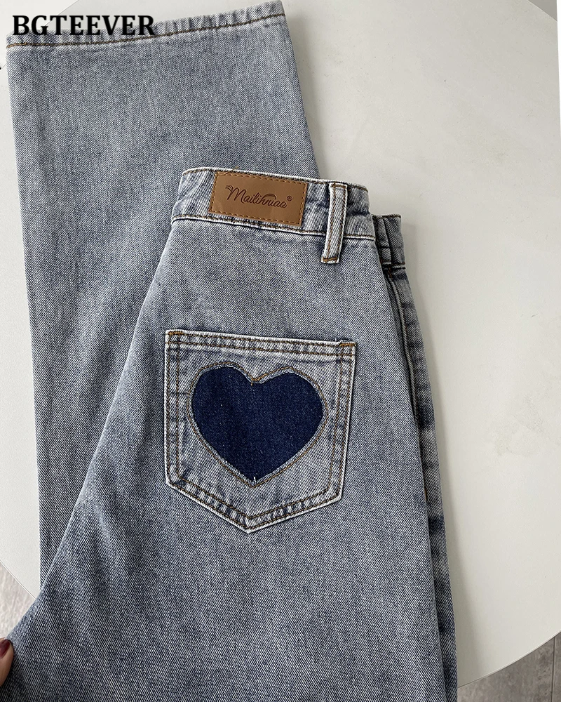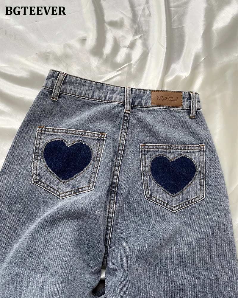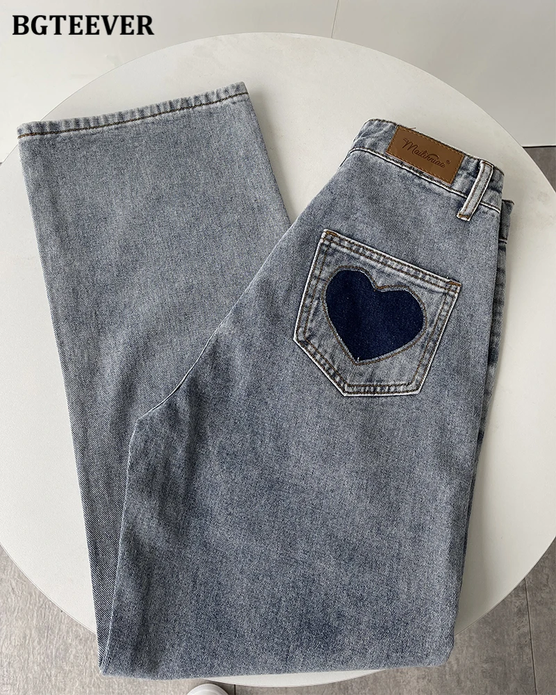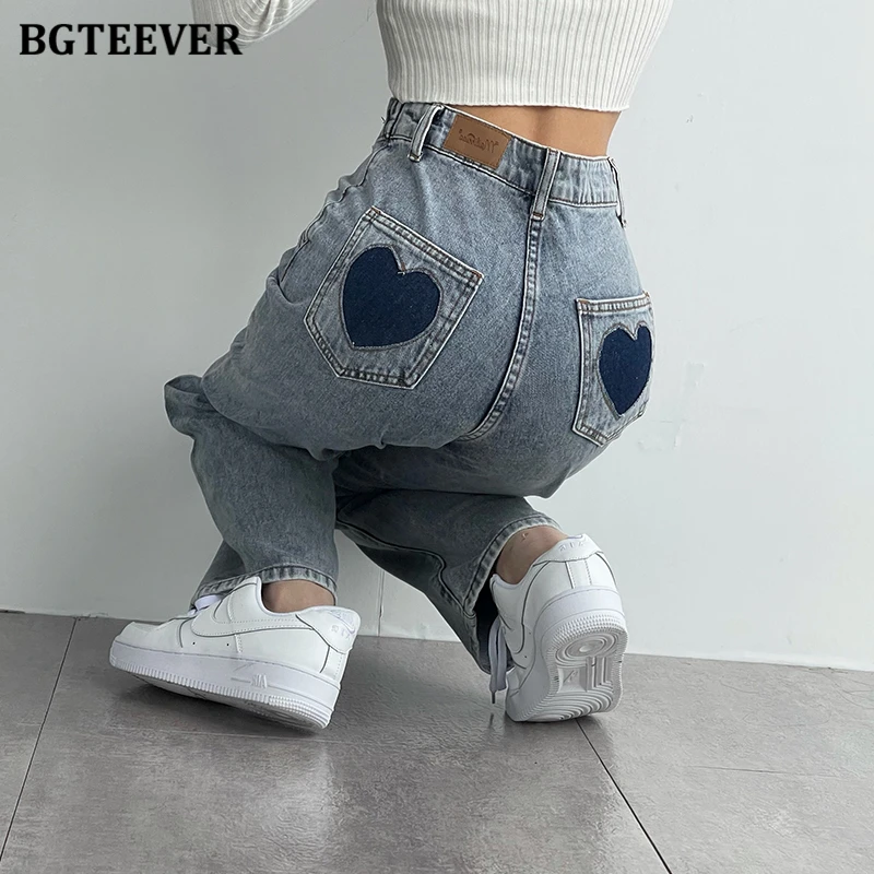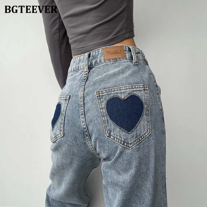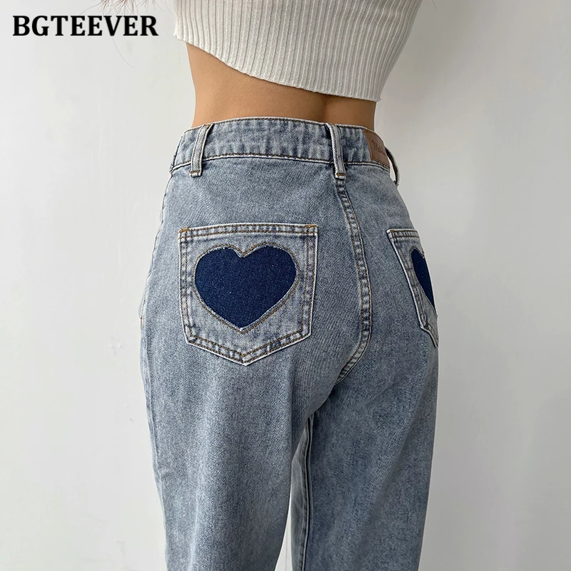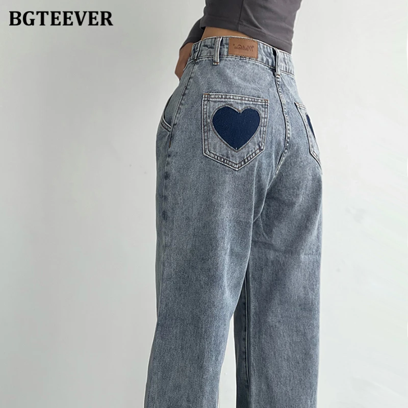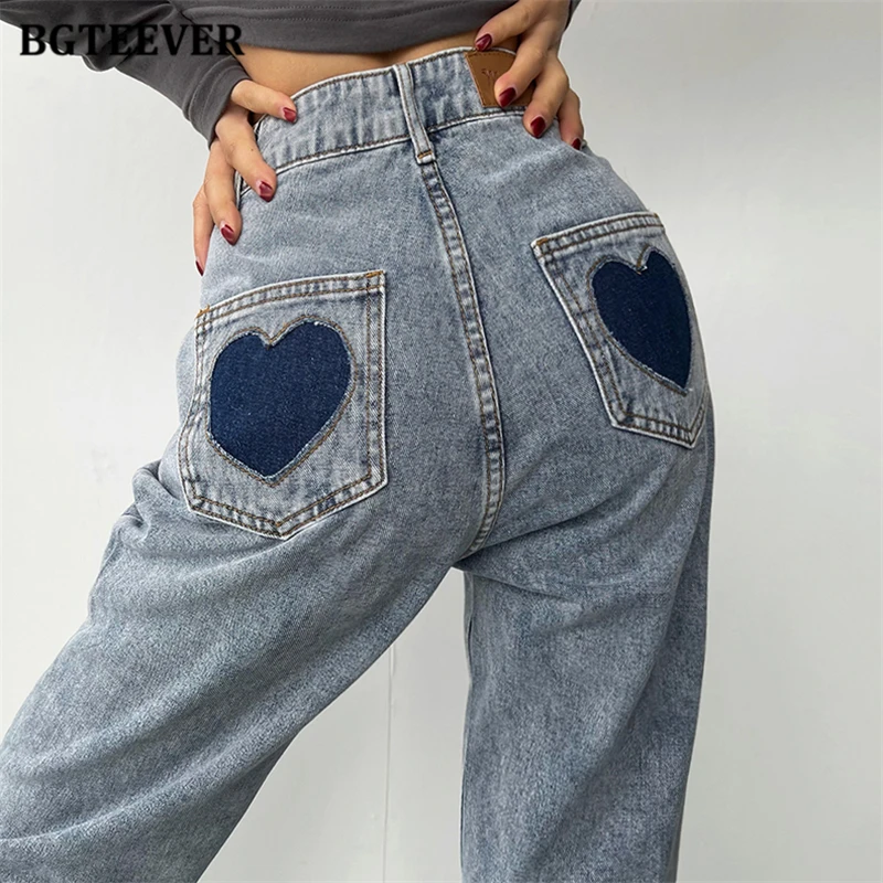 BGTEEVER Casual High Waist Heart Pockets Women Denim Jeans Streetwear Long Straight Leg Jeans Pants Female Trousers 2021 New