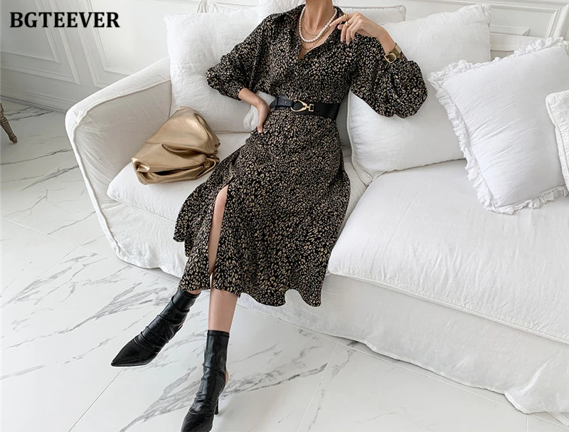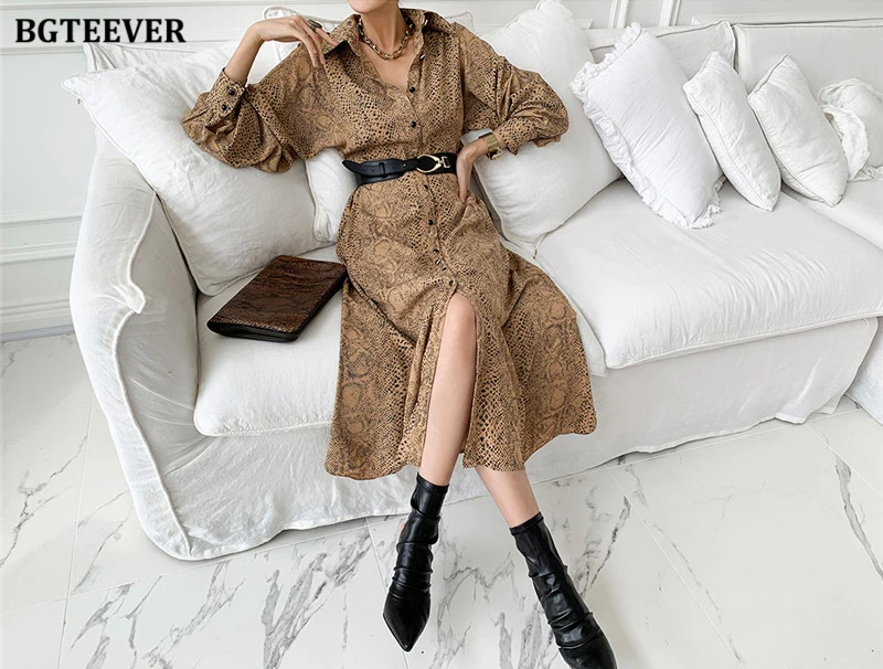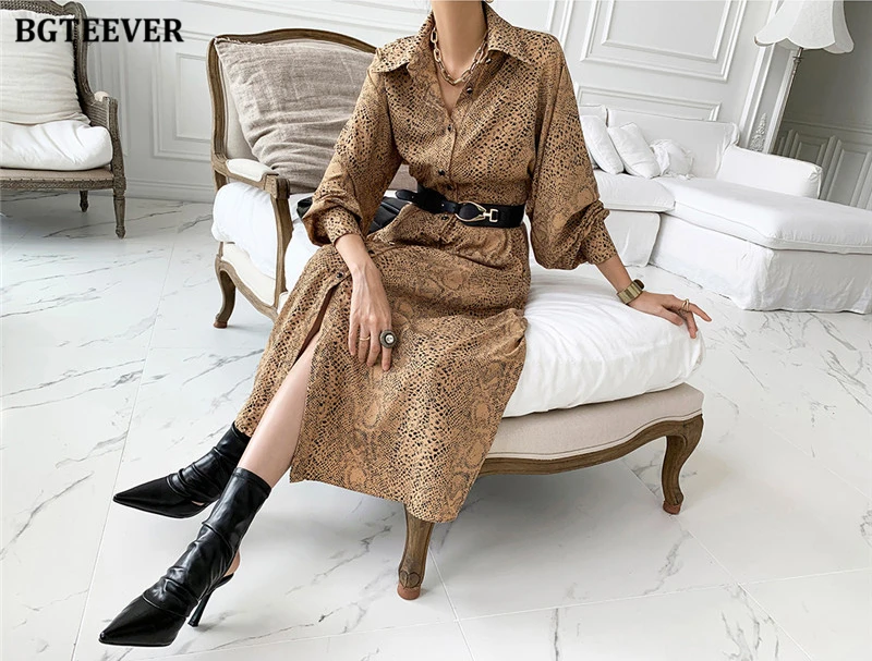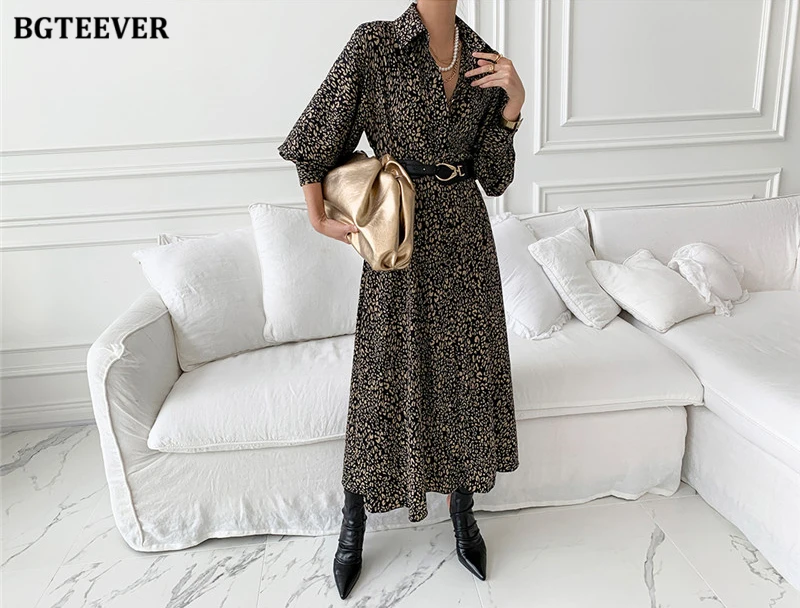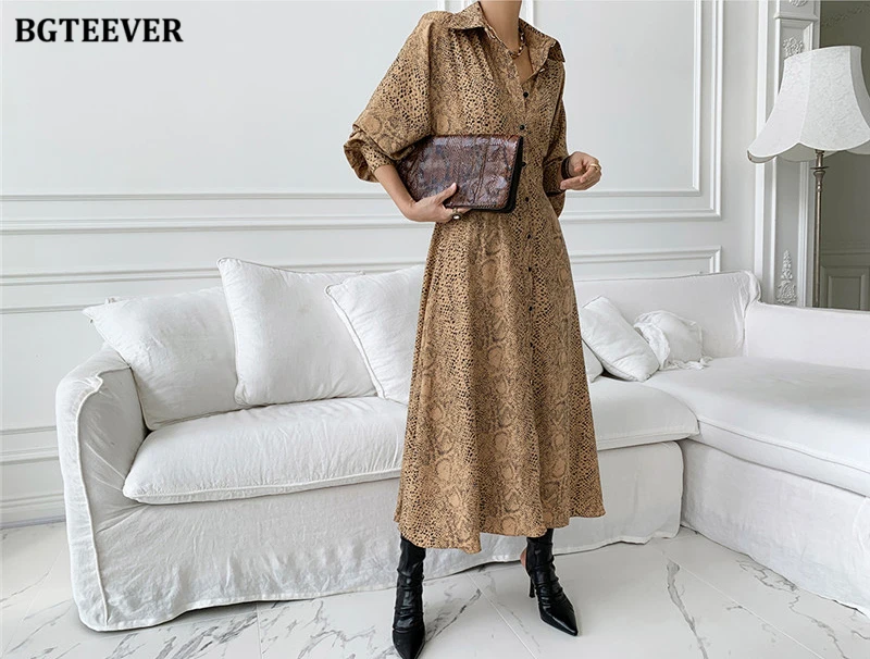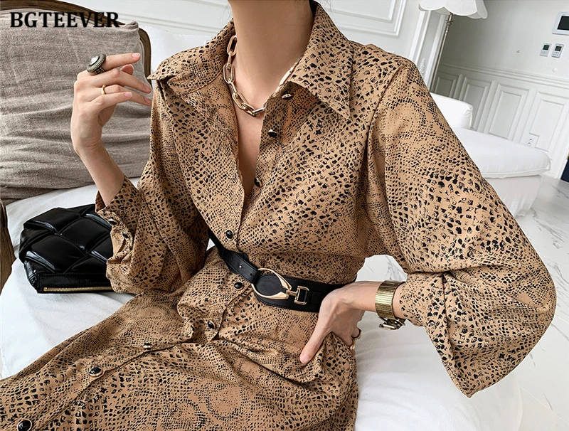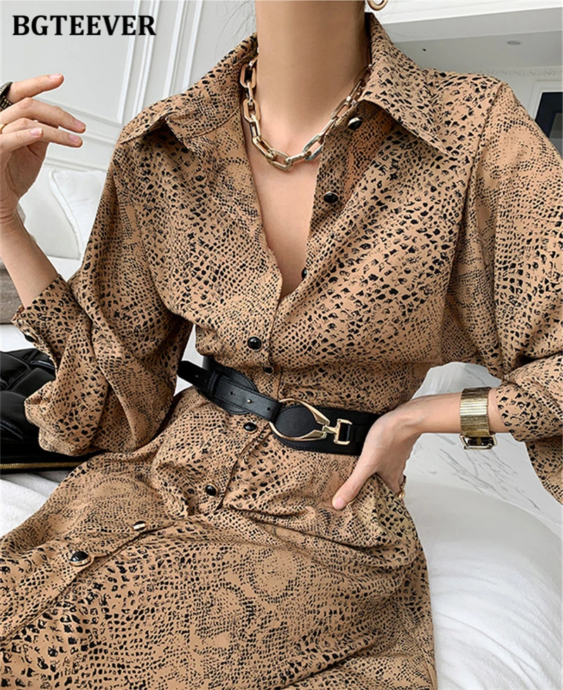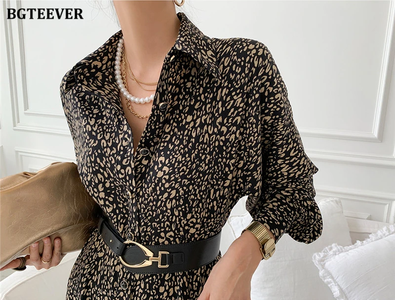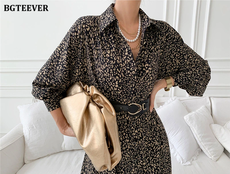 BGTEEVER Stylish Leopard Printed Long Shirt Dress for Women Full Sleeve Single-breasted Female A-line Dress Spring Vestidos 2021