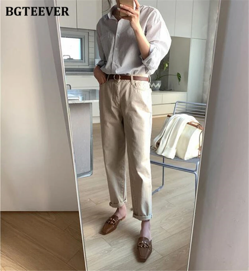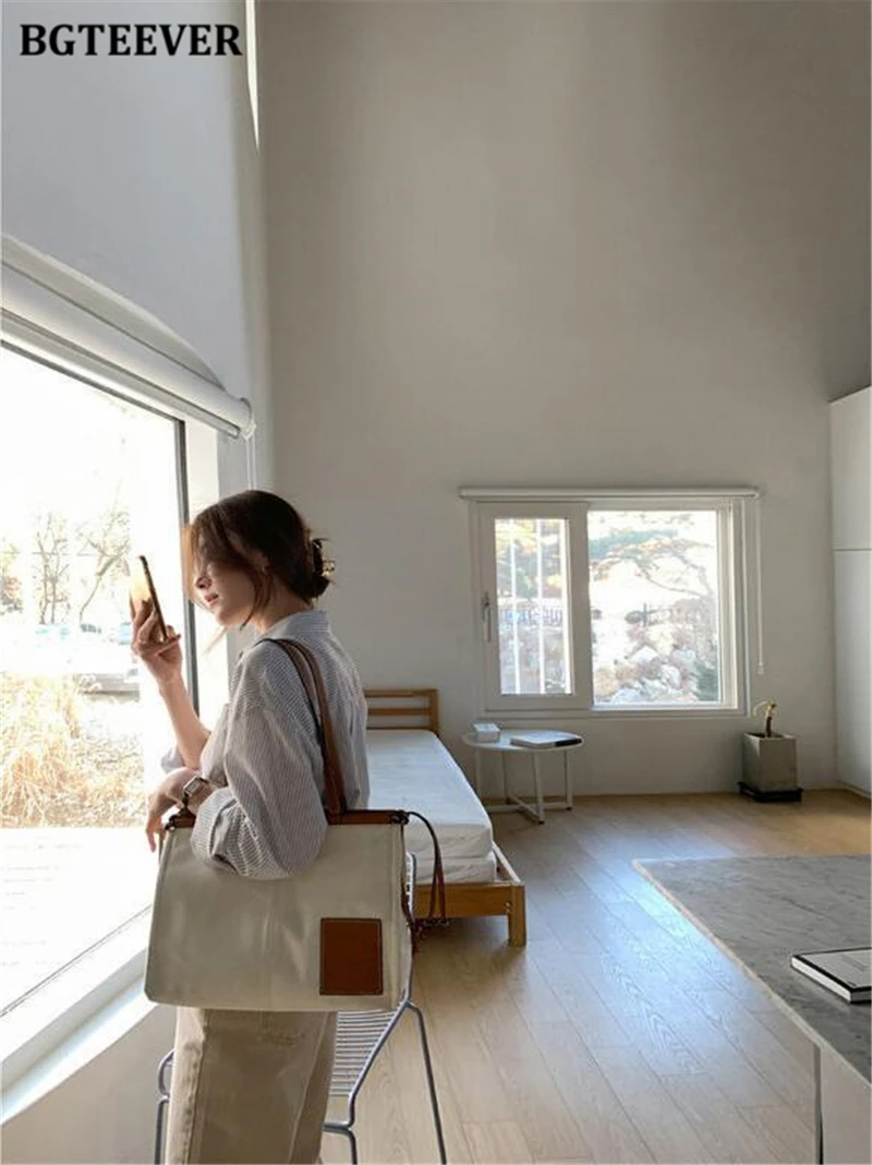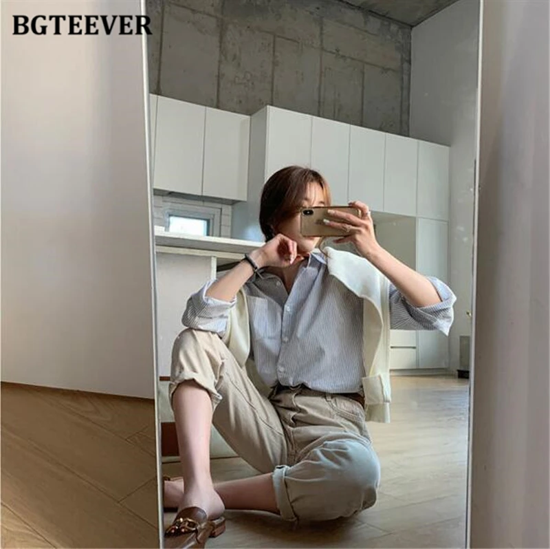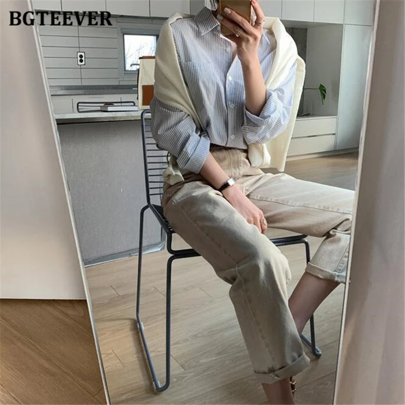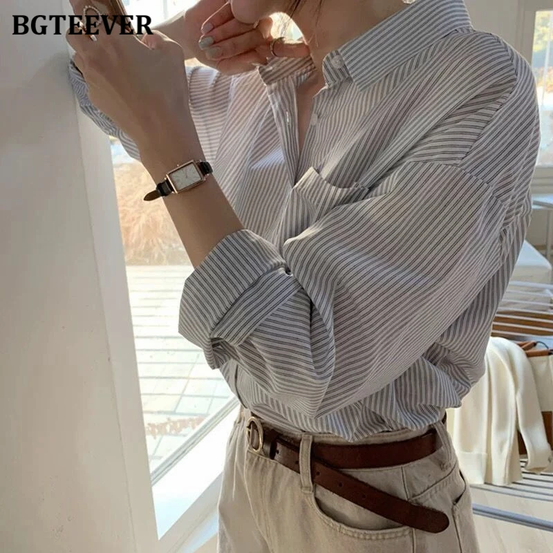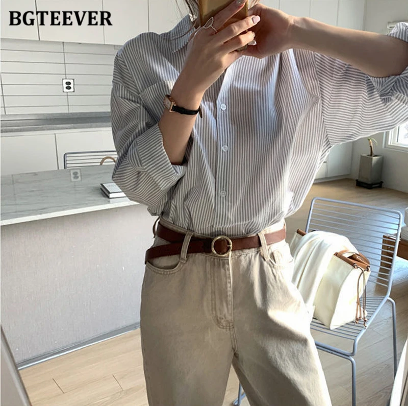 BGTEEVER Vintage Ladies Striped Women Blouses Turn-down Collar Long Sleeve Loose Female Shirts Casual Tops Femme Spring
