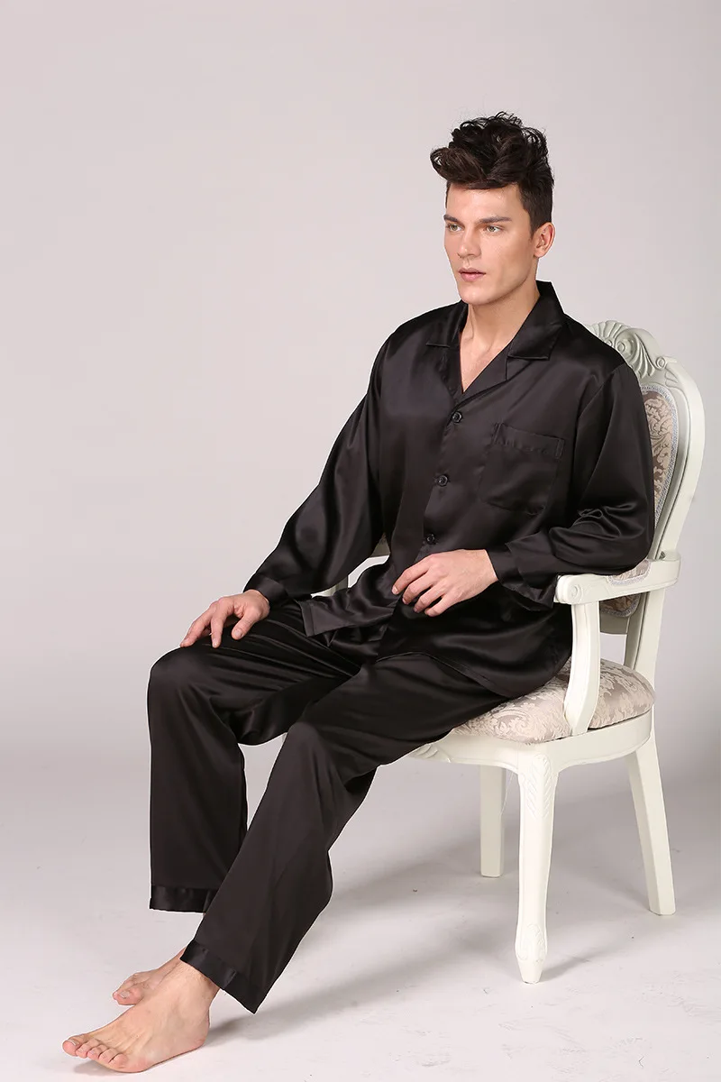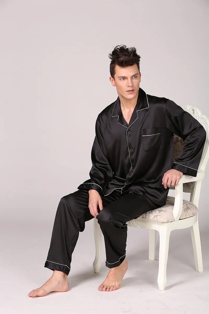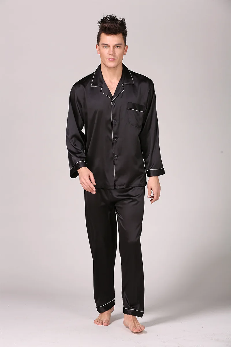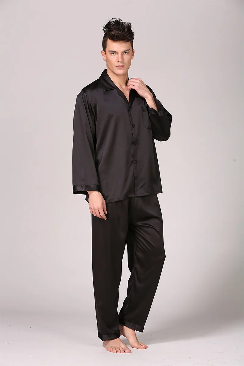 Black Men Pajamas Set Satin 2PCS Sleepwear Shirt&Pants Soft Nightwear Loungewear Casual Pijamas Home Clothes Solid PJS Suit