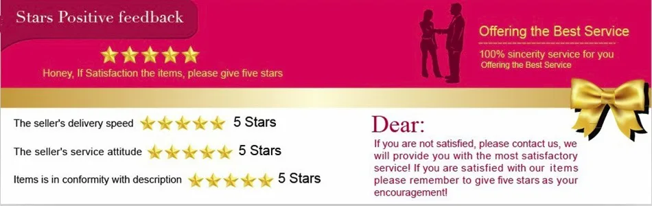 * We will provide positive feedback once payment is received,To foster a healthy Ali community,we hope you will do the same for us.We want you to understand that we value customer service tremendously.If you have any dissatisfaction,please give us the opportunity to resolve the problem before leave us a negative feedback.We are sure that there is always solution and we surely don`t want a bad feedback to be where the transaction ends. Thanks for your understands.