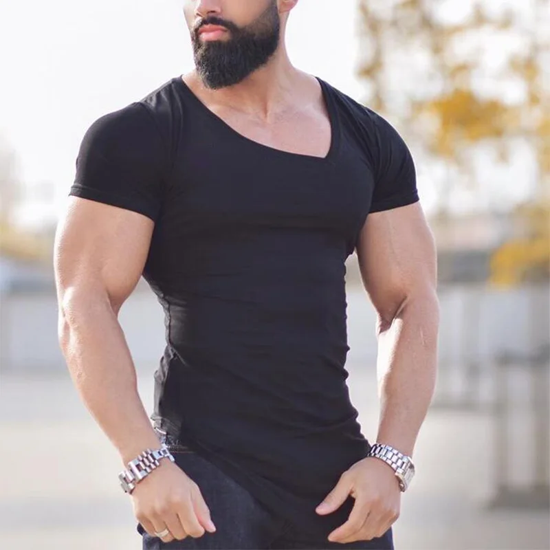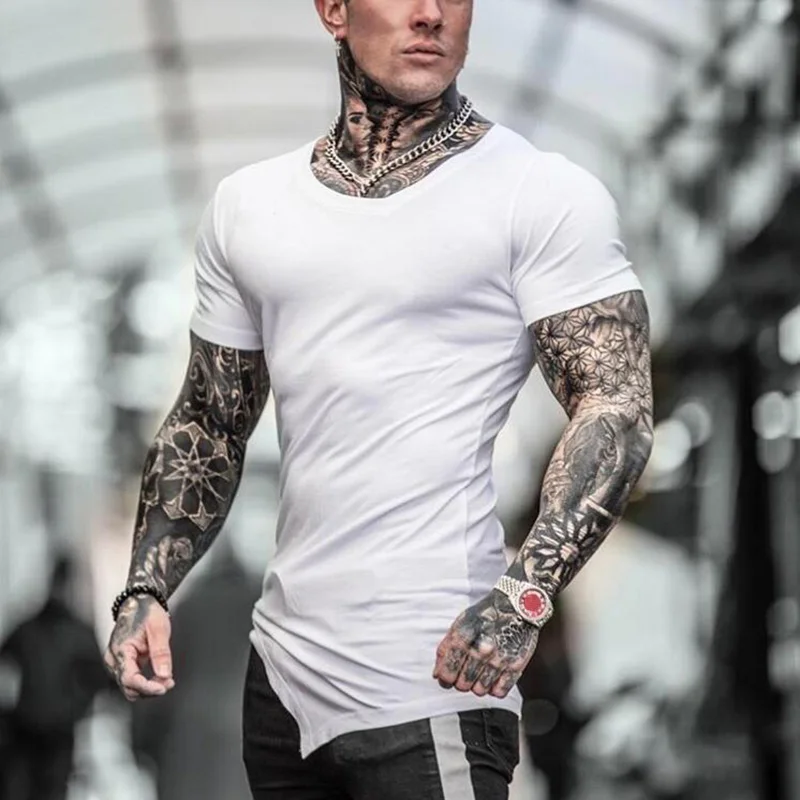 Brand Summer Fitness Men Cotton Short Sleeve t-shirt Oblique V Neck Gyms Clothing Bodybuilding T shirt Male Slim Tight Tees Tops