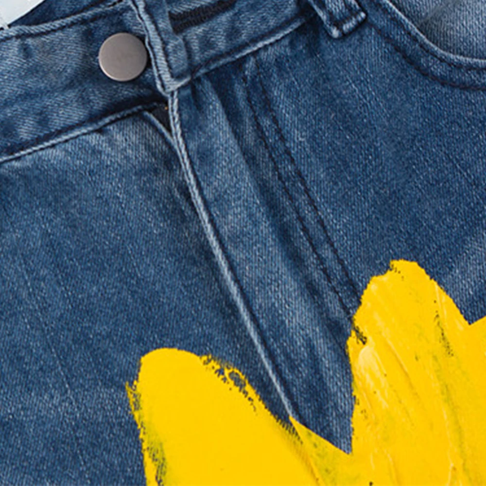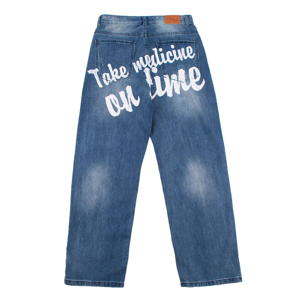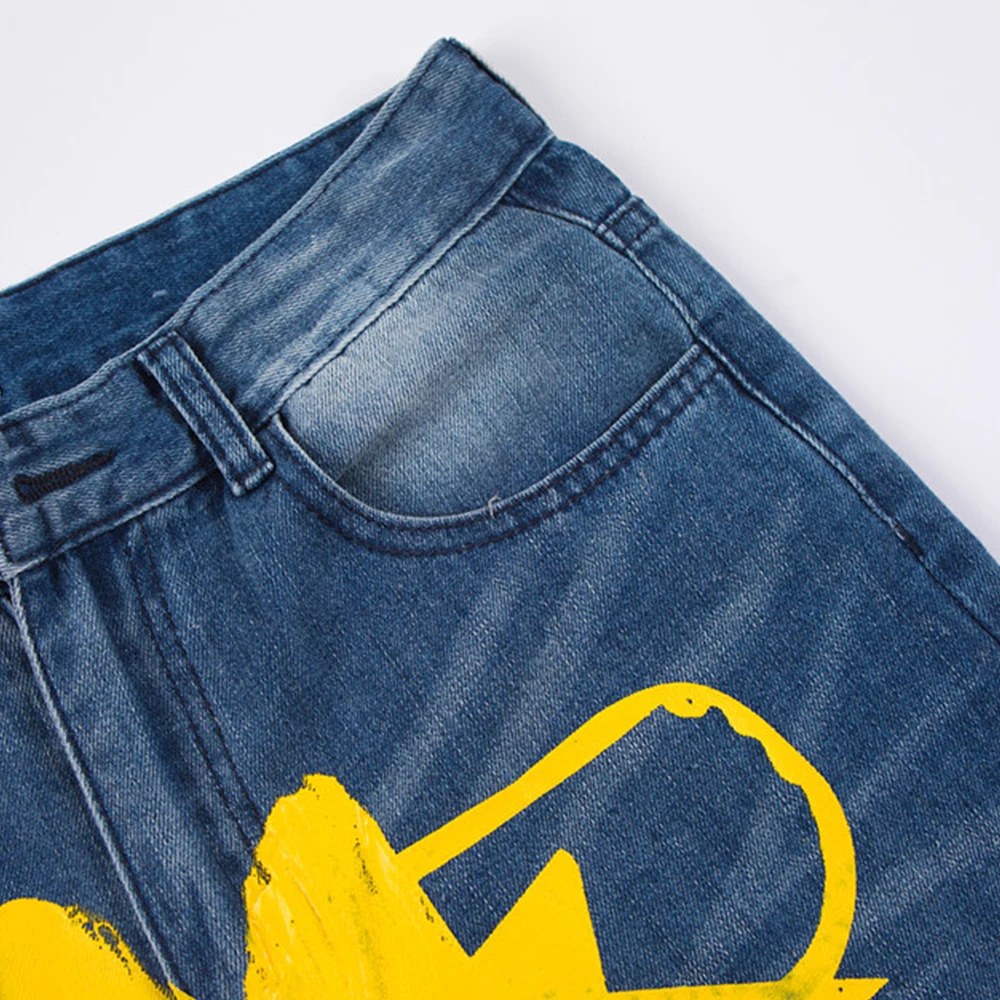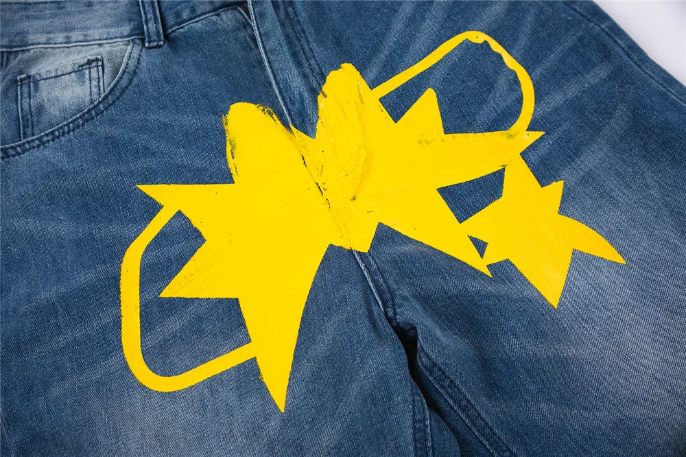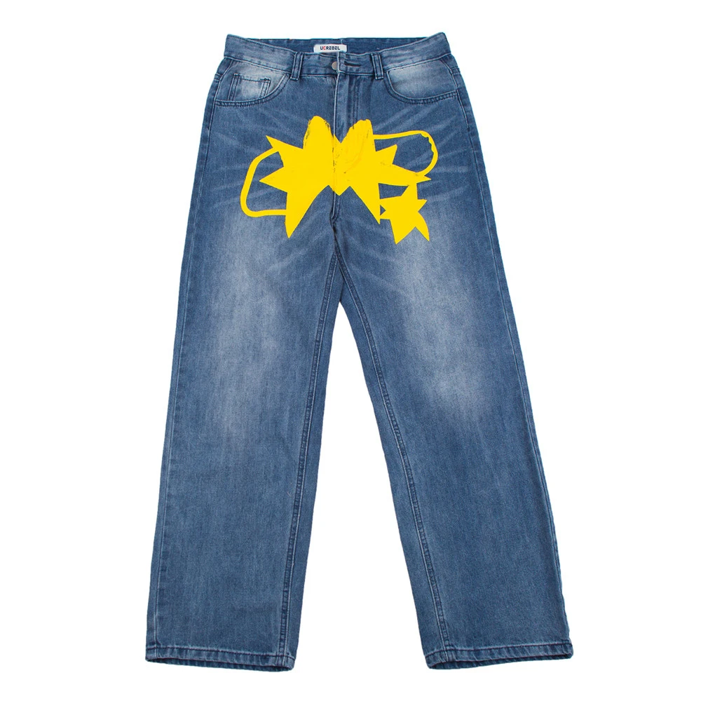 Cartoon Print Denim Pants Mens High Street Wide Leg Pants Streetwear Distressed Casual Loose Jeans Trousers Men