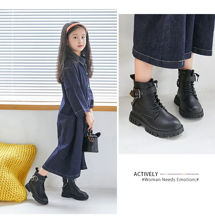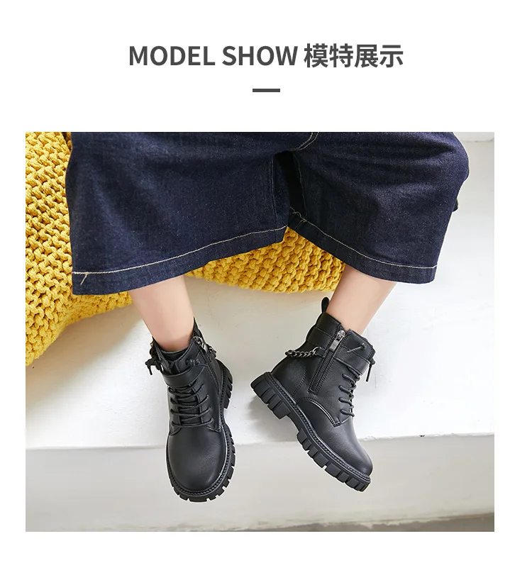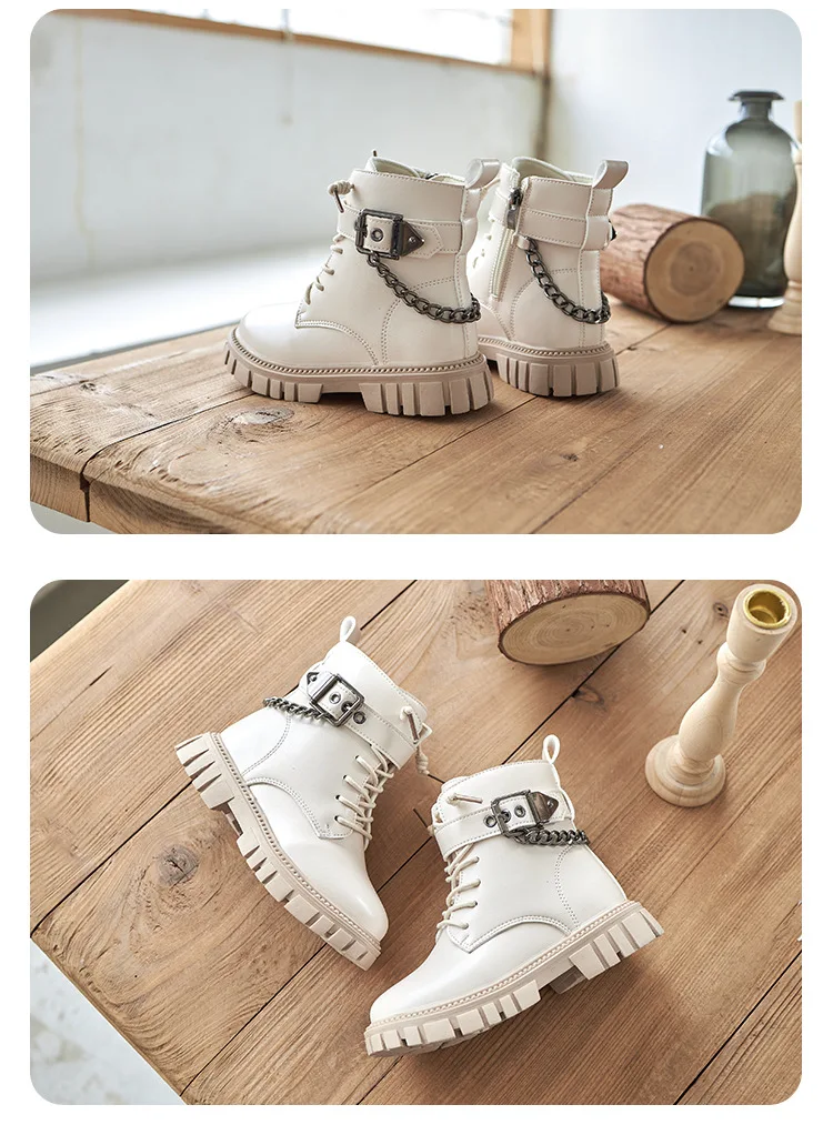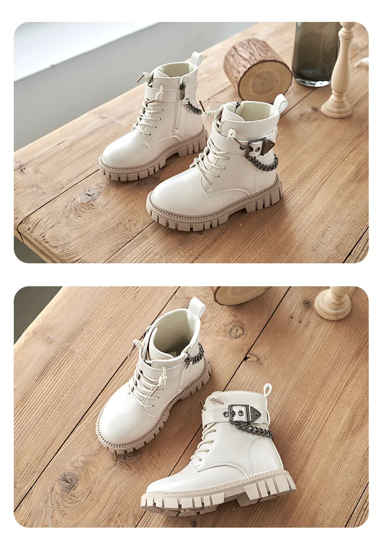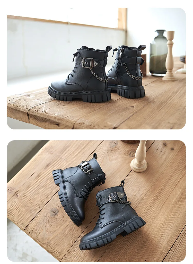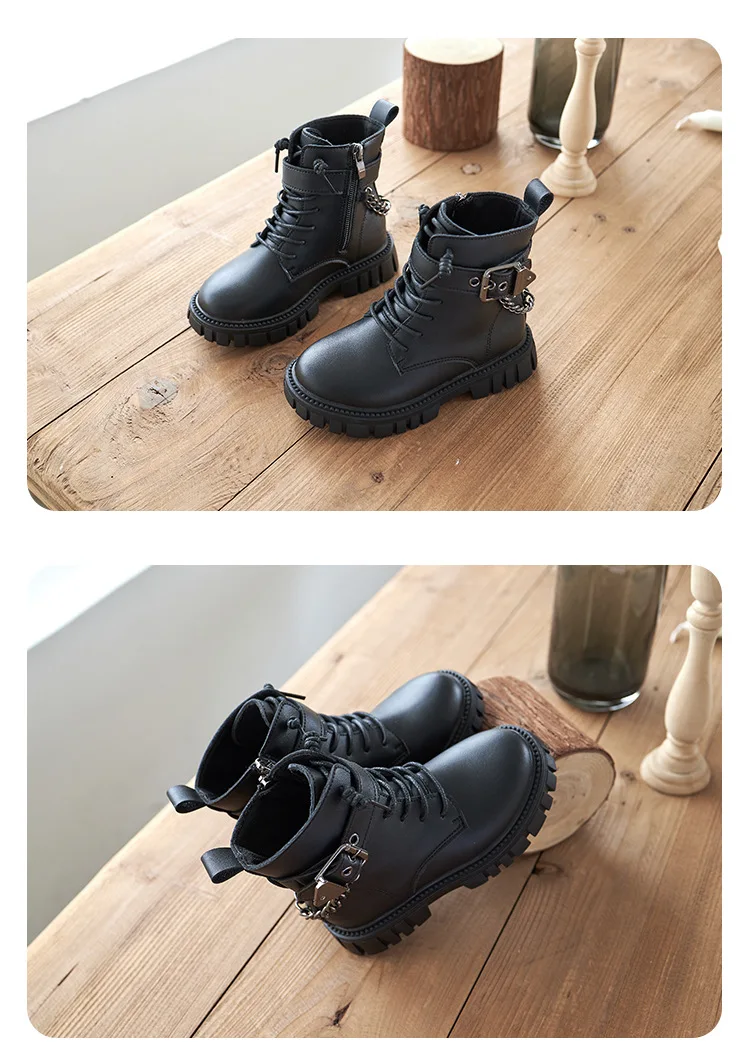Children Warm Boots Soft-soled Girls Fashion Boots Autumn Winter British Style Boys Leather Boots Student Metal Chain Sneakers