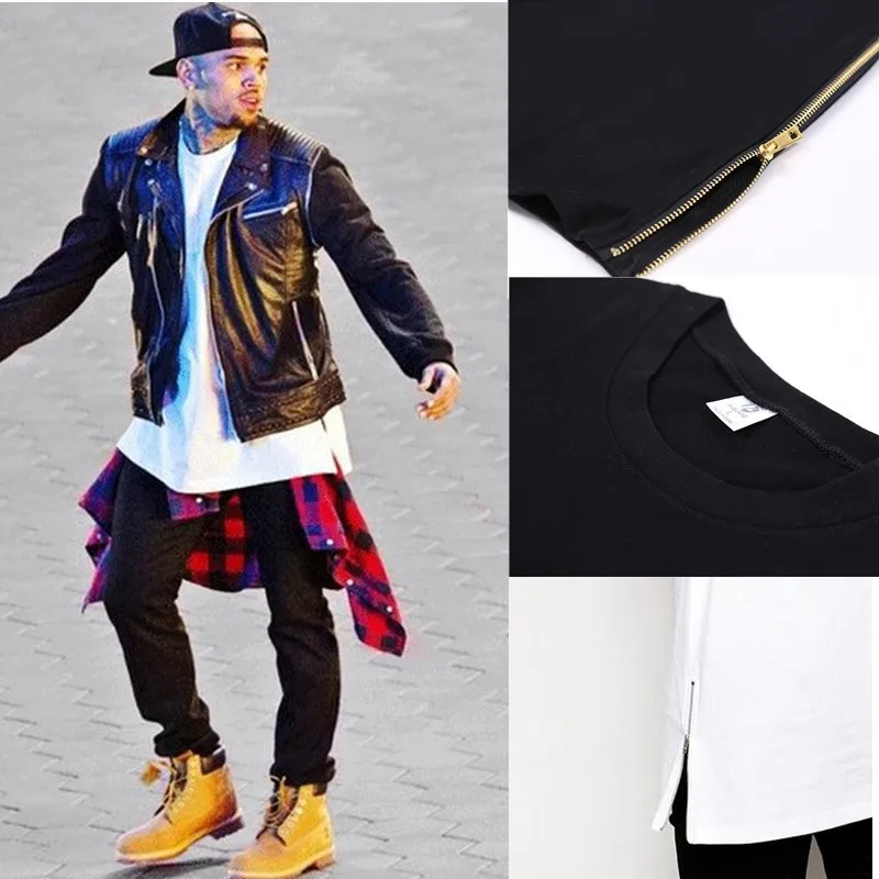 chris brown men extended golden zipper side men t-shirt cotton solid men's tops hip hop white black hip hop tees plus size XXL