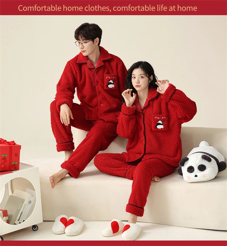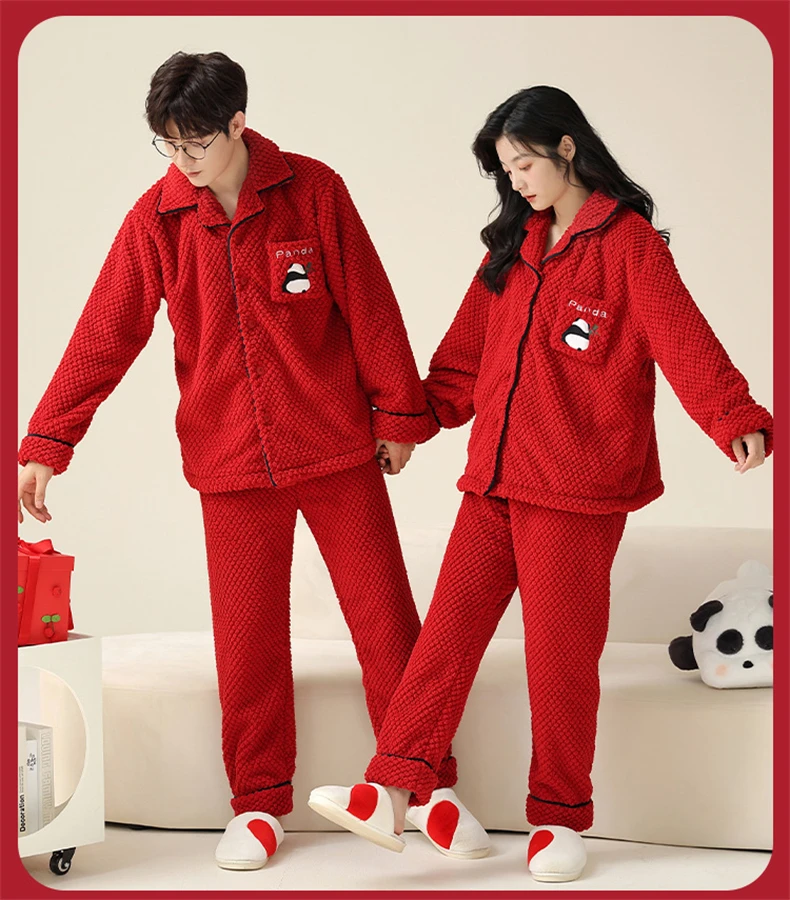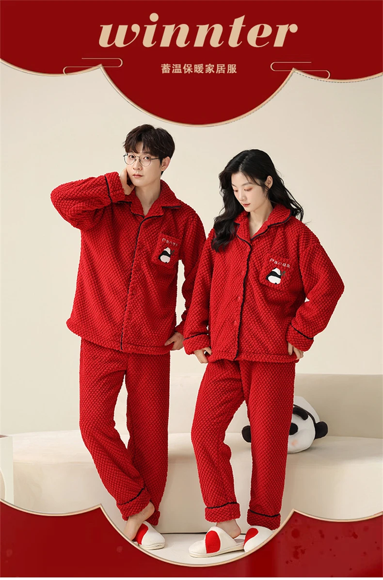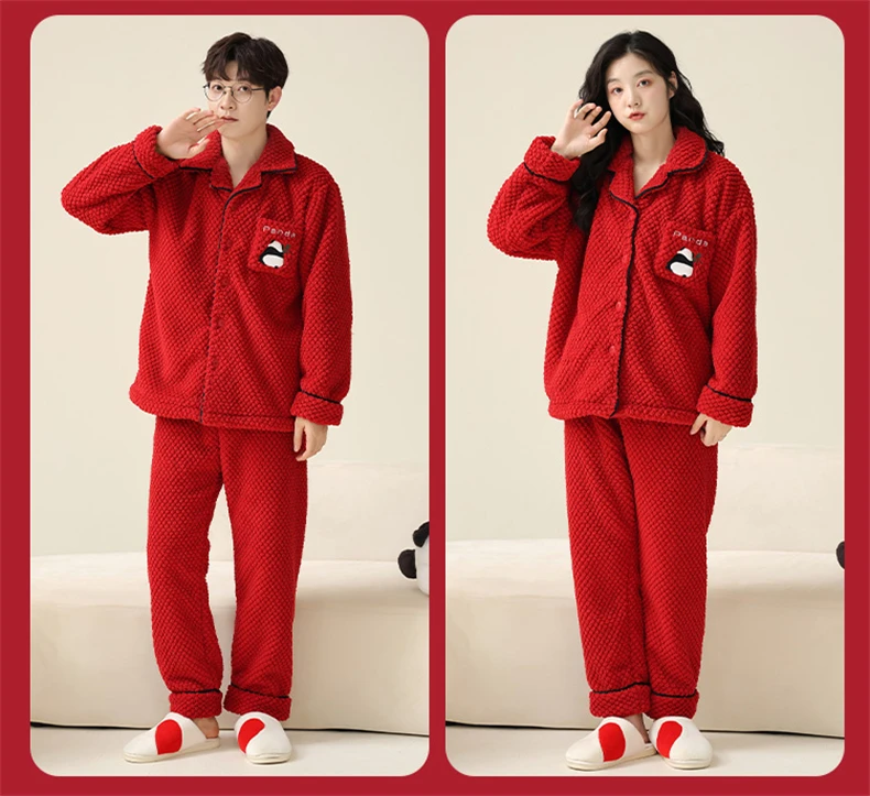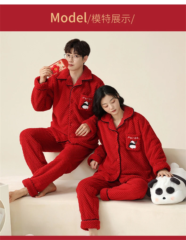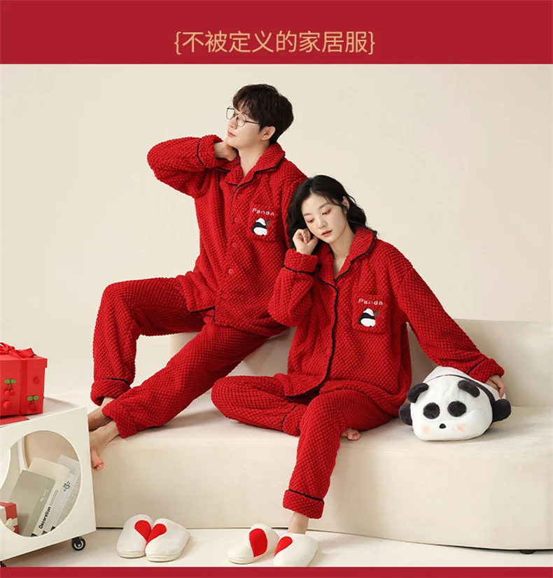 Christmas Couples Pajamas Lucky Big Red Cardigan Buttons Men Women Winter Wedding Flannel Sleepwear Cute Panda Women's Nightwear
