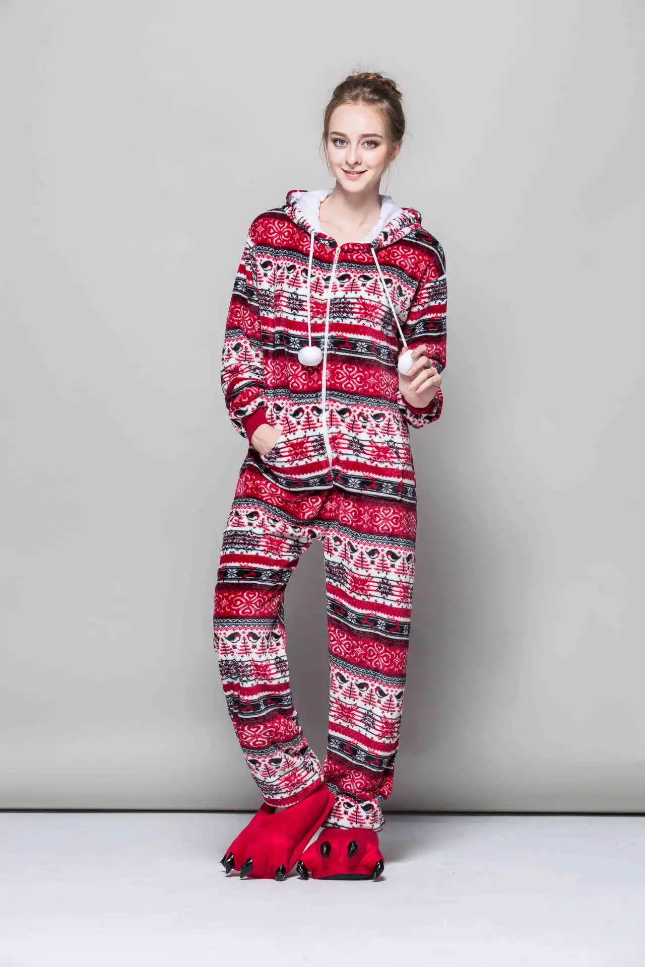 Christmas One-piece Pajamas Women Flannel Hooded Onesies Cartoon Unisex Winter Snow Pattern Pink Sleepwear Casual Homewear