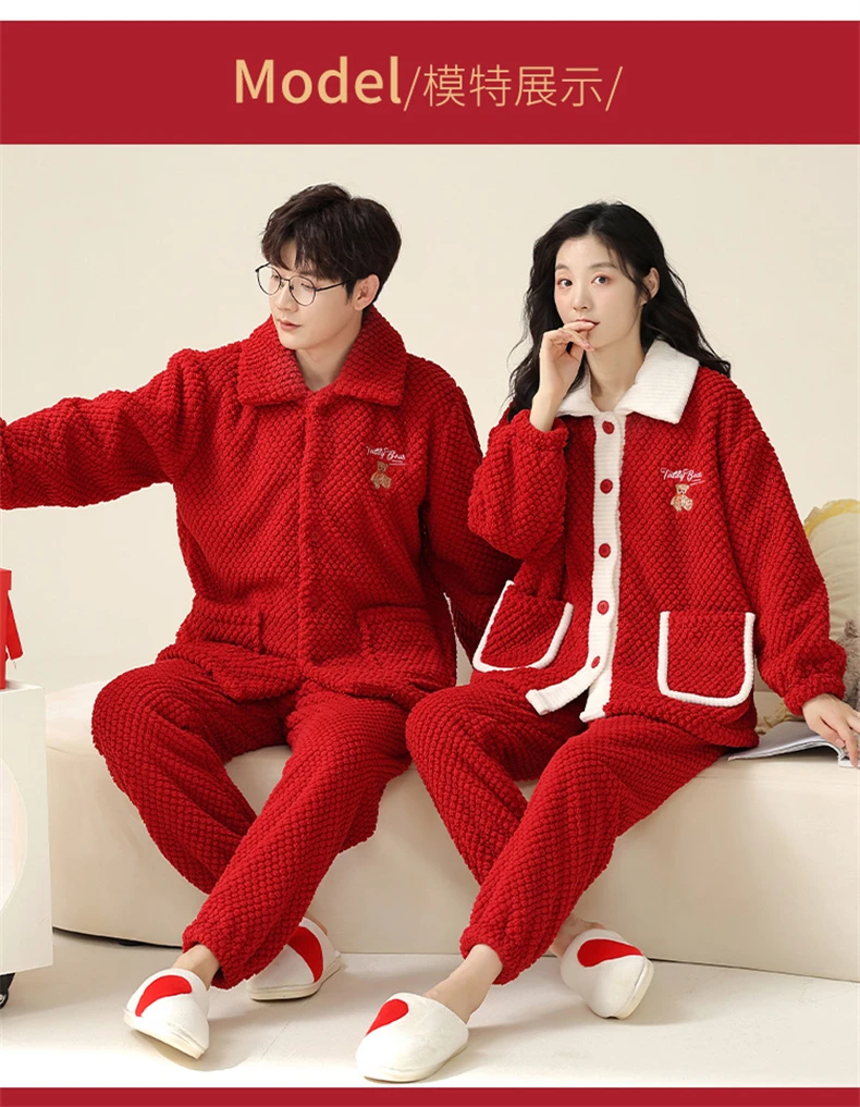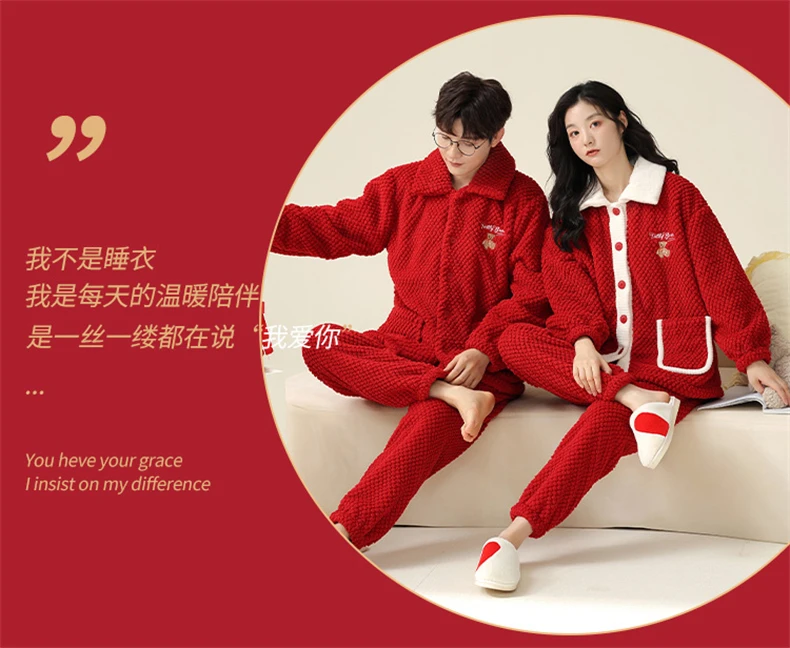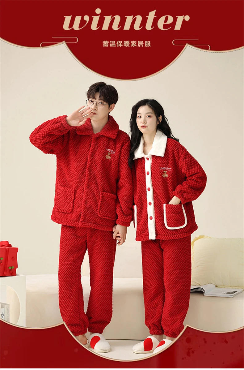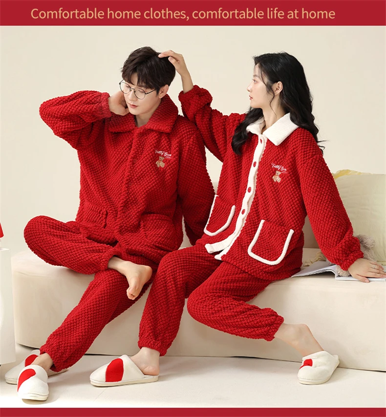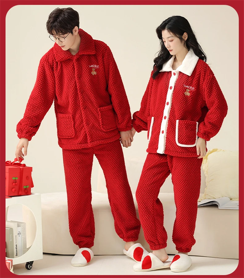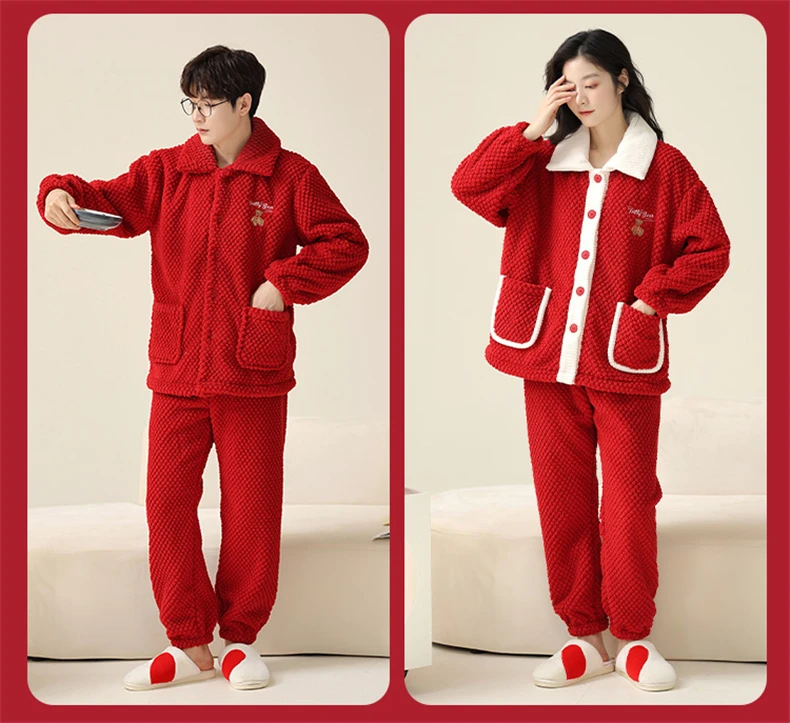 Christmas Pajamas For Couple Flannel Winter Warm Men Women Big Red Cardigan Homewear Cute Bears Sleepwear Couple New Year Pijama