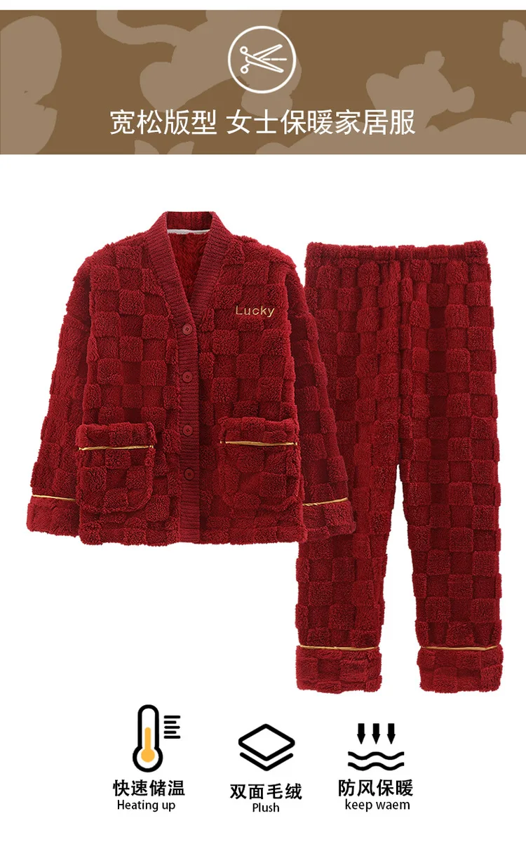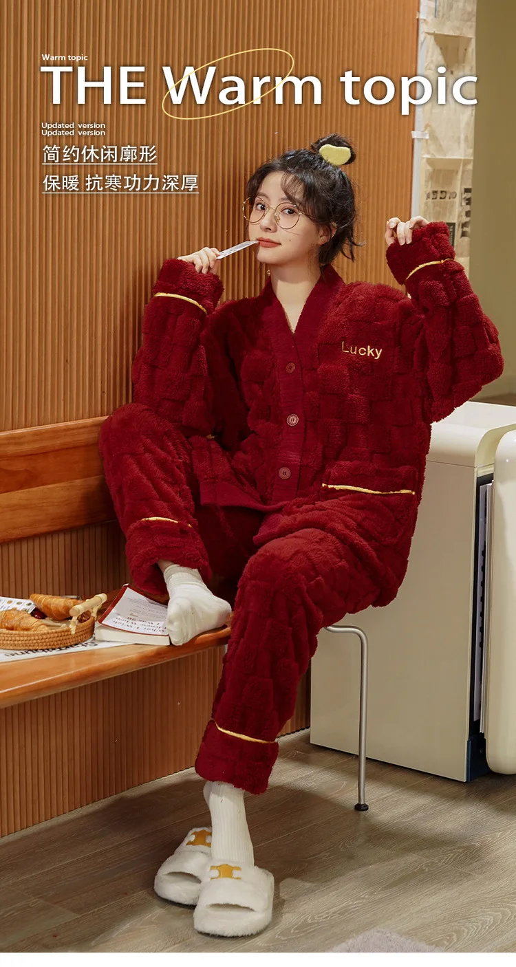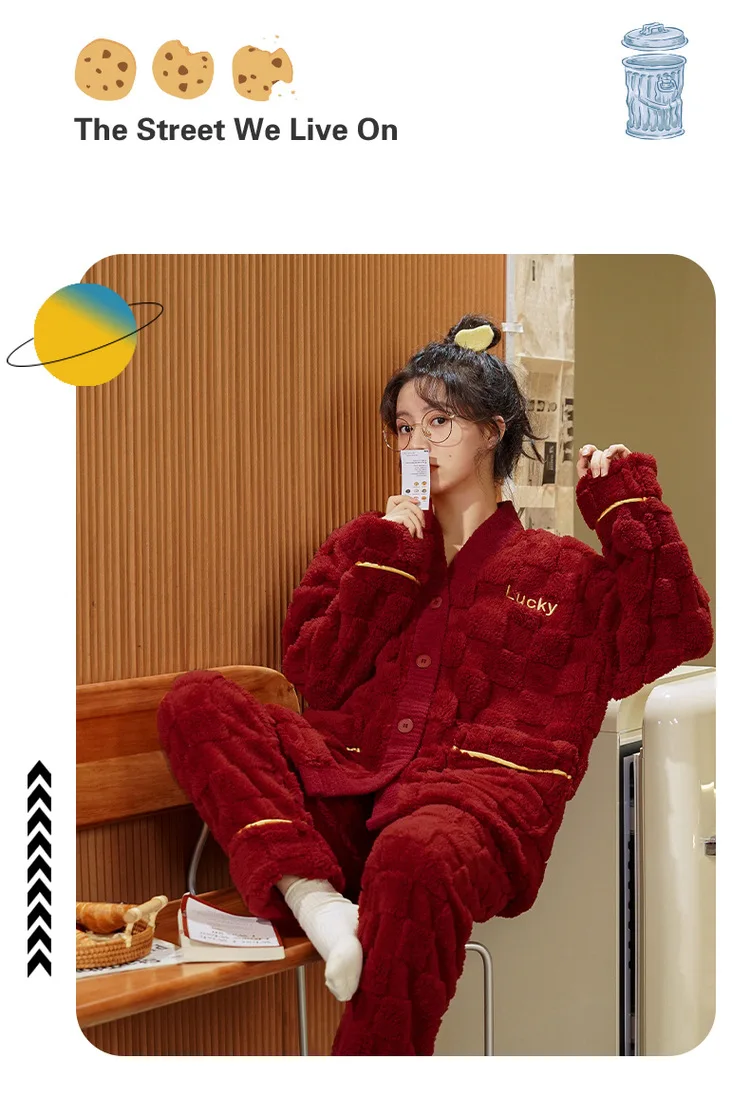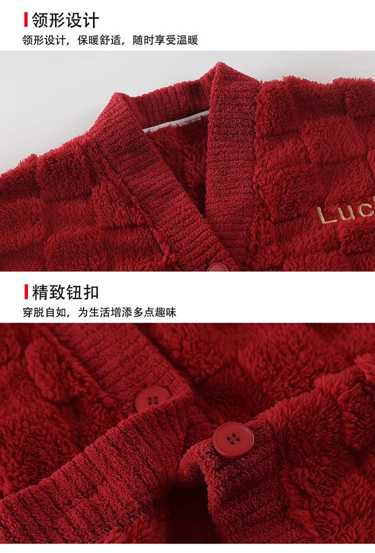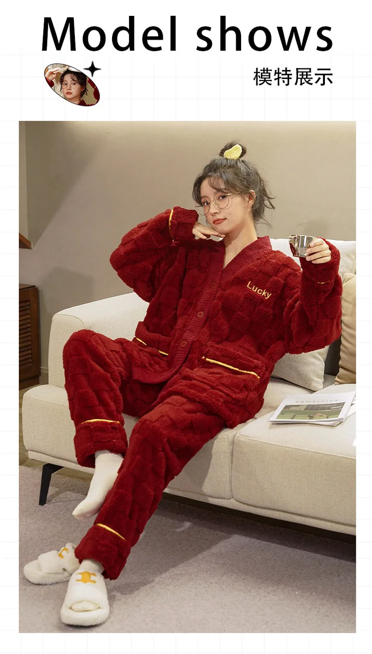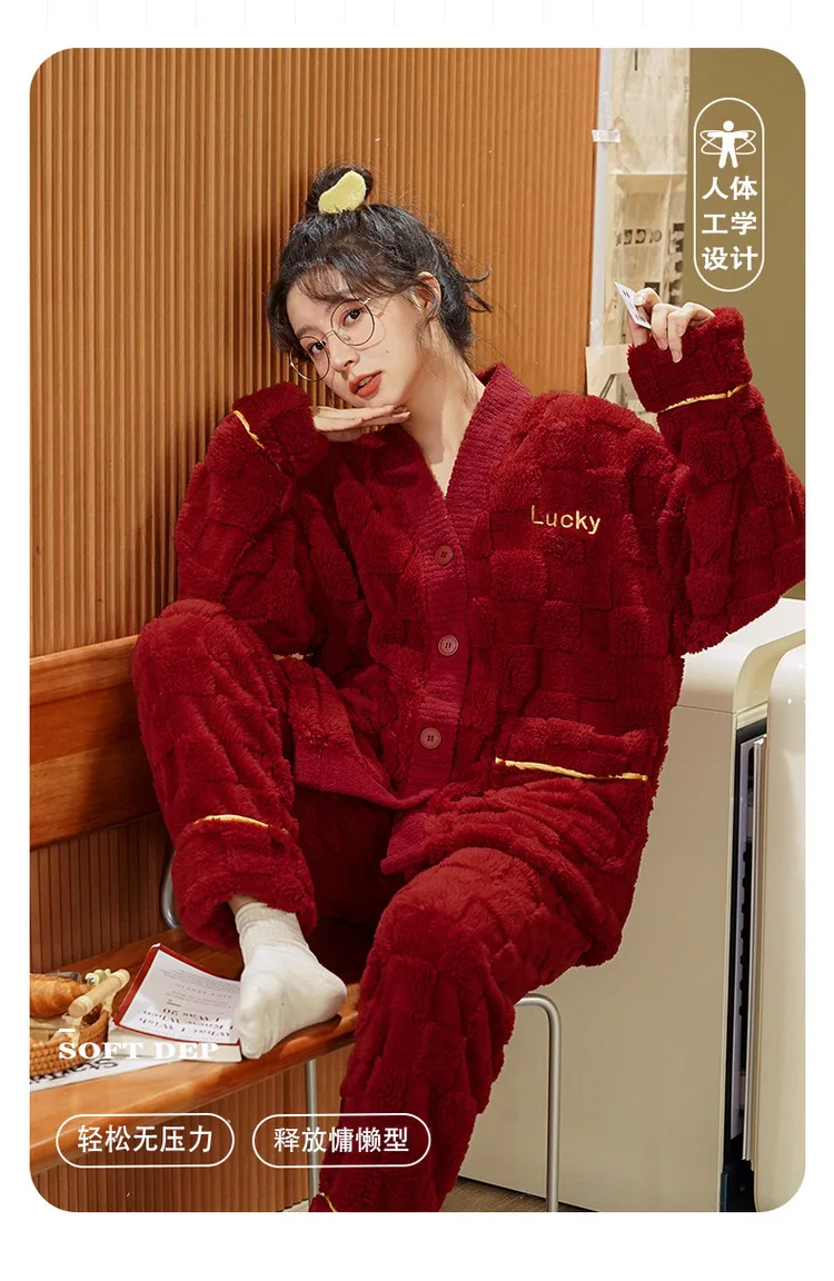 Christmas Pajamas Lucky Big Red Cardigan Buttons Women Winter Long Sleeve Flannel Sleepwear Sexy Women Homewear