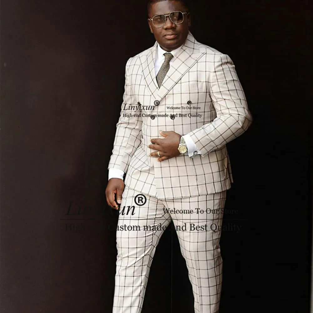 Classic Latest Coat Pant Designs Double Breasted Men's Suits Casual Slim Fit Wedding Blazer Black Check Plaid Tuxedos Jacket