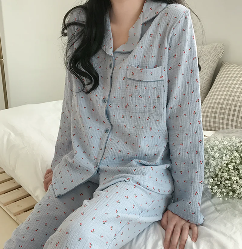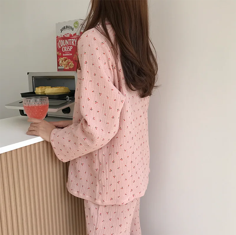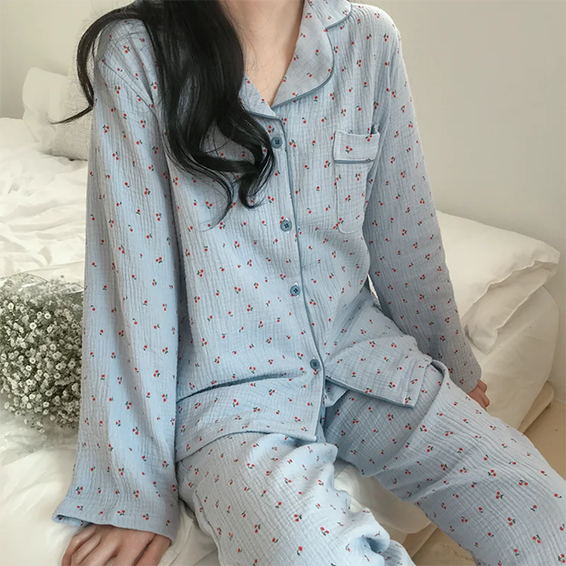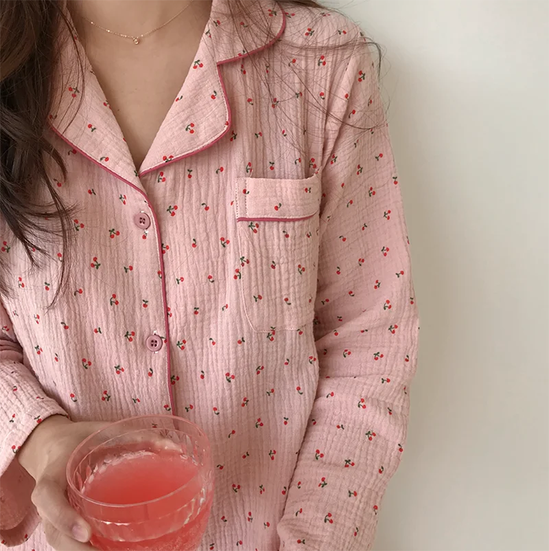 Cotton Linen Sleepwear Set Sweet Cute Cherry Print Pajamas Vintage Kawaii Notched Pocket Home Suit Shirt+Trousers Button S890