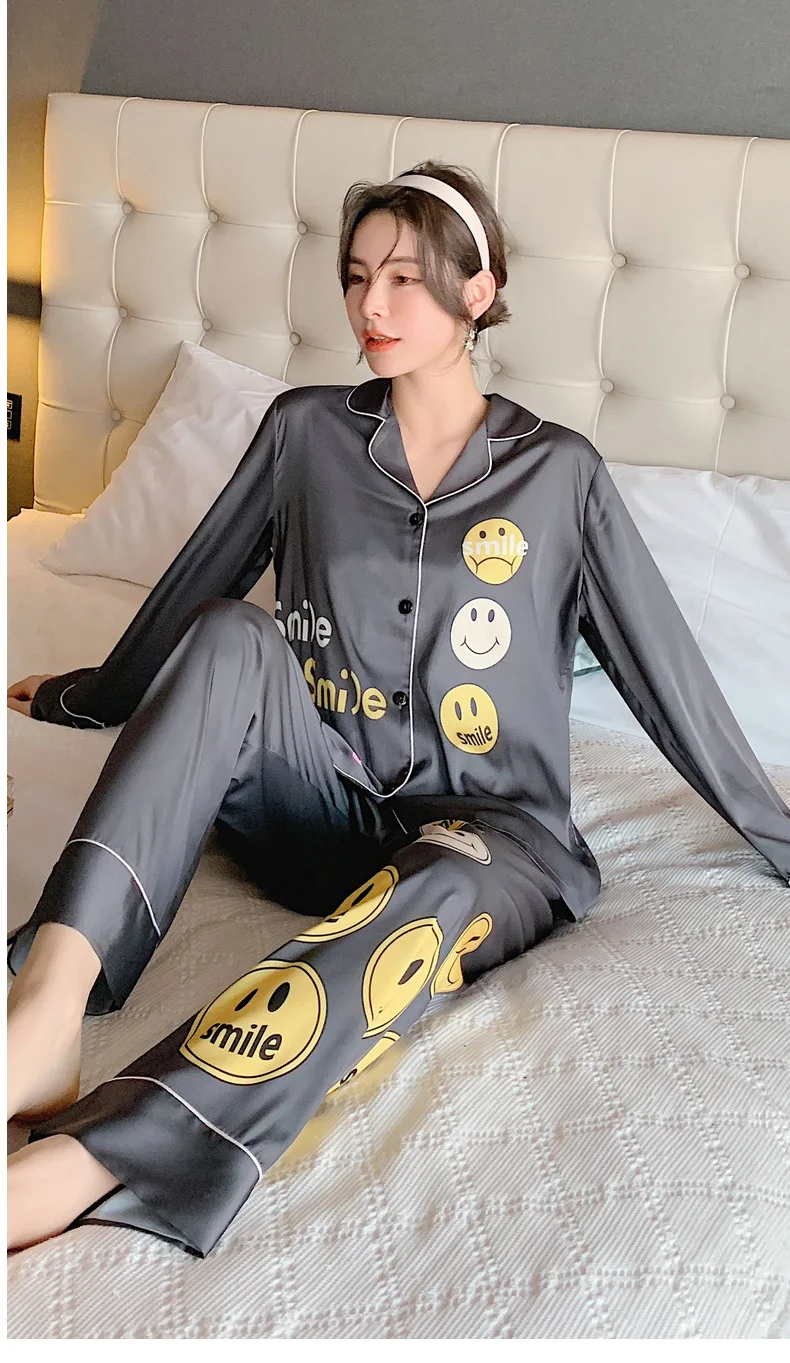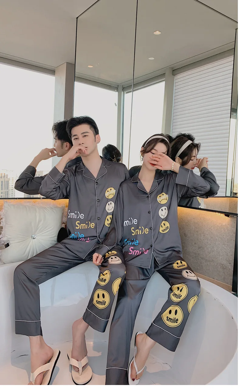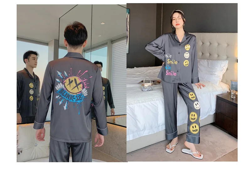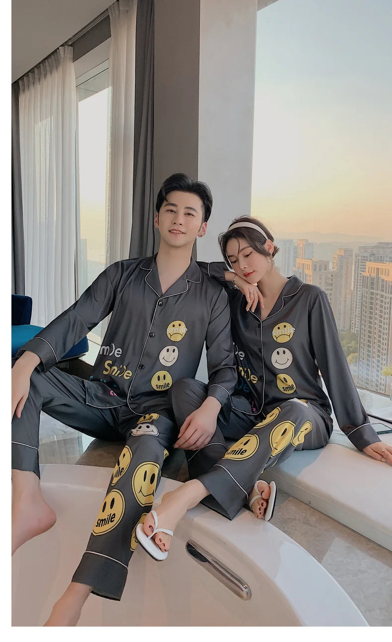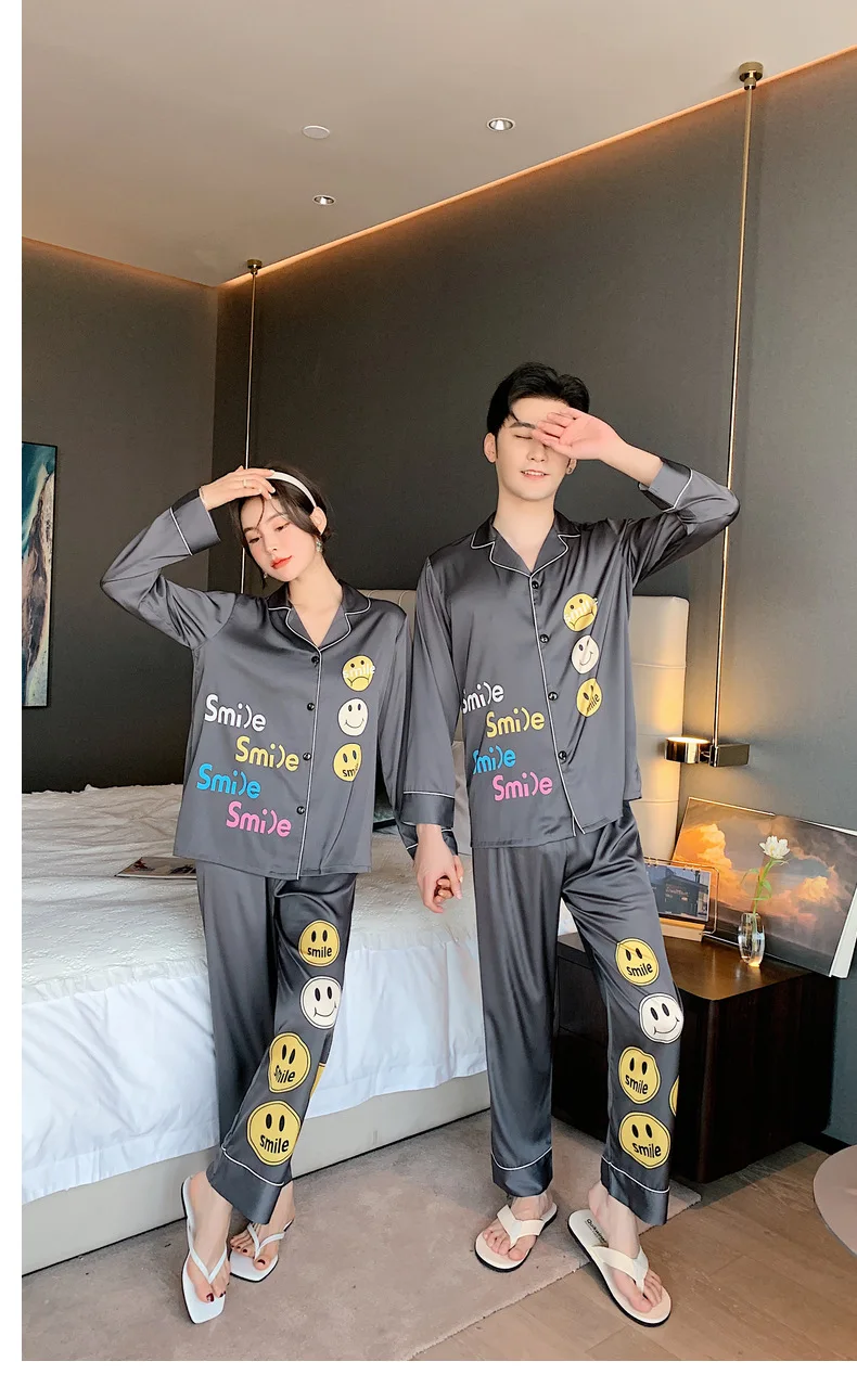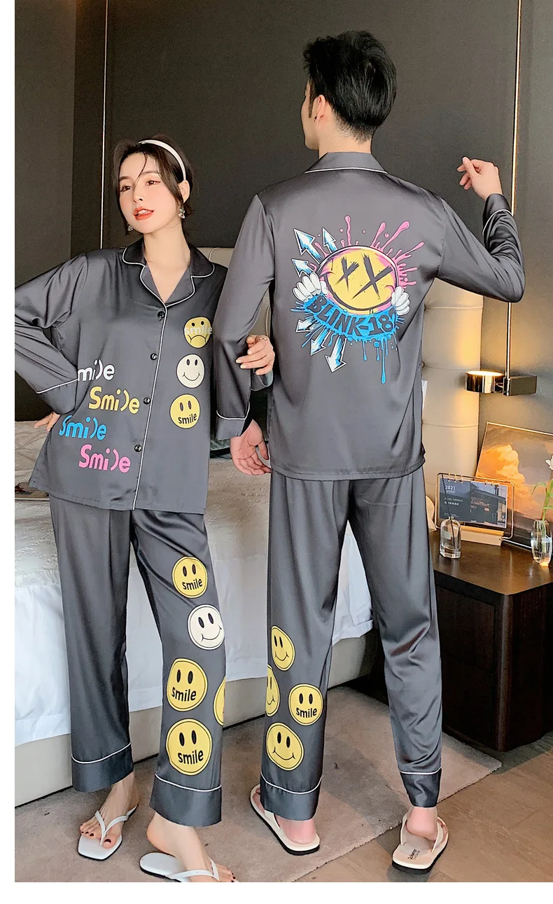 Couple's Home Wear Long Sleeve Thin Smiley Face Printed Artificial Silk Suit Men's and Women's Casual Large Size Pajamas