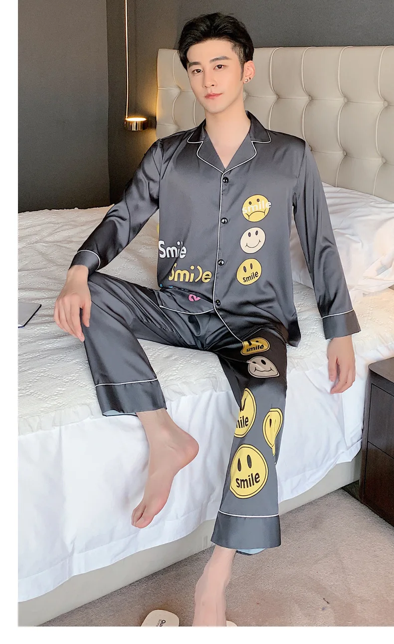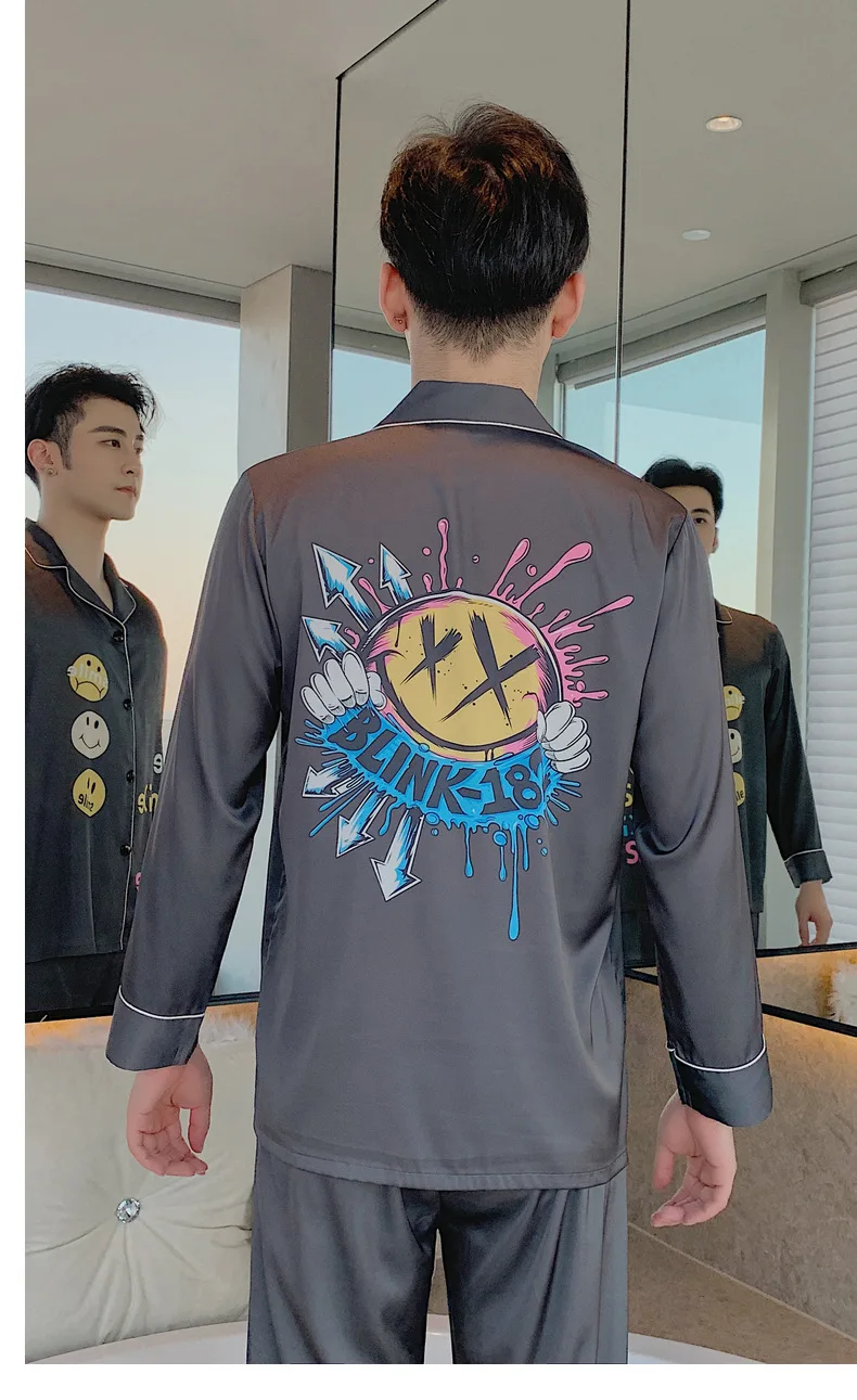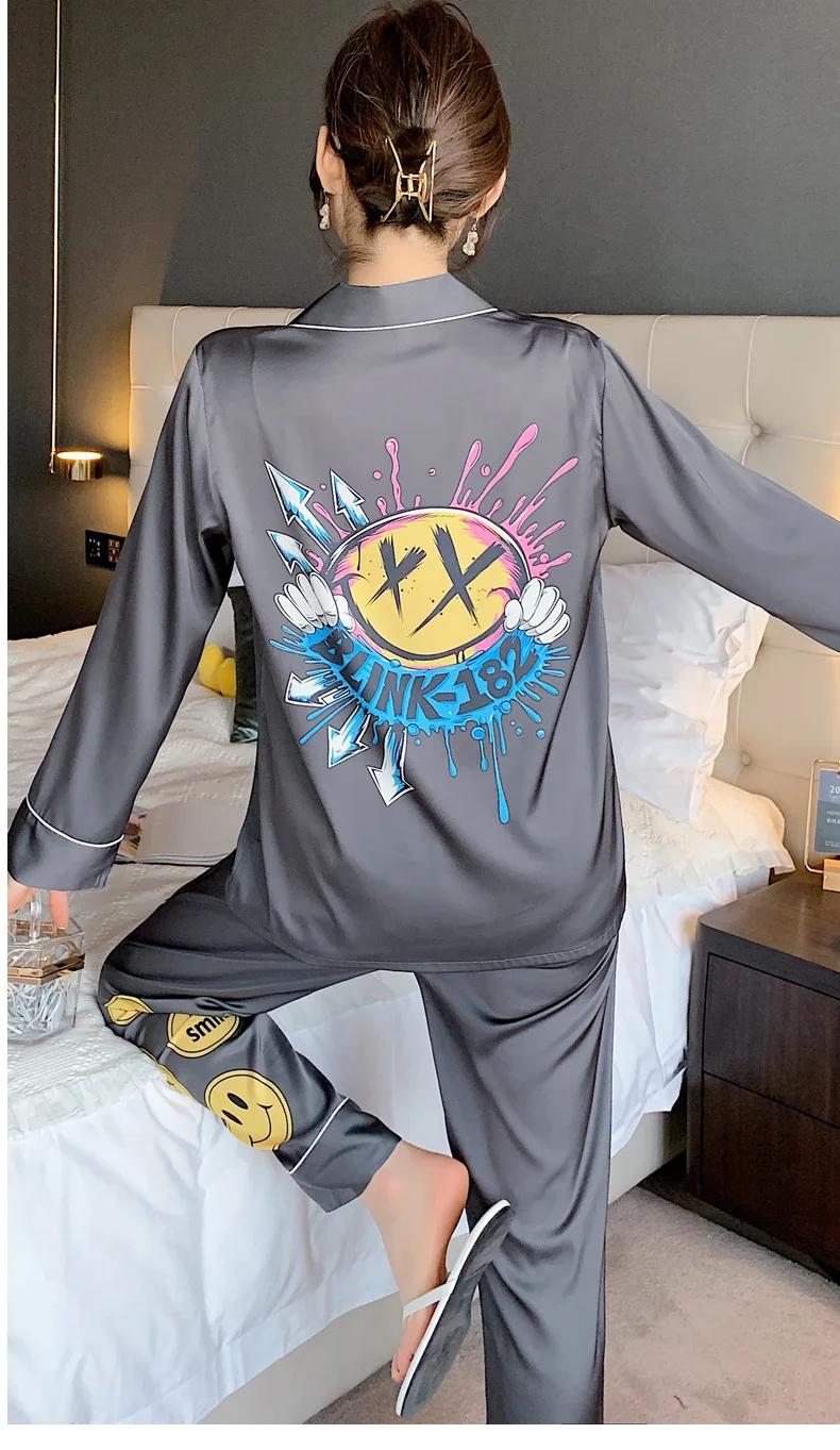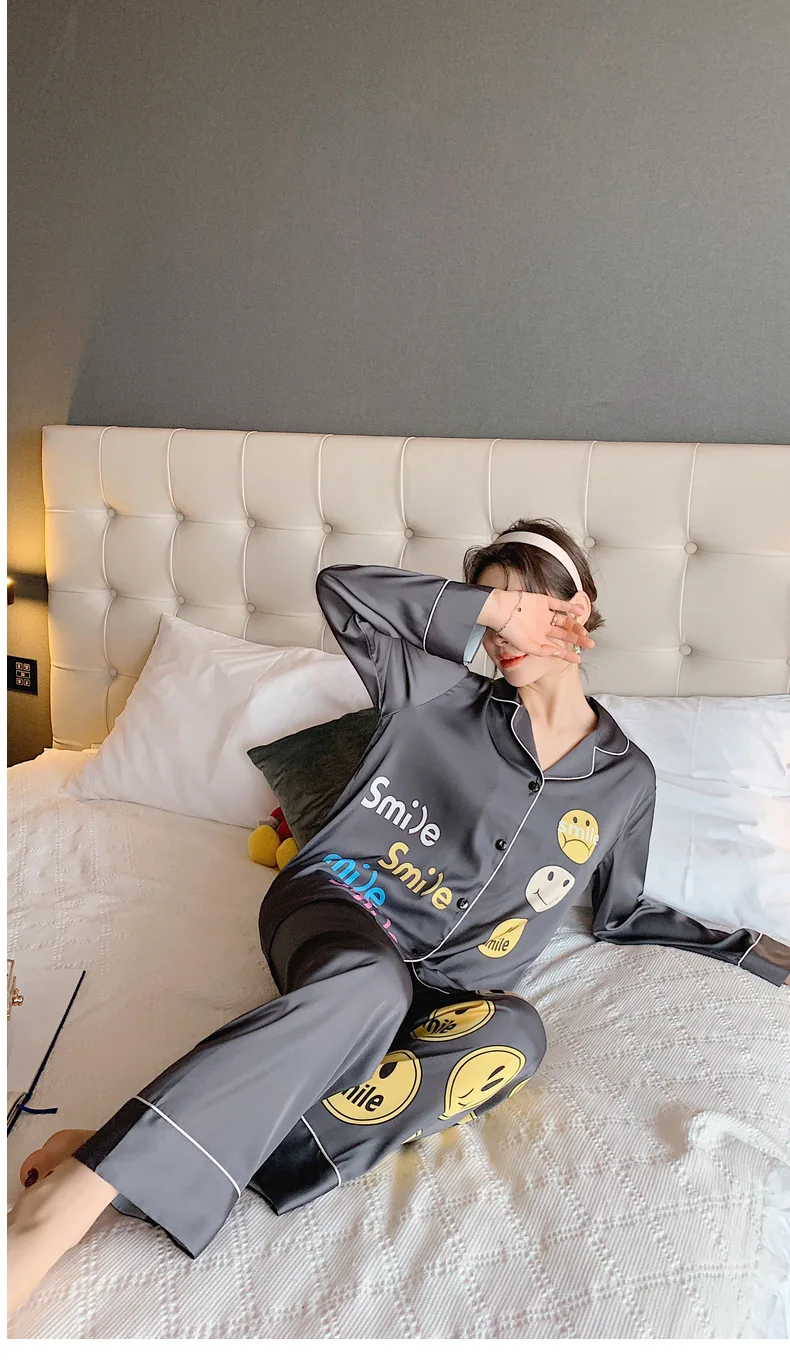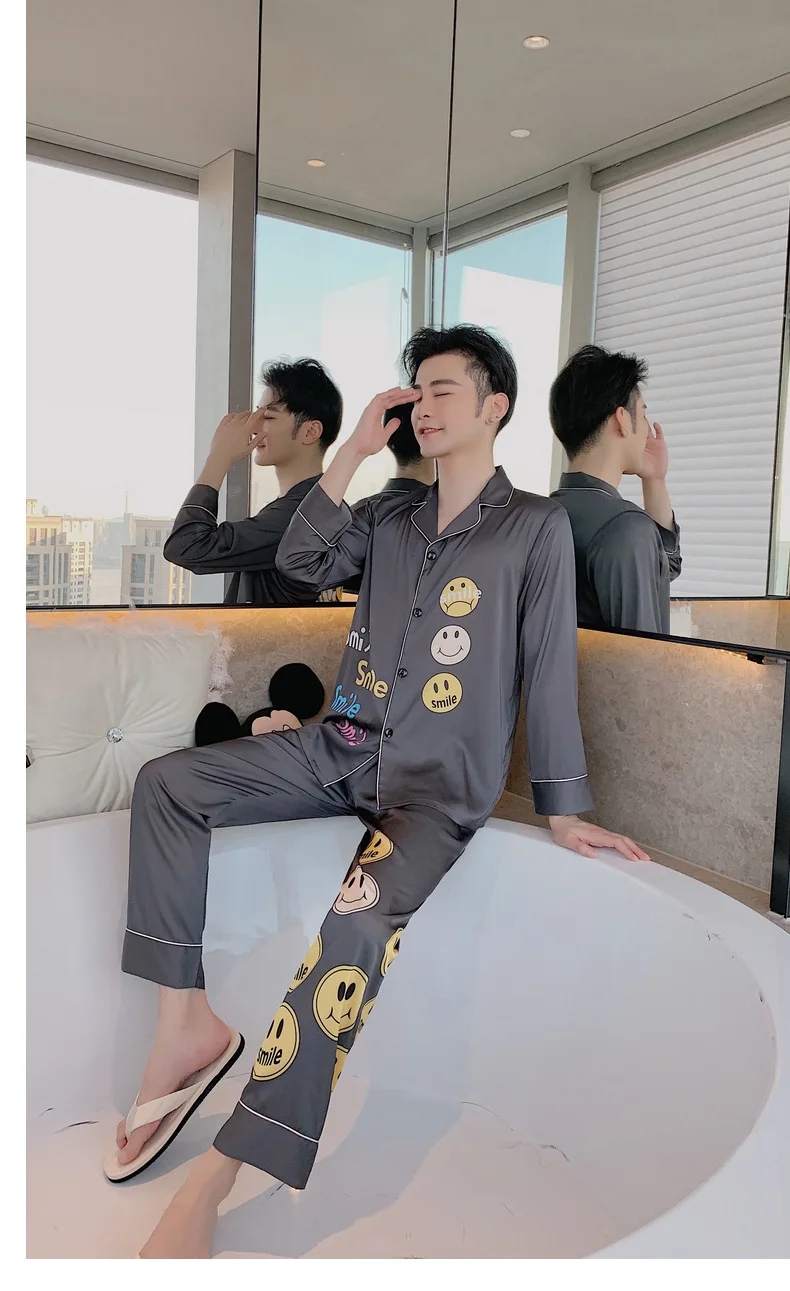 Couple's Home Wear Long Sleeve Thin Smiley Face Printed Artificial Silk Suit Men's and Women's Casual Large Size Pajamas