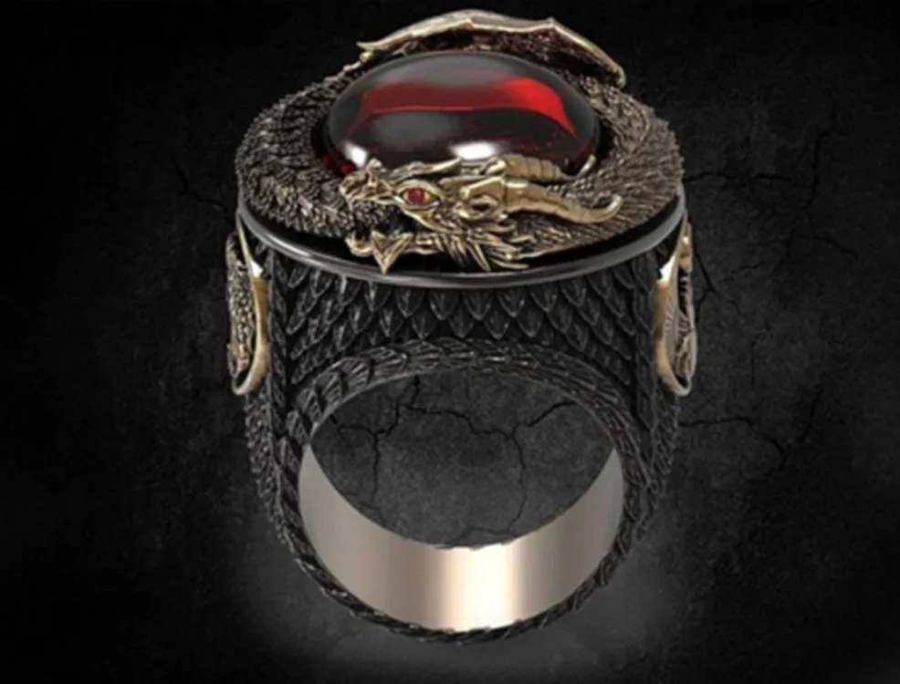 Creative Vintage Domineering Carved Dragon with Inlaid Red Crystal Rings for Men Gothic Steampunk Jewelry Gift