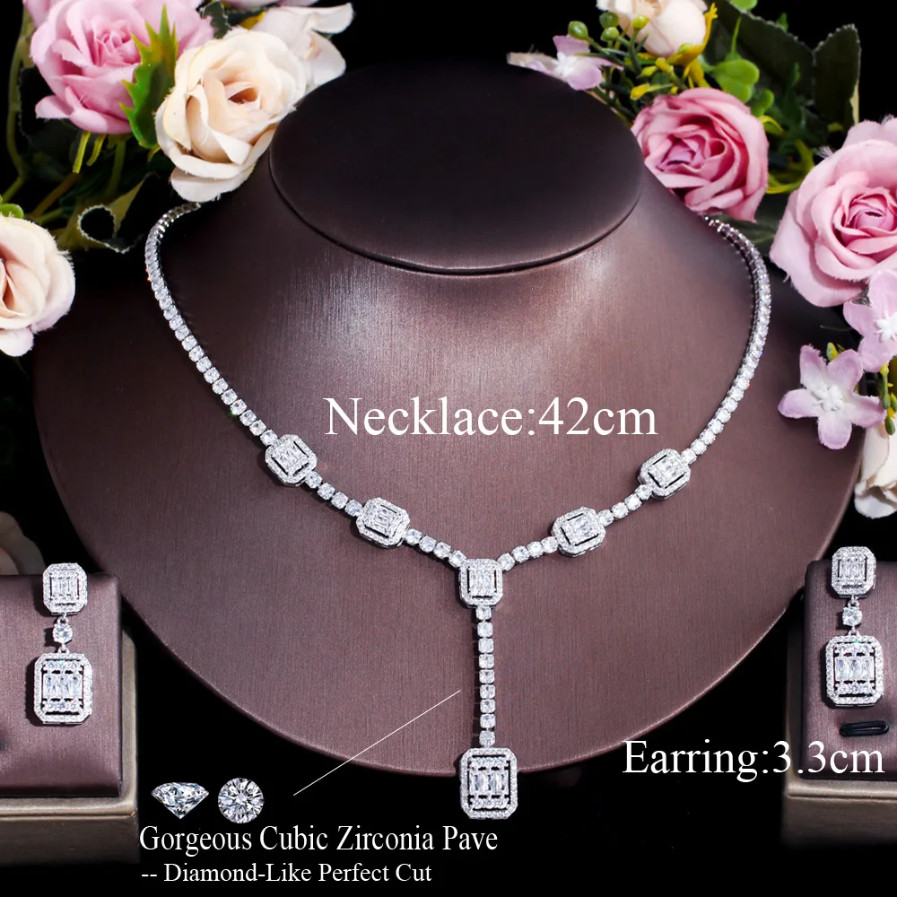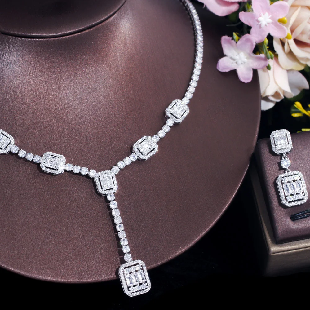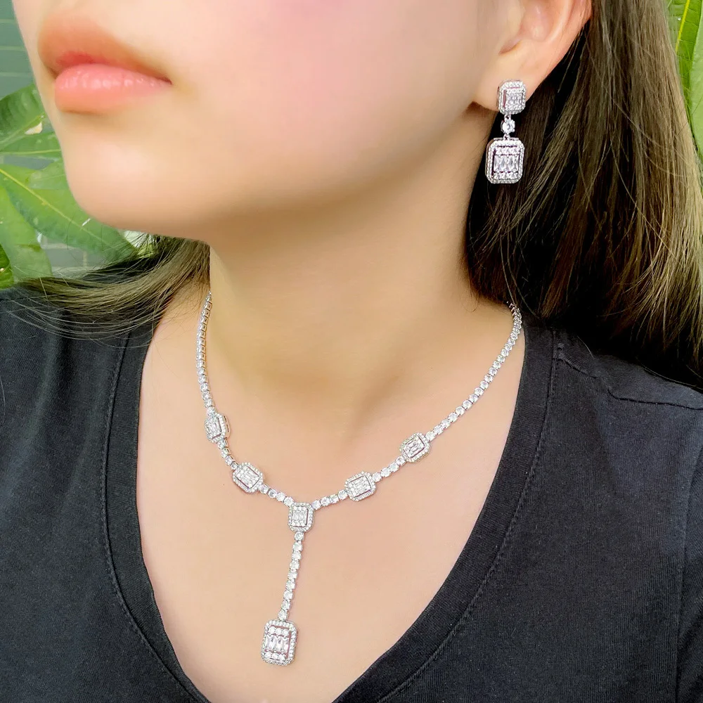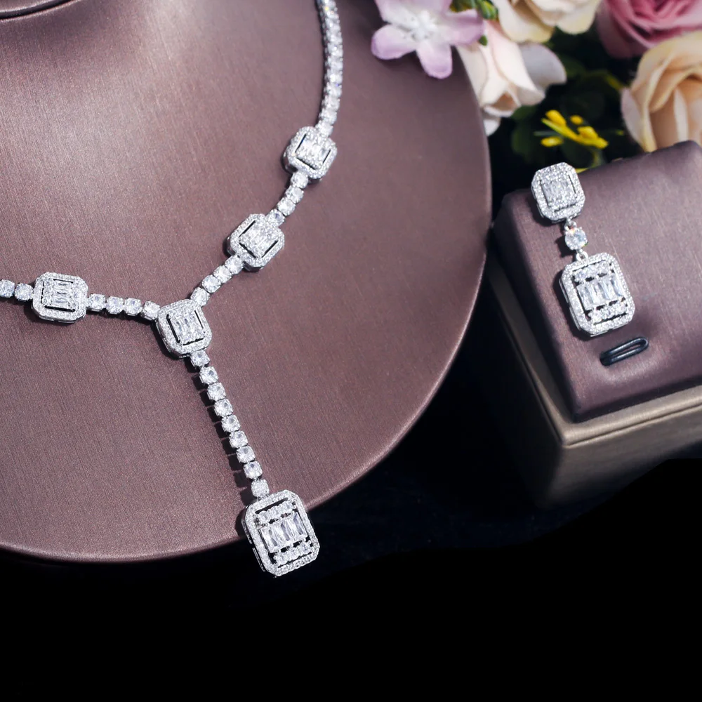 CWWZircons African Baguette CZ Pave Dangle Drop Necklace Earrings Bridal Wedding Cubic Zirconia Jewelry Set for Women T612