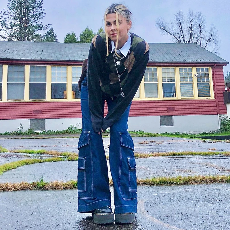 Darlingaga Streetwear Big Pockets Loose Flare Pants High Waist Jeans Casual Solid Cargo Trousers Harajuku Baggy Jeans Denim 2021