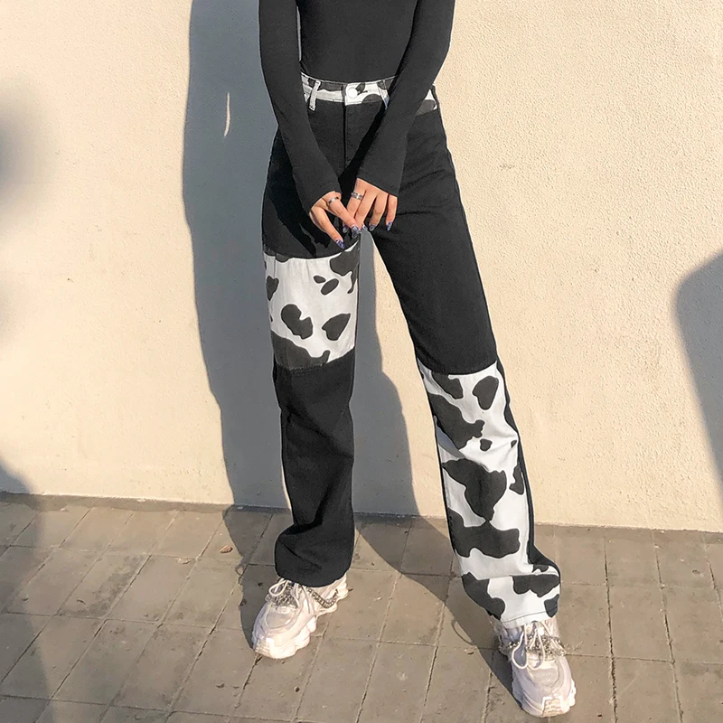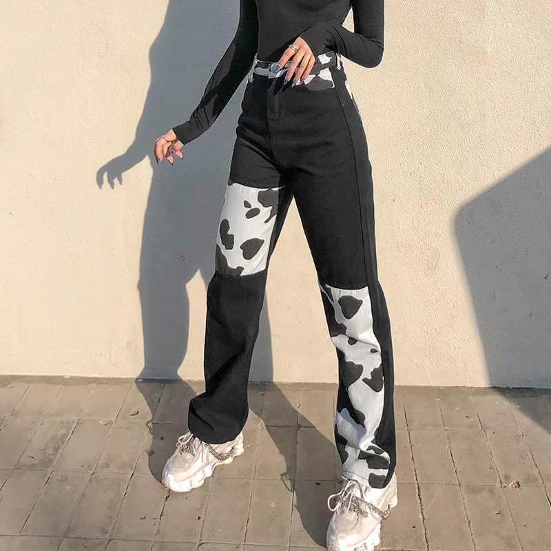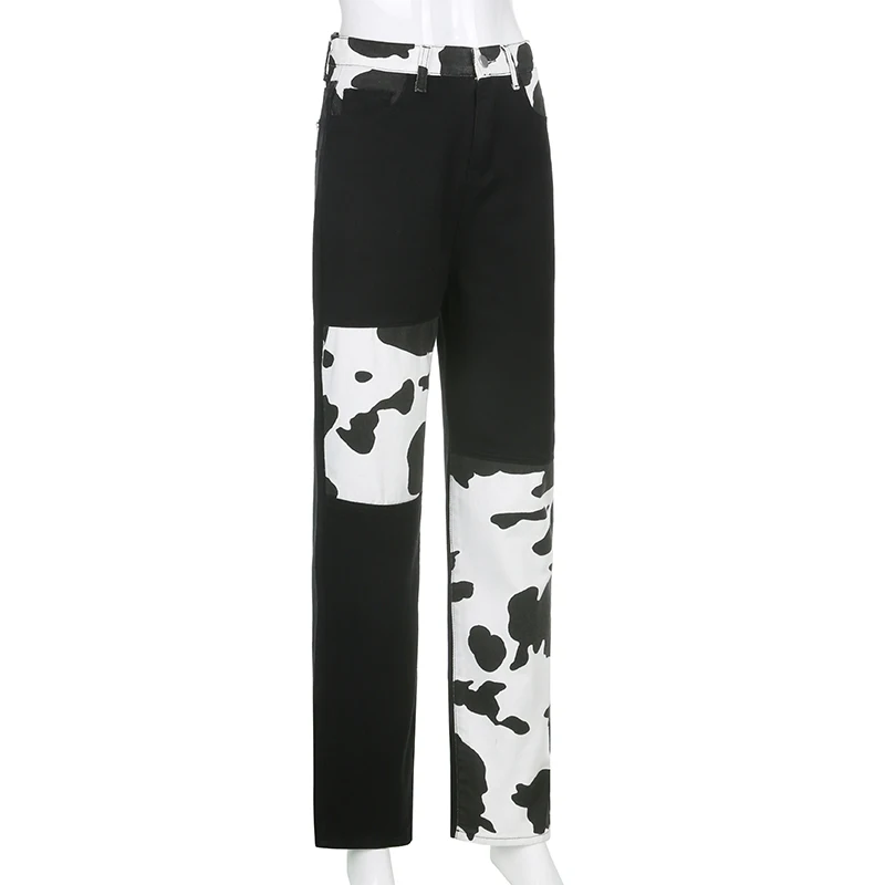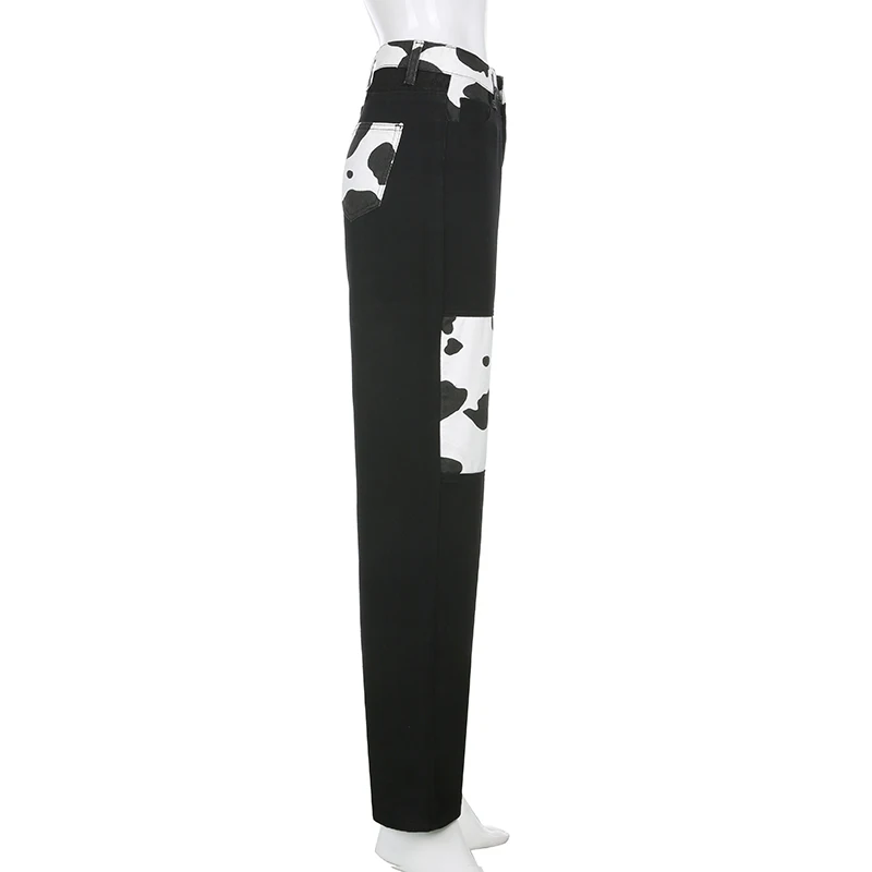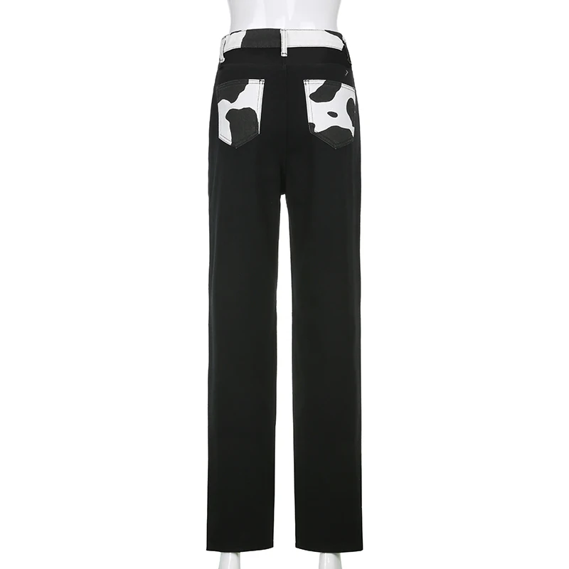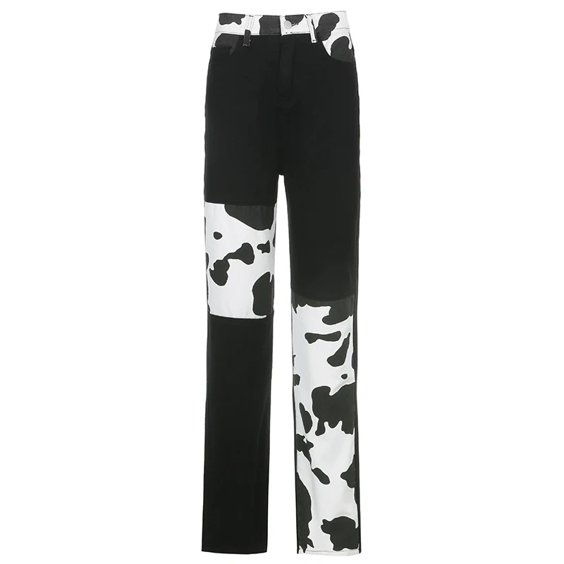 Darlingaga Streetwear Cow Print Y2K Patcahwork High Waist Jeans Straight Slim Woman Pants Vintage Trousers Contrast Color Bottom