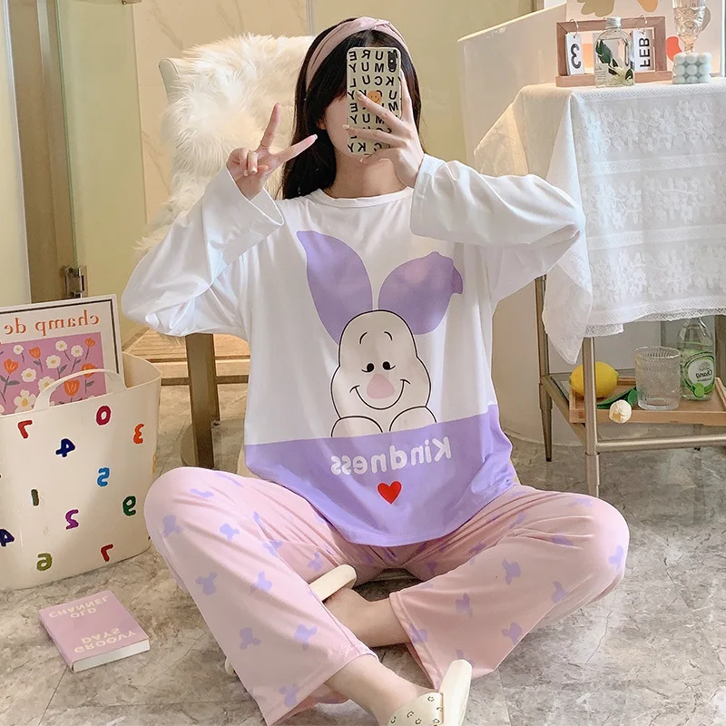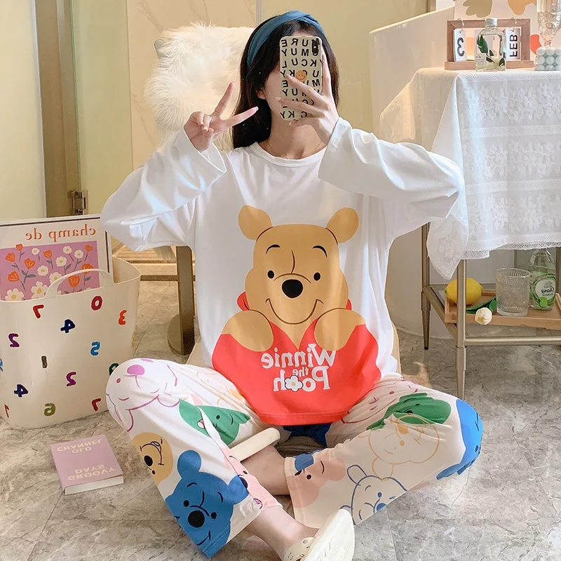 Disney Women's Pajamas Set Cartoon Stitch Pooh Bear Donald Duck Piglet Print Sleepwear Suit Lady Long Sleeve Trousers Tracksuit