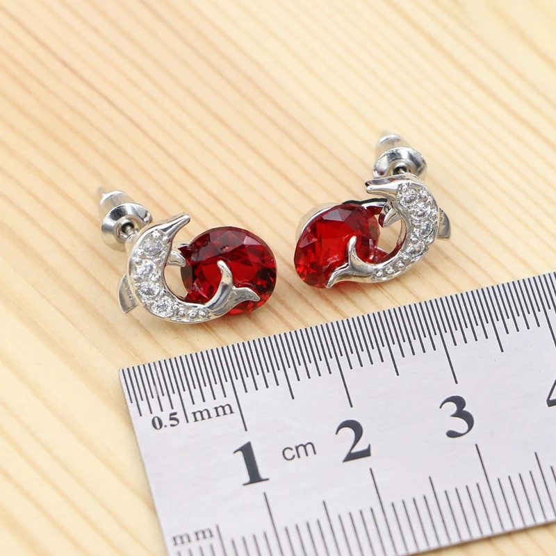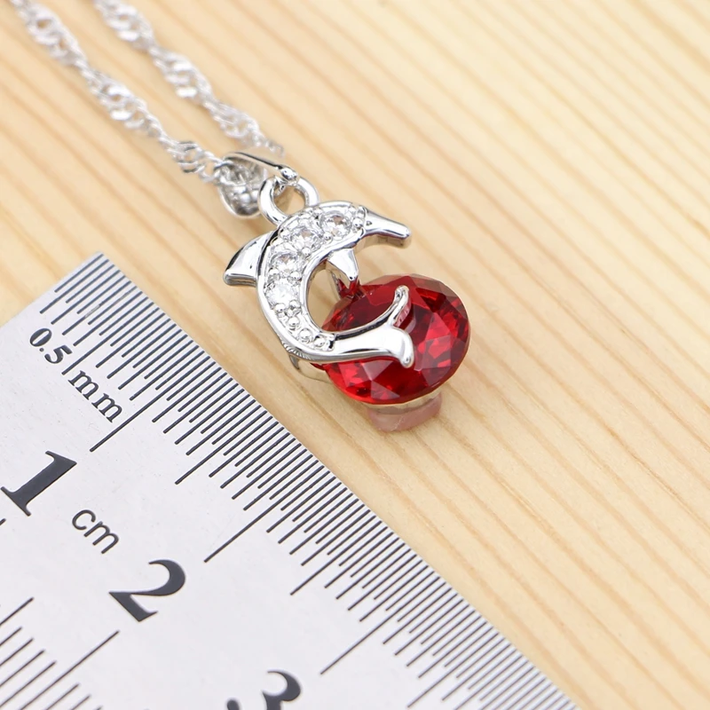 Dolphin 925 Silver Bridal Jewelry Sets for Women Red Cubic Zirconia White Crystal Pendant Necklace Earrings