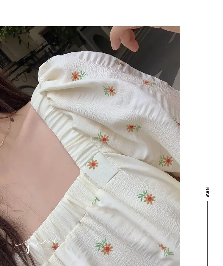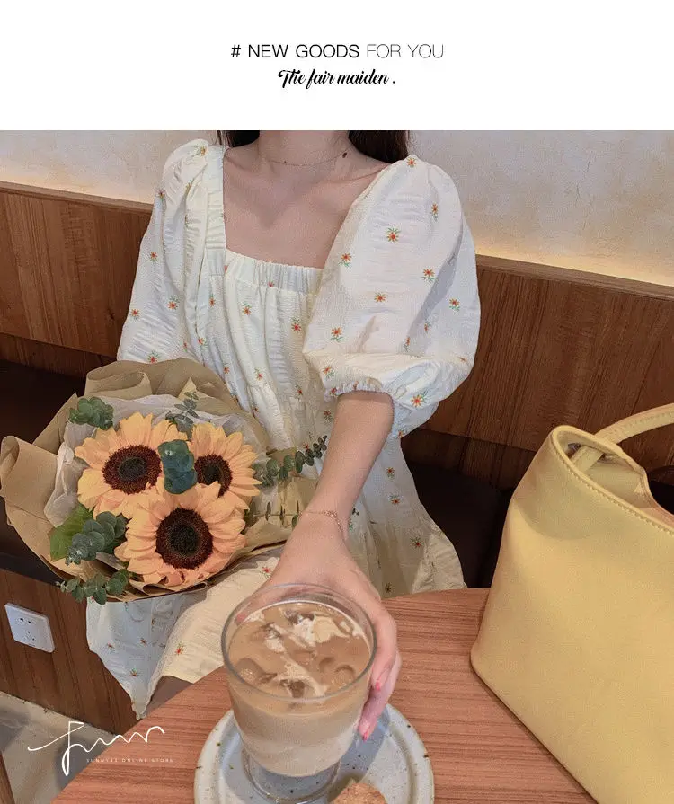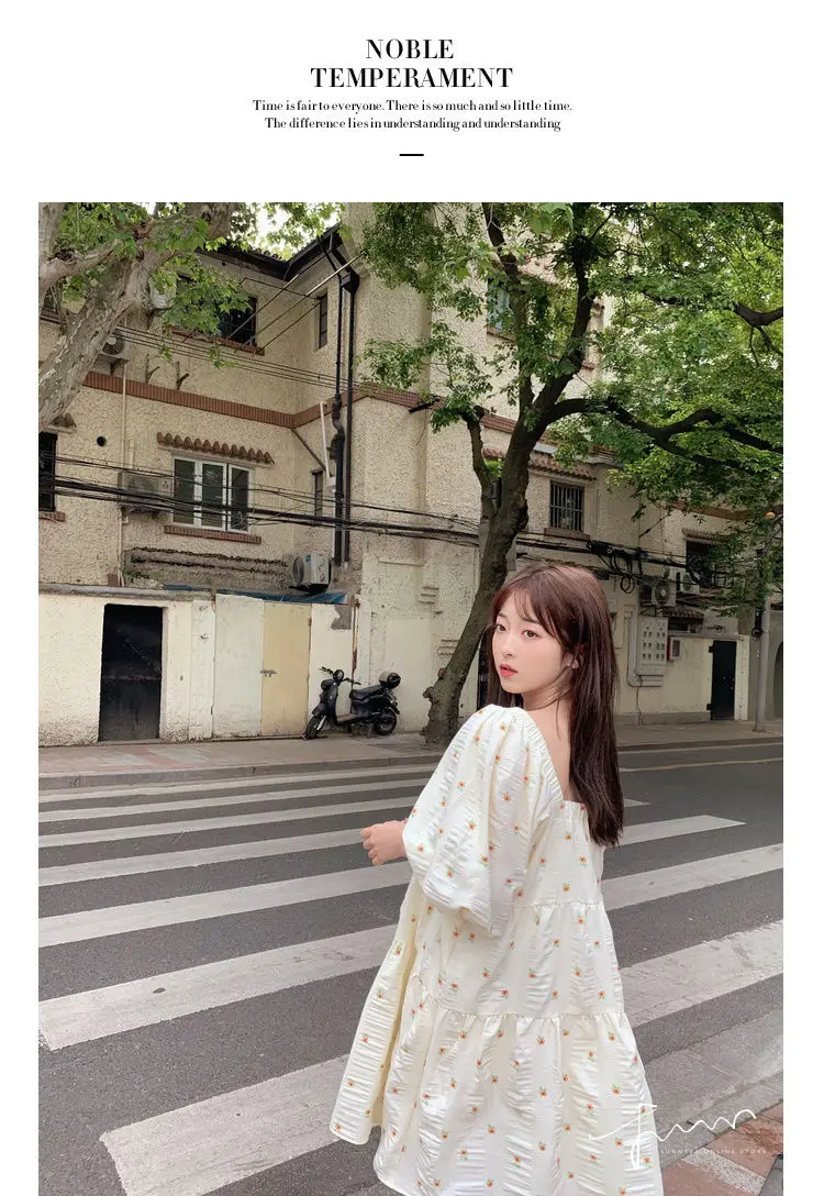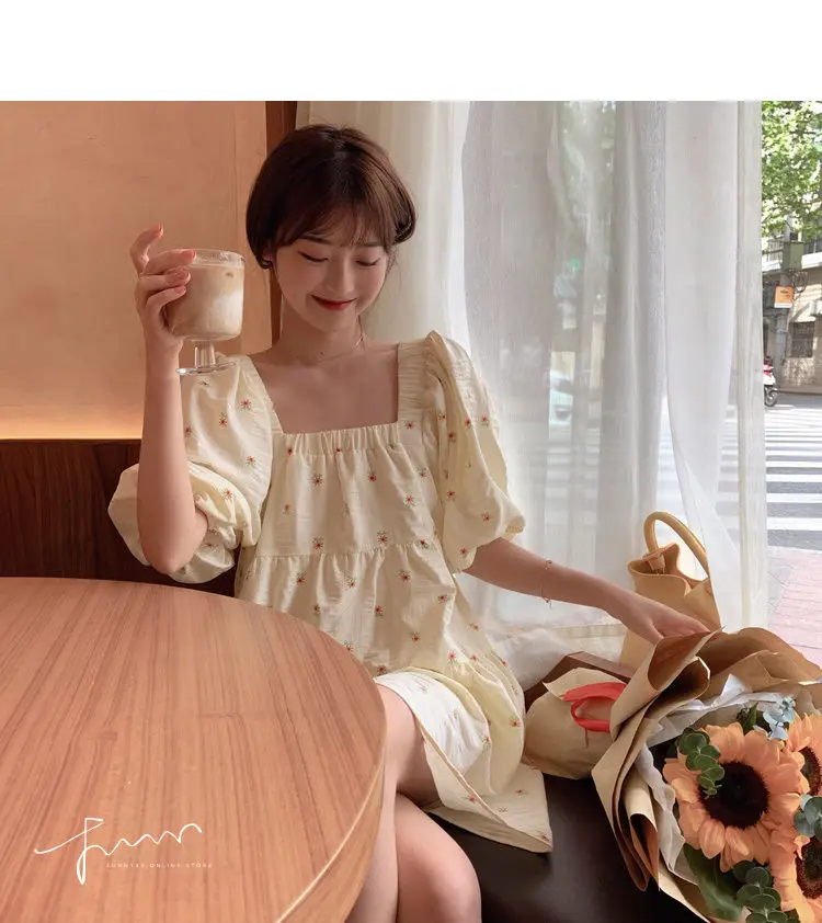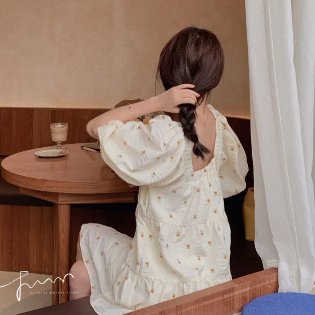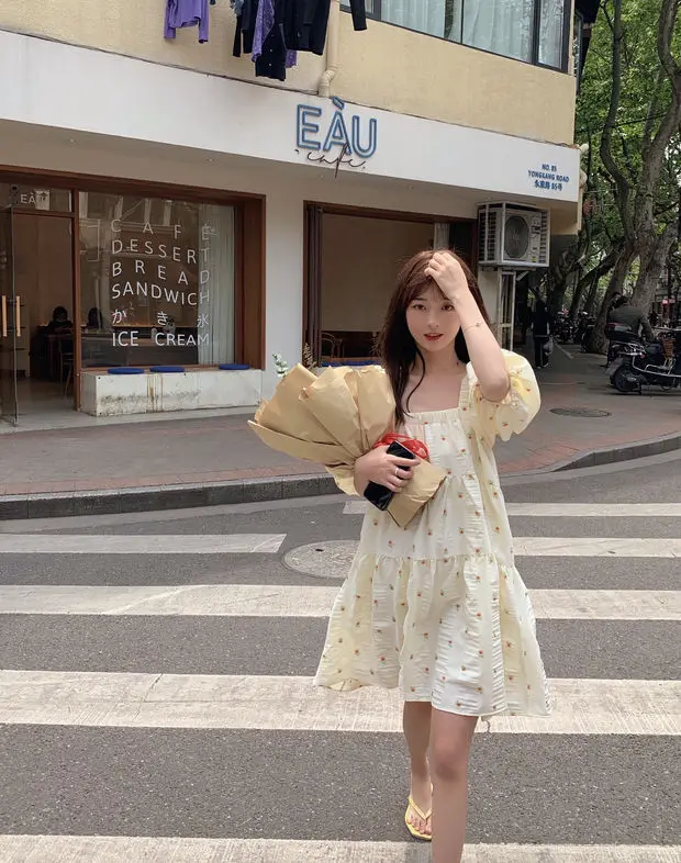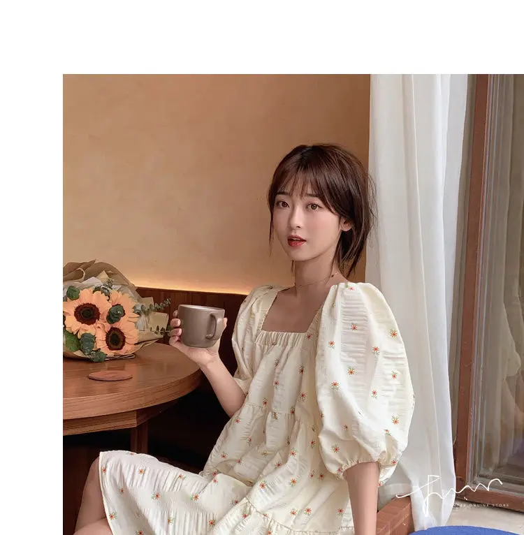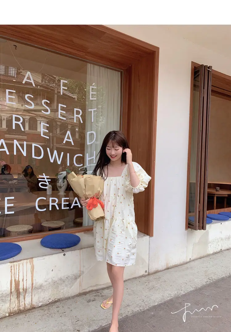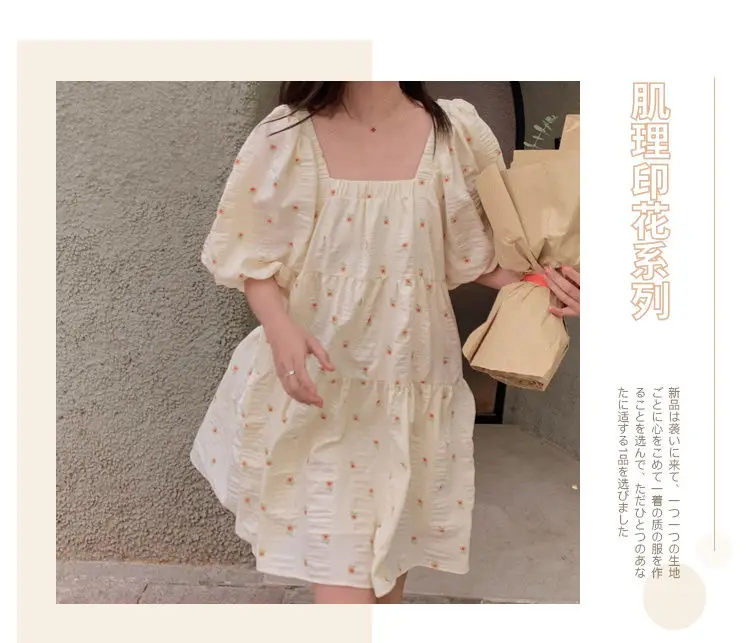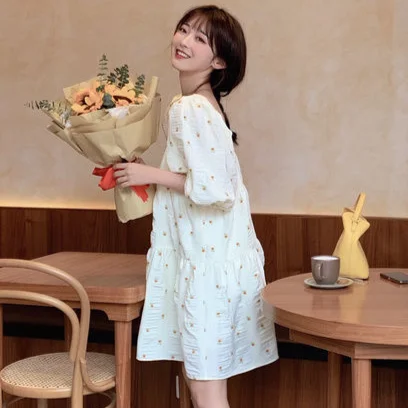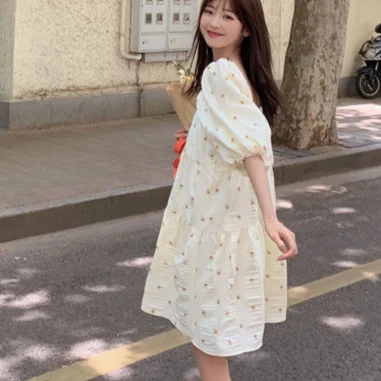 Dress Women Print Puff Sleeve Sweet Student Short Sleeve Korean Version Lovely Stylish Summer Above Knee Empire Loose Vestidos