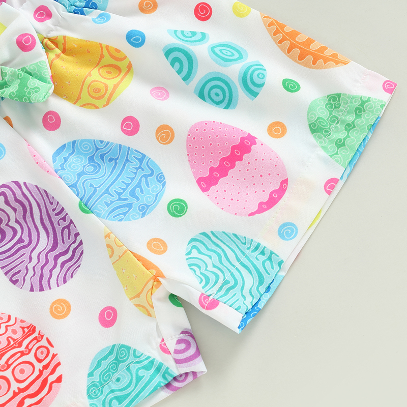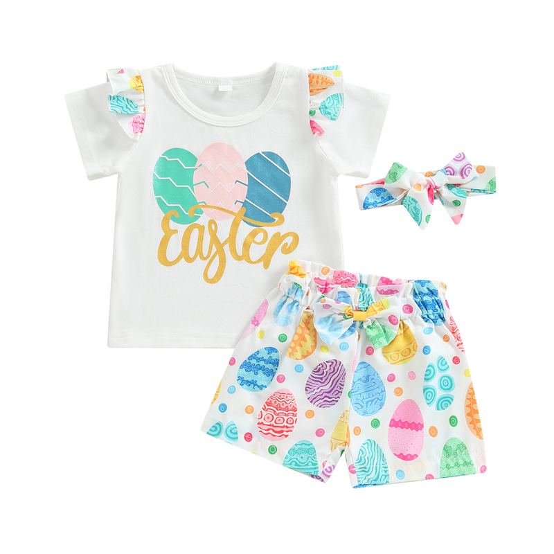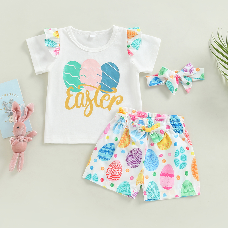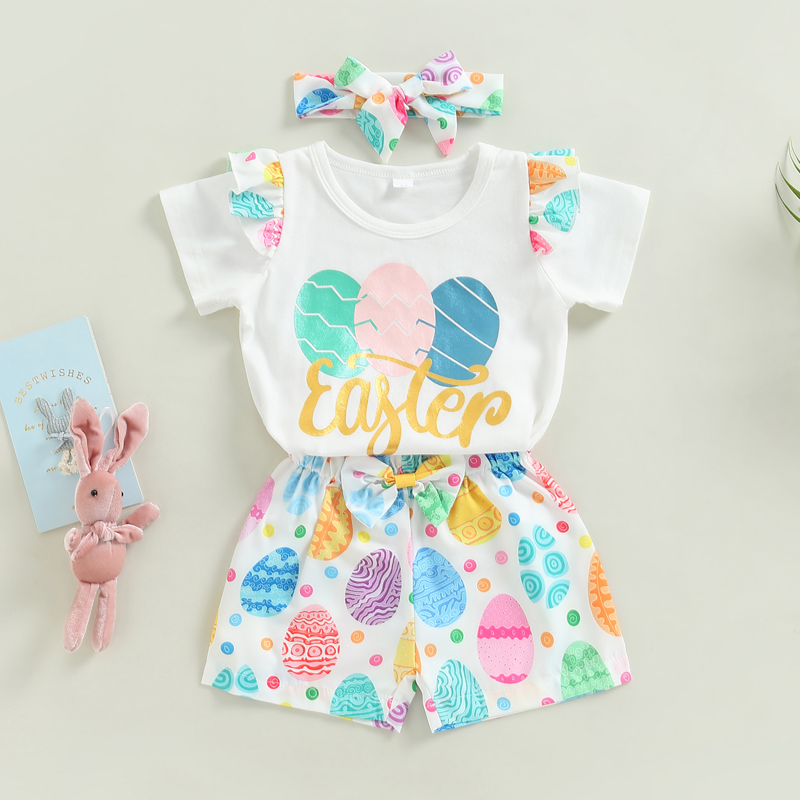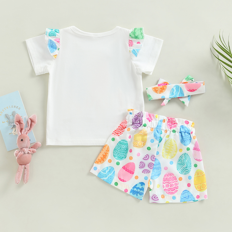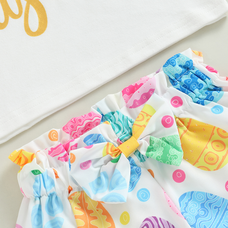 Egg Printed Short Sleeve T-shirt Shorts Bow Headband Set Easter Outfits for Kids Girls