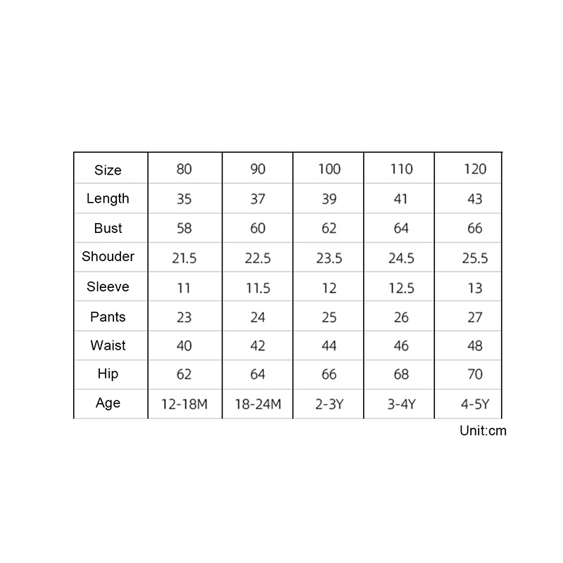 80 Advised Age: 12-18 Months Tops Length: 35 / 13.78 Bust: 58 / 22.83 Shorts Length: 23 / 9.06 Waist: 40 / 15.75
