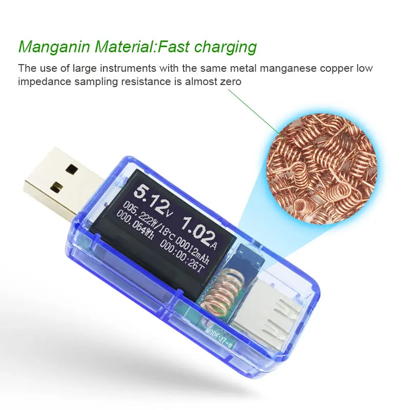 12 in 1 measurement: voltage, current, power, battery capacity, impedance, parameters such as temperature, energy and time,etc. Manganin material: fast charging