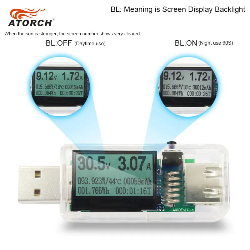 BL: 10S USB tester default backlight time is 10S, 10S automatically turn off screen brightness