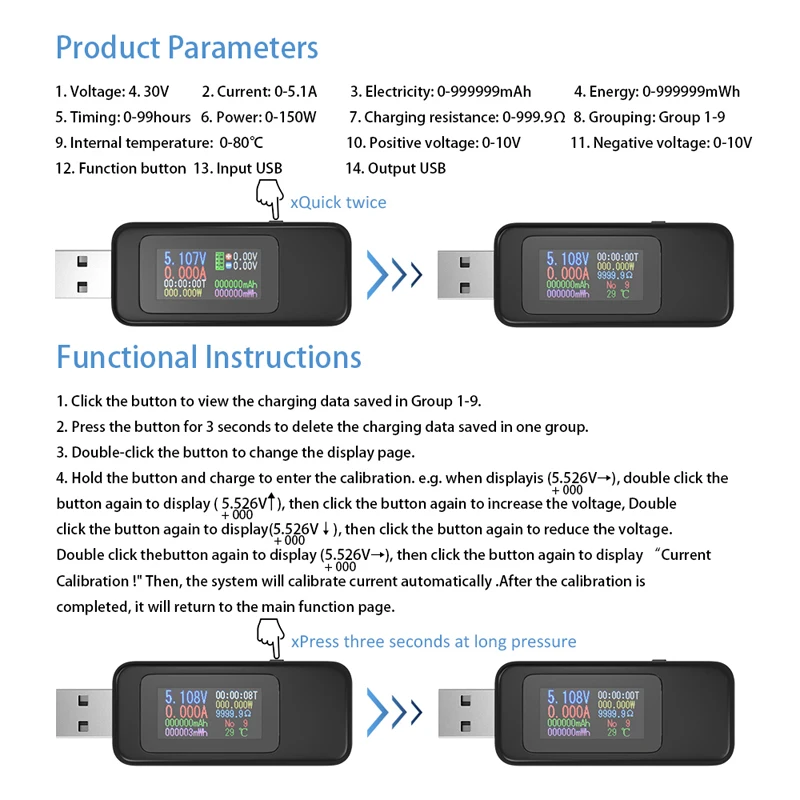 2)When the ambient temperature changes or the outside heat conduction to tester causes the current to not return to zero and the display shows 0.01A or 0.02A or otherwise,PleaseHold on the key buttion then insert to USB Charger It can make the current temperature of the ambient current zero calibration,After the zero can more accurate measurements.And when in Zero calibration,the output can not have any load current consumption, so usb tester display 0.00A