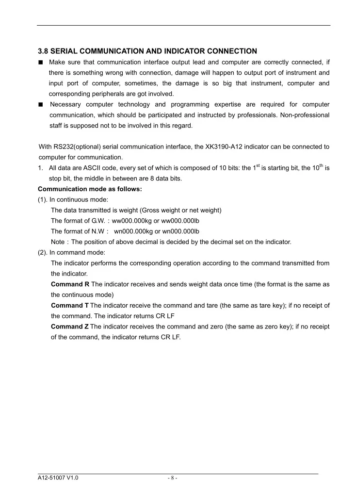 Optional RS-232 communication port, baud rate selectable, optional communication mode;
