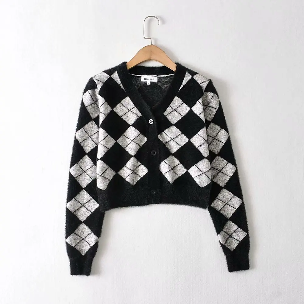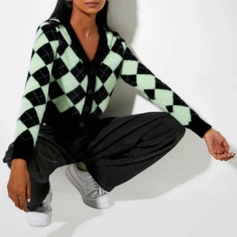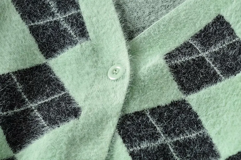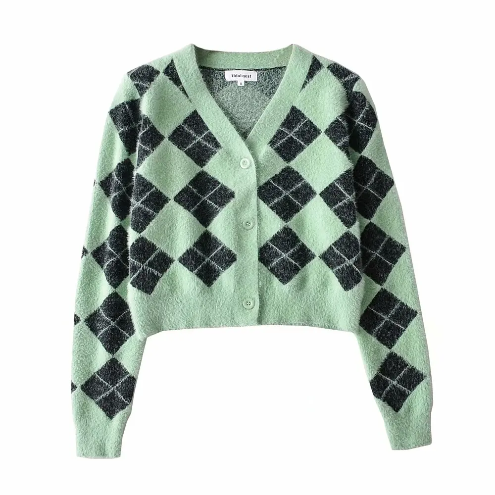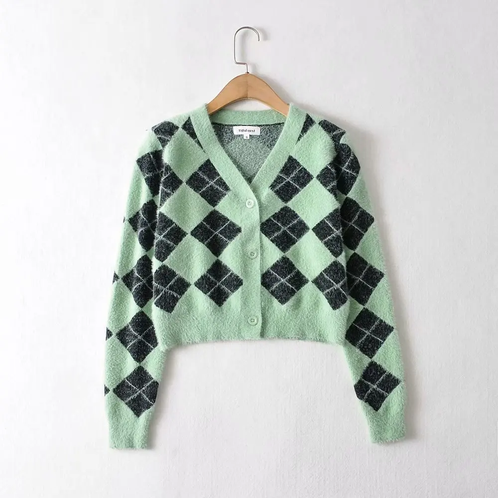 Fall woman sweaters knitted argyle sweater vintage long sleeve crop top cardigan sweater winter tops korean v neck sweater green